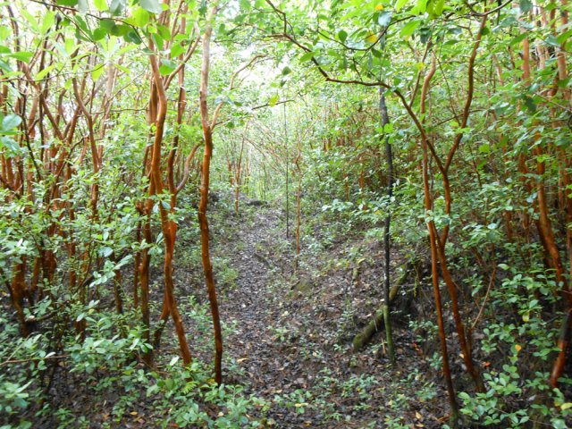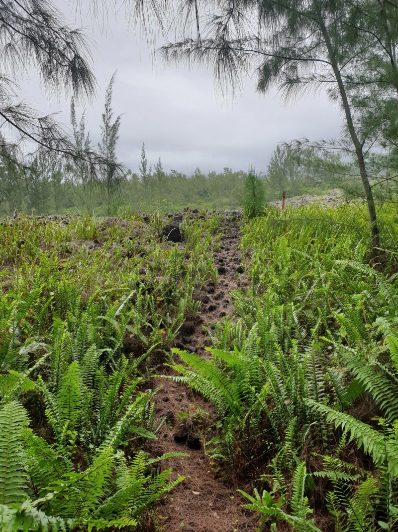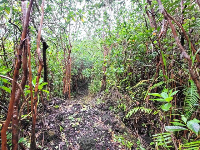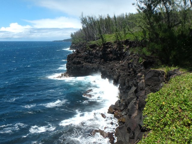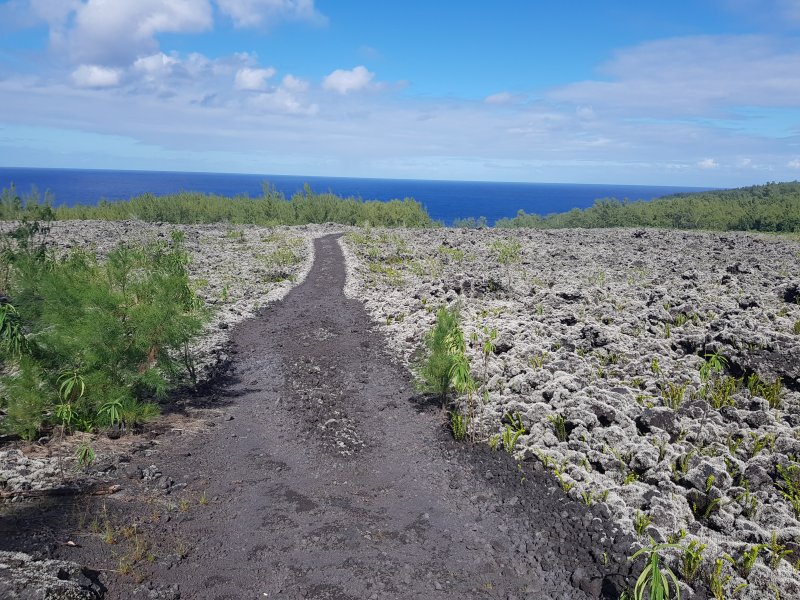 Le Sentier des Laves est enfin accessible à tous depuis la fin d'un magnifique travail d'entretien des équipes de l'ONF. C'est donc le moment de le parcourir du sud au nord ou du nord au sud. Si on manque de temps ou d'entraînement, des portions plus courtes sont possibles d'est en ouest vers le Quai de la Vierge ou en traversant la coulée de 2007. La boucle proposée ici se situe entre les deux précédentes. Contrairement à ces deux parcours, celui-ci ne permet pas de s'approcher des vagues qu'on se contentera d'admirer depuis le haut des falaises à moins de tenter une descente vers le Grand Cap. Il comporte quatre types de cheminement : Un superbe sentier dans les laves de la coulée de 2002 suivi du Sentier des Laves avant de remonter par une piste boisée abandonnée et donc de plus en plus envahie. Elle rejoint la route pour regagner le véhicule en empruntant la route vers le nord. La circulation est assez faible sur la RN2 et la verdure fleurie qui la borde ou les panoramas sur l'Océan permettent de bien supporter ces deux kilomètres de bitume.
