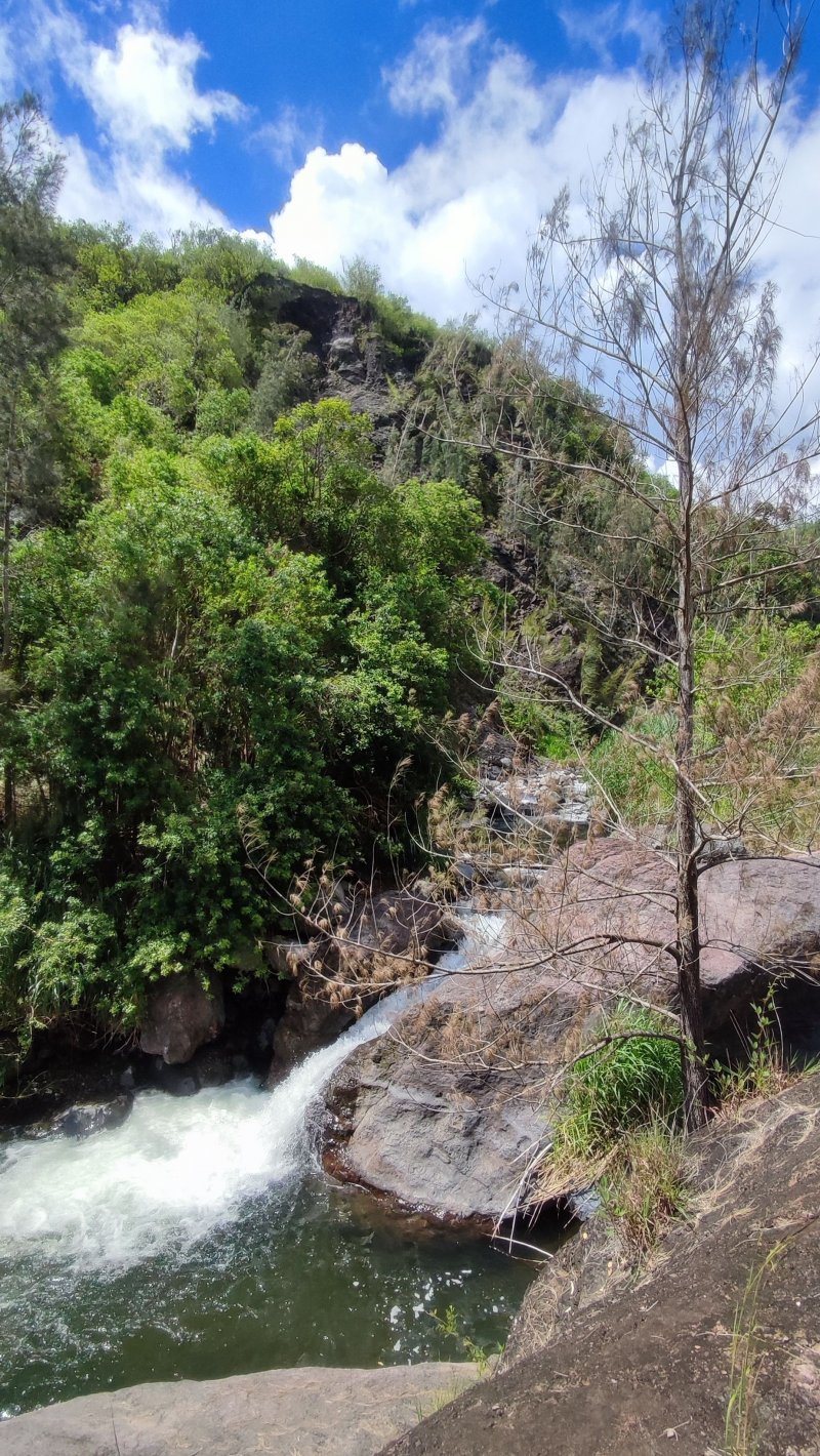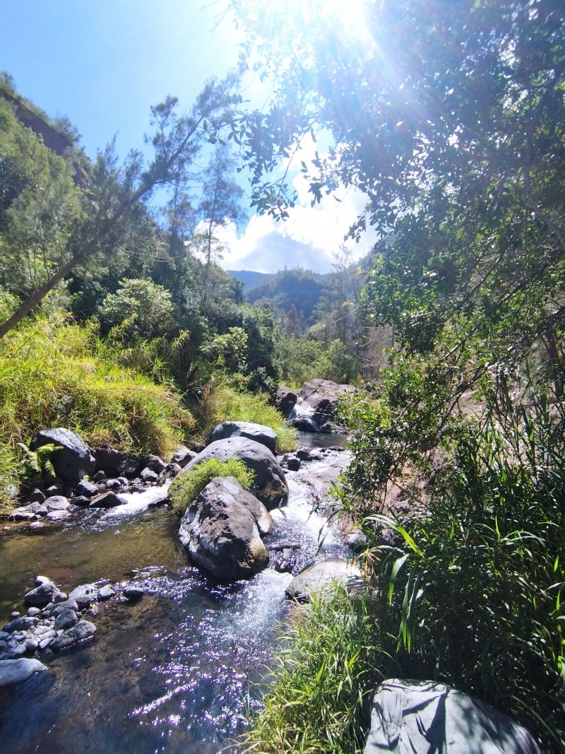 Aujourd'hui nous avons fait cette randonnée depuis le Pavillon jusqu'à Bras sec école en 6 heures sans traîner ! Le sentier dans sa totalité est en bon état. C'est la saison idéale pour l'emprunter. Pas d'herbe trop haute, pas de végétation qui pique, des Grevillea et Jacarandas en grand nombre. Beaucoup de canne fourragère, notamment du côté du petit bras de Cilaos.