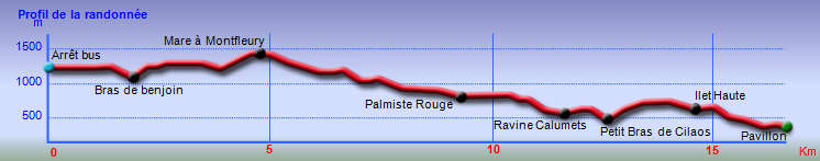 Se rendre au Pavillon, sur la route de Cilaos, et se garer au alentours du gîte - Prendre le bus vers Cilaos et rouler jusqu'au terminus (Cilaos centre) - Trouver le sentier bétonné, près de l'arrêt, qui rejoint la route de la Mare à Joncs et marcher jusqu'au petit lac - Prendre la direction de l'hôpital et retrouver un peu plus loin le Sentier de Bras Sec - Passer le Bras de Benjoin et remonter au village de Bras Sec - Prendre la route de droite et rejoindre la D241 - Prendre à droite vers Gueule Rouge et bifurquer à gauche au sentier du Bonnet de Prêtre - Monter vers la Mare à Montfleury et marcher entre le Rempart des Calumets et le Bonnet de Prêtre - Descendre vers Palmiste Rouge en laissant à gauche le Sentier de Gueule Rouge - Traverser le village de Palmiste Rouge jusqu'à la Ravine Morel puis prendre immédiatement à gauche la première petite rue - Marcher jusqu'au cul de sac et trouver dans les herbes le sentier qui longe les clôtures et murettes pour plonger vers les champs puis vers la Bras des Calumets - Poursuivre vers le Petit Bras de Cilaos et le sentier de Peter Both qu'on laisse sur la droite - Continuer jusqu'au gué qui franchit le Petit Bras de Cilaos et attaquer la pente qui mène sur les plateaux de l'Îlet Haut - Passer les maisons isolées puis le gîte puis redescendre vers le Pavillon - Au bas de la pente prendre à droite le nouveau sentier créé en 2013 puis franchir le gué  - Poursuivre de l'autre côté par quelques lacets qui amènent à la route de Cilaos - A la route, bifurquer à gauche et arriver au Pavillon puis au véhicule.