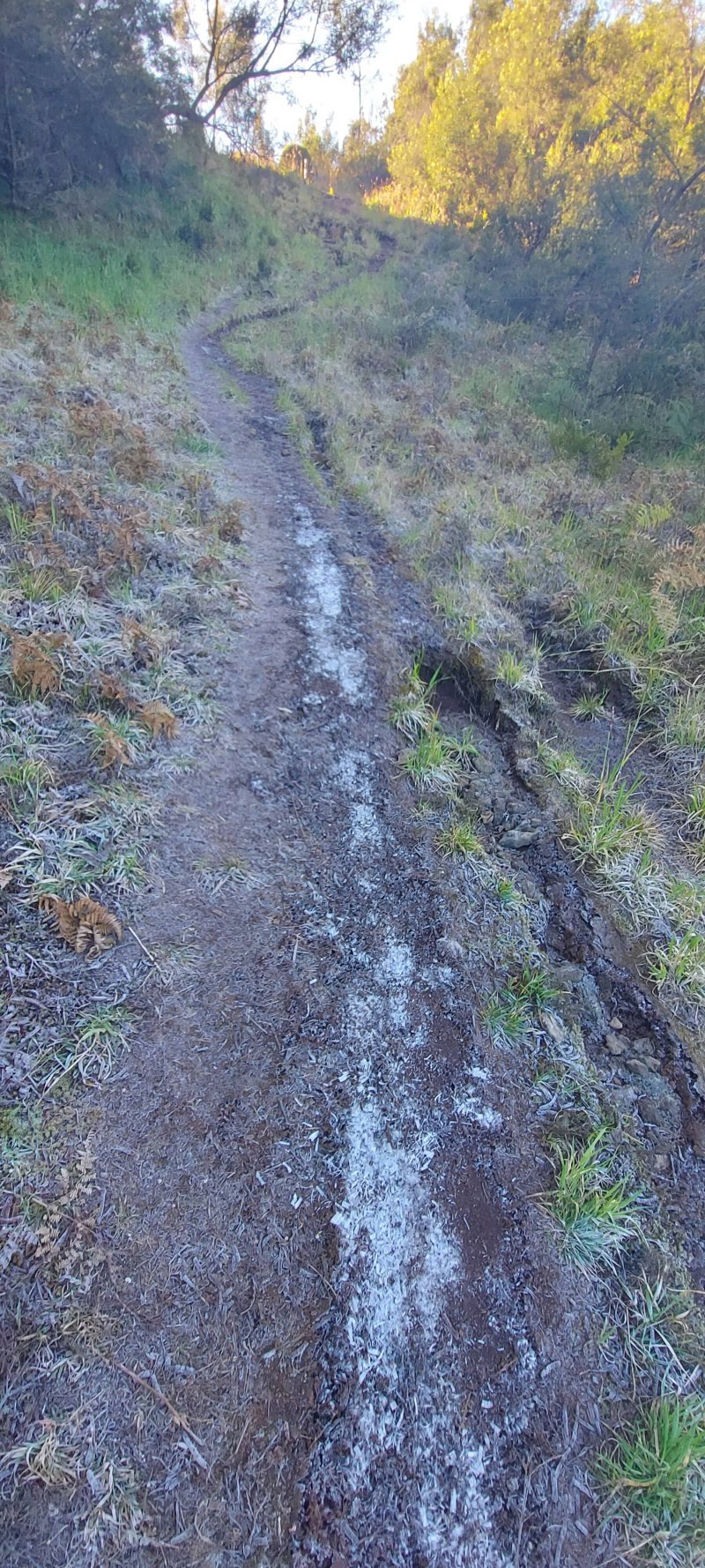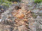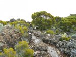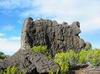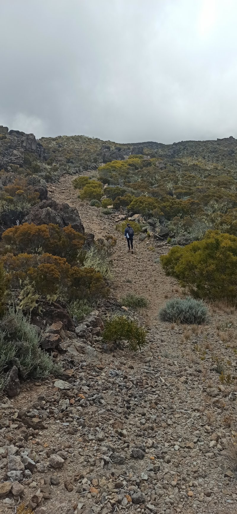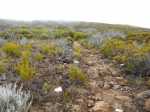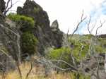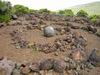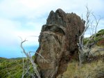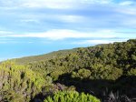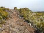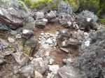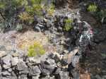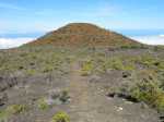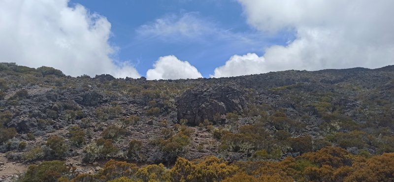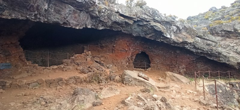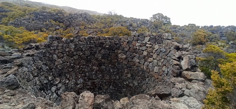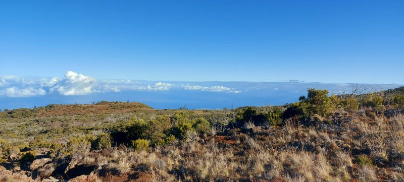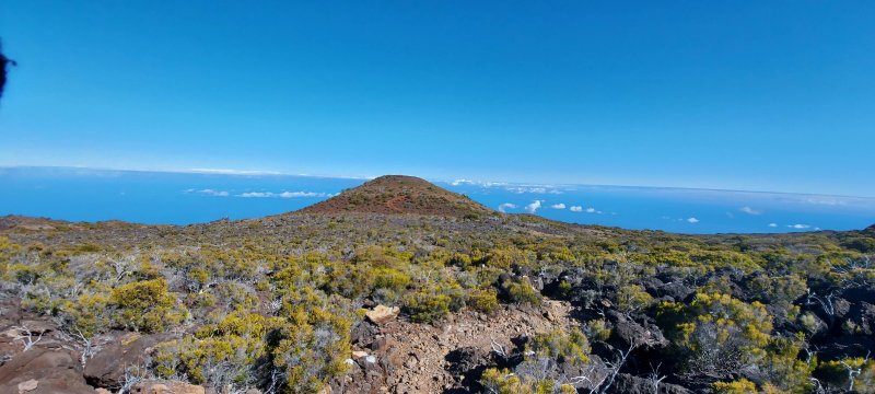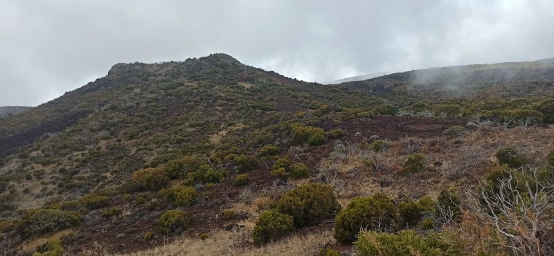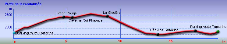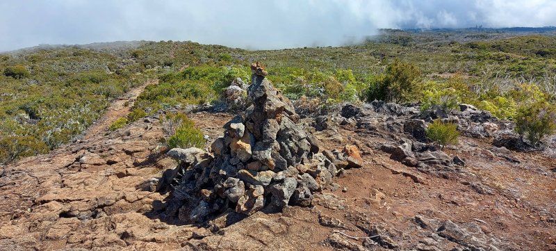La randonnée débute à la Route Forestière des Tamarins par un sentier pentu dans les herbes, bordé de panneaux rappelant la vie des esclaves marrons en évoquant la présence du Roi Phaonce (Photo 1). Il traverse une plantation de tamarins et monte en pente assez forte mais régulière à travers les acacias noirs et branles verts. Le sentier partant sur la gauche en direction de la Ravine de la Chaloupe est de plus en plus difficile à repérer. En se retournant, on peut profiter de larges vues sur la pente boisée et même jusqu'à l'océan en direction de Saint-Gilles et du lagon (Photo 2). Plus haut, le sentier coupe la ligne déboisée des 1800. La végétation a repris possession des lieux après les incendies du siècle précédent mais quelques pieds de branles et tamarins, squelettiques, dépassent encore des fougères et des nombreuses roches qui dépassent (Photo 3). Le sentier se couvre parfois de cailloux, devient étroit ou plat, se partage en deux parties avant de se reformer, longe des parties rocheuses ou permet par moments de beaux points de vue vers le lagon de l'Ermitage. Certaines roches créent de belles natures mortes dans ce paysage verdoyant (Photo 4). Plus on monte et plus les panoramas s'élargissent en direction du Grand Bénare (Photo 5). Le sentier frôle les premières centaines de mètres de la ravine de la Chaloupe qui a pris sa source au pied du Piton Rouge (Photo 6). Quelques raidillons un peu plus techniques amènent doucement au pied du Piton Rouge en marchant sur de bonnes couches de petites et grosses pierres (Photo 7). Tenter un écart pour visiter la Caverne du Piton Rouge en s'aidant de la carte car elle est peu visible à partir du sentier (Photo 8). Un panneau indiquait correctement le petit sentier qui permettait de s'en approcher sans hésitation mais il n'a pas résisté au temps. Toujours dans les parages, impossible de manquer le dyke surmonté de sa croix qui a poussé au milieu de rochers éparpillés au pied du piton (Photo 9). Attention, le fait qu'on y trouve une croix n'indique pas pour autant qu'on peut y monter facilement. Un endroit dénudé servant d'aire de pique-nique aux courageux qui pourraient monter ici avec une glacière est aménagée au pied. Une autre aire comportant des cercles de pierres ne peut se manquer avant l'ascension (Photo 10). Le sentier qui permet d'atteindre le sommet du Piton Rouge est court, glissant mais aisé (Photo 11). Du sommet, on a un superbe panorama sur toute la région et on peut imaginer les guetteurs du Roi Phaonce qui attendaient et voyaient arriver de loin les chasseurs d'esclaves. Quelques sculptures de Gilbert Clain ont été érigées en hommage à ces "évadés" qui tentaient de vivre dans cette région froide et désertique (Photo 12). Elles ne sont pas érigées au sommet mais elles sont tout de même faciles à dénicher en suivant les petits sentiers qui s'en approchent. Avant de continuer en direction de la Glacière, effectuer une incursion vers le sud-est (non prévu sur la carte ci-dessous) afin de rejoindre la Grotte du Roi Phaonce (Photo 13). On emprunte, comme partout ici, un sentier assez large et recouvert de cailloux de lave. Il est assez plat jusqu'à la grotte où vivait le Roi Phaonce (mais beaucoup de légendes ont circulé sur sa vie et peut-être ne s'y est-il même pas assis à l'ombre !). Une cavité plus importante se visite également au plus près du Petit Bénare. Le tas de cailloux à côté peut faire penser à une tombe et la grotte semble bien petite pour abriter des intempéries fréquentes à cette altitude (Photo 14). Réserver la visite au Petit Bénare pour une autre randonnée puis faire demi-tour par le même itinéraire jusqu'au sentier de la Glacière. Le sentier est toujours aussi caillouteux mais beaucoup plus plat dans une végétation de plus en plus rabougrie en raison du climat à cette altitude (Photo 15). On coupe une bonne dizaine de jeunes ravines dont l'imposant cassé de la Ravine des Colimaçons. Plus loin, on franchit le gué à sec du Bras Sud de la Grande Ravine qui offre, 200 mètres en amont de magnifiques falaises et bassins qui se visitent sans danger. Comme les pentes sont faibles et le sentier large, on atteint rapidement un premier puits de stockage de 5 ou 6 mètres de profondeur. Fait de pierres sèches, il servait de stockage de la glace recouverte de sciure de bois pour la conserver plus longtemps. Le sentier comporte quelques parties rocheuses un peu plus techniques (Photo 16). La marche reprend pour trouver un croisement qui part à gauche vers la Route des Tamarins et à droite vers la Glacière. L'aller-retour est très rapide mais incontournable. Ne pas manquer, dans les alentours, les nombreuses cavités qui retiennent l'eau (Photo 18 et 19). La Glacière est une curiosité (Photo 20). On imagine facilement la taille de la grotte naturelle avant son aménagement, son creusement et sa fermeture par des murailles pour garder la fraîcheur nécessaire à la conservation de la glace (Photo 21). Plusieurs panneaux permettent d'en savoir plus sur l'exploitation de cette denrée prisée des riches au 19ème siècle. La simple idée de récolter de la glace à cette altitude doit faire prendre conscience que le climat de l'hiver austral peut descendre à des températures relativement basses et inciter a bien se vêtir. Une période très froide au 19ème siècle justifiait plus qu'à notre époque cette envie de glaçons. Héla, le lieu, très visité depuis le Maïdo par un itinéraire facile sur piste, est un véritable dépotoir doublé de toilettes publiques !! Le sentier de retour, celui du Grand Bénare, ressemble comme un frère au précédent emprunté dans la montée (Photo 22). La végétation est presque identique ainsi que la pente qu'on effectue toujours en descente. Un autre puits très proche de la Grande Ravine comporte les mêmes caractéristiques que le premier (Photo 23). Le sentier traverse des zone