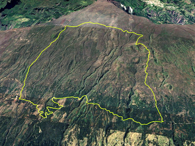 Sans grand intérêt sportif, cette boucle d'une vingtaine de kilomètres permet de découvrir une région froide, isolée et désertique, trouée comme du gruyère et parcourue seulement par les vaches (et hélas des incendies réguliers qui on fait des dégâts souvent irréparables). On y rencontre en effet d'innombrables cavernes, trous d'eau, puits naturels ou consolidés par l'homme à des fins de stockage et même un court mais beau dykemur rocheux d'origine volcanique qui recoupe les autres roches et dépasse en raison d'une érosion plus lente. A la Glacière, on aura une pensée émue au souvenir des esclaves qui, selon quelques légendes, laissaient parfois leur vie pour satisfaire les besoins en glace de Mme Desbassyns. Deux puits sont encore bien conservés dans les alentours : ils permettaient un stockage intermédiaire des sacs de glace. Un petit détour de quelques centaines de mètres permettra de visiter une partie du royaume du Roi Phaonce ou de la Caverne du Piton Rouge, de plus en plus difficile à repérer. La région se couvre souvent de brouillard mais les repères blancs y sont nombreux et rassurants. Si la baignade est facile dans certains bassins, il n'est pas conseillé de boire l'eau stagnante comme le faisait Phaonce et sa tribu. Prendre suffisamment de boisson et des vêtements chauds en cas de halte prolongée.