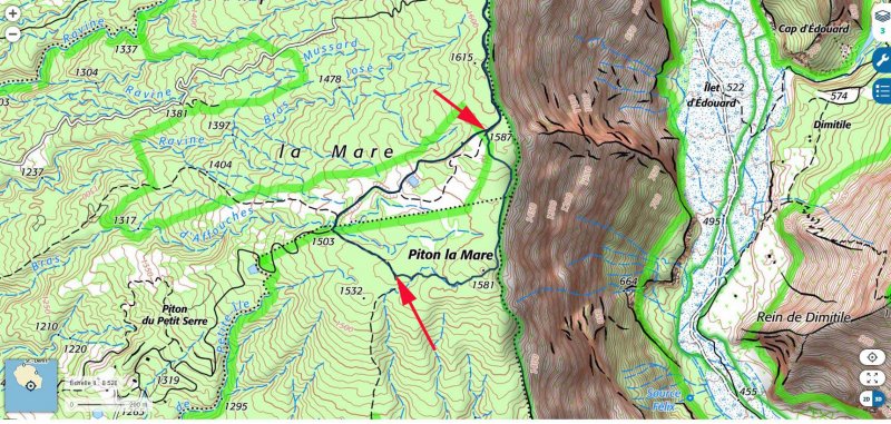 Christian L, tu as tout as fait raison, j'ai repris la carte et mon commentaire du 31/12/2018, effectivement, si on utilise la dernière carte ign, celle de 2020, on prend le sentier qui rejoint le piton de la Mare à la côte 1587 et on rejoint le sentier en pointillé noir sur la carte, sentier qui mène vers la côte 1503, ou j'ai mis une flèche sur la photo jointe; la côte 1532 étant effectivement plus basse. Ce sentier qui n'est pas indiqué sur la carte est bien tracé dans la forêt.