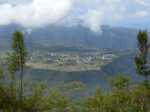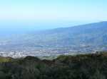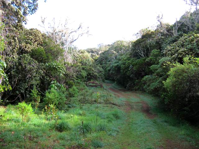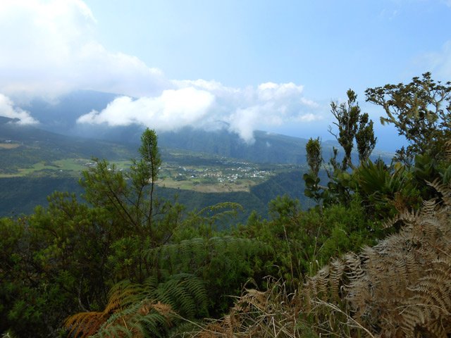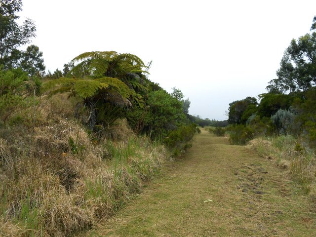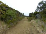 La randonnée débute à la route de Notre Dame de la Paix en venant du Tampon (route de Petite Île). Une barrière en bois a été installée au début de la petite route qui part sur la droite et on doit se garer le long de la D36 près de la pancarte marron indiquant la Forêt des Hauts de Mont Vert. Emprunter la route qui s'enfonce dans la forêt primaire. On marche en se régalant déjà des belles vues sur la forêt envahie de grandes fougères arborescentes et de toutes les essences classiques de ces altitudes. La pente est faible et le parcours très propre. On va ainsi jusqu'au bout de cette petite route forestière qui mène à une barrière métallique marquant le début du parcours (Photo 1). Comme il n'y a plus guère de troupeaux, elle est le plus souvent ouverte. Repérer sur la gauche la trace discrète d'un sentier s'enfonçant dans le sous-bois. Les plus curieux y tenteront une incursion en fin de randonnée. Après avoir franchi la barrière, suivre simplement cette piste herbeuse qui peut mouiller les chaussures de rosée au petit matin (Photo 2). Là également la pente est faible et ne demande aucun effort ni préparation sportive. Les abords semblent infranchissables tant la végétation pousse dru (Photo 3). On retrouve les classiques plantes poussant en forêt primaire avec une bonne dose de fanjans, ambavilles ou fleurs jaunes (Photo 5). Des plantations sur le bord de la piste ont depuis des années beaucoup de mal à prendre racine à 1600 mètres d'altitude (Photo 6). On peut facilement reconnaître les essences végétales en étudiant les feuilles. Parfois les arbres sont morts ou couverts de longues barbes de Jupiter (Photo 8). Aucun panorama n'est directement visible depuis le chemin ; il faut toujours pénétrer de quelques mètres dans le bois sur la gauche. Plusieurs fois, des sentiers étroits partent sur la gauche et mènent à des points de vue dans les fougères ou branles. De là, on distingue très bien l'étroit plateau de Grand Coude (Photo 9). Sur la gauche, c'est l'amont de la vallée vers le Nez de Bœuf quant l'ensemble n'est pas déjà pris dans les nuages (Photo 11). La piste poursuit tranquillement sa descente et s'approche des anciennes prairies. On remarque d'ailleurs une diminution de la forêt primaire remplacée petit à petit pas des fougères arborescentes et quelques acacias noirs (Photo 14). Heureusement, les goyaviers n'ont pas commencé à coloniser cette partie du rempart. Quelques tronçons de piste en descente plus marquée et moins recouverts d'herbe sont souvent très glissants (Photo 15). Le bâton s'avère utile quand on se sent partir vers l'avant ! Sur le bord de la piste, des campagnes d'éradication de l'ajonc d'Europe ont été entreprises mais l'opération est certainement vaine quand on voit les jeunes pousses repartir de plus belle (Photo 16). Puis viennent les anciennes prairies où l'on voyait fréquemment les vaches brouter à la fin du siècle dernier. Elles sont désormais recouvertes d'une multitude de touffes d'arums (Photo 17). Si les bovins revenaient, ils ne trouveraient même plus d'herbe par endroits (Photo 18). On remarque ça et là quelques essences endémiques, signe d'une réinstallation de la forêt mais il pousse également certaines plantes invasives comme le bringelier, beaucoup plus prolifique (Photo 19). Il aura vite fait de recouvrir les parties vides en chassant arums et fougères. On passe près d'un banc vieillissant qui permet de se reposer, surtout que de l'autre côté, on profite de superbes panoramas sur le Piton des Neiges et une partie des principaux points culminants (Photo 20). On devine encore très bien certaines prairies de l'époque (Photo 21). Profiter également de larges panoramas sur le Tampon et sa région (Photo 22). La piste, toujours recouverte d'herbe courte, oblique vers la droite pour éviter le Piton de la Mare (Photo 23). Les acacias noirs se multiplient avant de parvenir au croisement avec le sentier menant à Mont Vert les Hauts (Photo 24). C'en est fini de la piste qui se termine à une clôture de propriété tout près de la mare entourée de hautes fougères et d'arums (Photo 26). C'est la fin symbolique de cette balade en forêt des Hauts. Le sentier se poursuit par un escalier qu'on remarque entre la mare et la clôture. Il pénètre dans la forêt primaire de la Petite Île. Faire demi-tour et regagner le véhicule laissé sous les cryptomerias de la RD36.