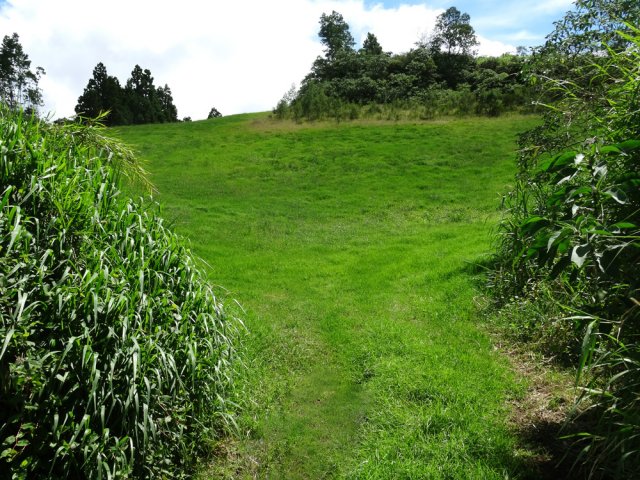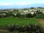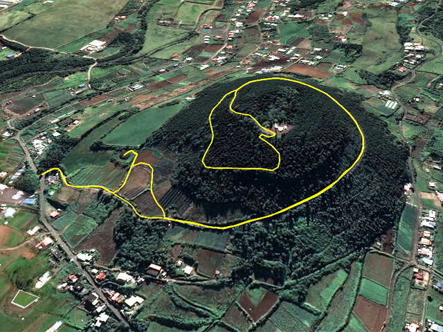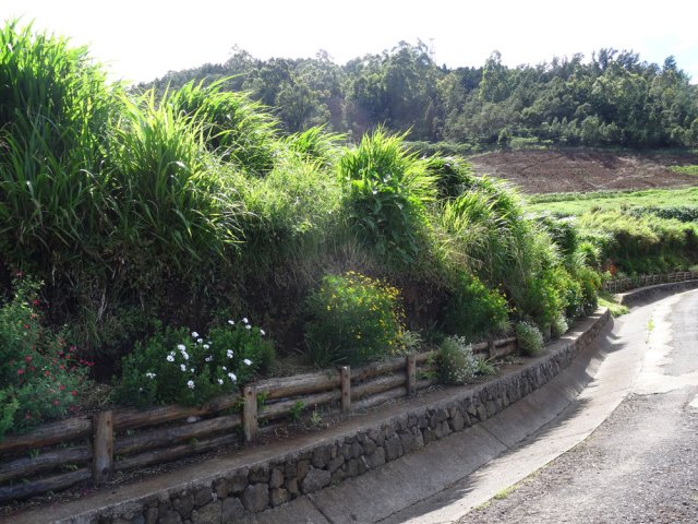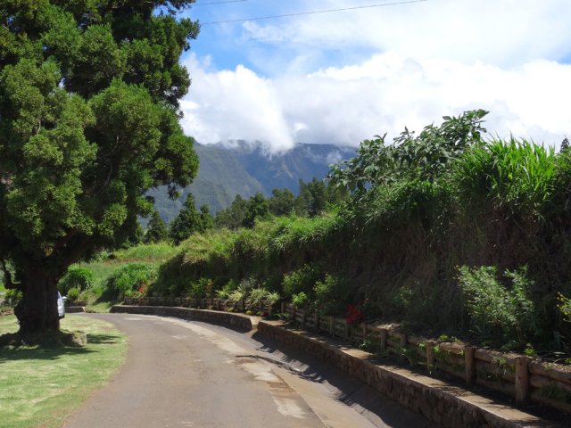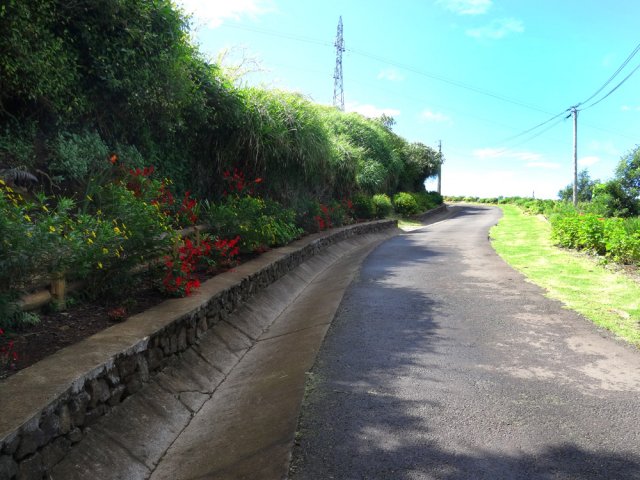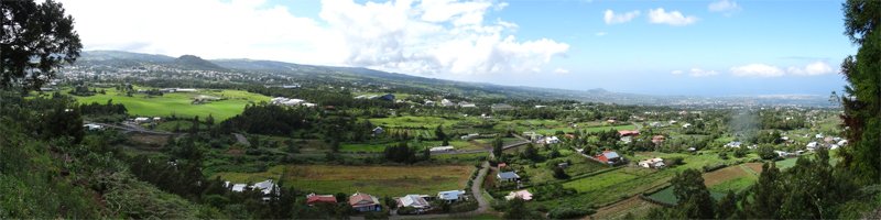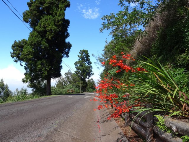 La boucle débute au croisement de la Route du Piton Hyacinthe et du chemin forestier où une petite place de pseudo parking permet de laisser le véhicule pour un court moment sous un prunier (Photo 1). En face, près d'un cryptomeria, se trouve inscrit le nom du piton avec des pierres blanches (Photo 2). Le chemin bétonné qui effectue une grande partie du tour du piton est bordé de chaque côté de plantes aménagées par les emplois verts (Photo 3). La balade est donc d'autant plus agréable que les fleurs y sont variées et nombreuses. Sur la droite, de beaux panoramas s'observent vers Saint-Louis, (Photo 5), Saint-Pierre ou la Plaine des Cafres (Photo 7). On longe également des petits champs de légumes qu'on voit à perte de vue au milieu des habitations (Photo 6). La pente est moyenne et régulière et on rejoint le sommet par la piste bétonnée de rouge, bordée d'acacias noirs (Photo 9). Les pestes végétales ont été éradiquées le long de cette route et des sentiers semblent en construction, sans doute une remise en état de l'ancien sentier qui effectuait le tour complet du piton. Un sentier sur la droite marque le point de retour après la balade au sommet et au belvédère. On arrive plus haut sous les acacias et les filaos puis on rejoint le parking des pique-niqueurs, un kiosque dans une petite zone herbeuse avec une place à feu ayant beaucoup souffert (Photo 10). Ce sont surtout les antennes qui se remarquent le plus dont une très haute protégée d'un grillage (Photo 11). Un sentier recouvert d'herbe part sur la droite en face de l'antenne et pénètre dans une petite forêt de cryptomerias. On remarque également des platanes et les premiers eucalyptus (Photo 12). Le sentier, constitué de marches en rondins descend rapidement (Photo 14) et rejoint en quelques minutes un belvédère permettant des points de vue sur la campagne et les champs de l'autre côté du piton. Hélas, les acacias noirs ont tellement grandi qu'il est très difficile d'observer les paysages. Souhaitons que l'abatage de ces indésirables permettra d'admirer les panoramas. Le sentier est propre, suffisamment large, comporte des racines comme c'est chaque fois le cas sous les grands conifères. La marche n'est jamais difficile sous les cryptomerias ou les filaos (Photo 13). Après ce point de vue, poursuivre sur le chemin qui serpente sous les mêmes arbres mais également sous de grands eucalyptus (Photo 15) dont un est particulièrement remarquable (Photo 16). On revient sans aucune difficulté à la petite route empruntée pour la montée en terminant par une piste étroite entre les acacias noirs (Photo 17). Il ne reste plus qu'à redescendre la route en bénéficiant à nouveau des panoramas sur le Dimitile et vers Bois Court (Photo 21). Avant de rejoindre le prunier du point de départ, partir sur la droite par une piste qui débute en montant dans les champs. On parvient rapidement à un vieil alambic près d'un champ de géraniums (Photo 22). Plus loin, on peut monter facilement sur le château d'eau afin de voir jusqu'au Dimitile (Photo 23). Emprunter la piste herbeuse qui rejoint la route du Piton (Photo 25) et retrouver le véhicule.