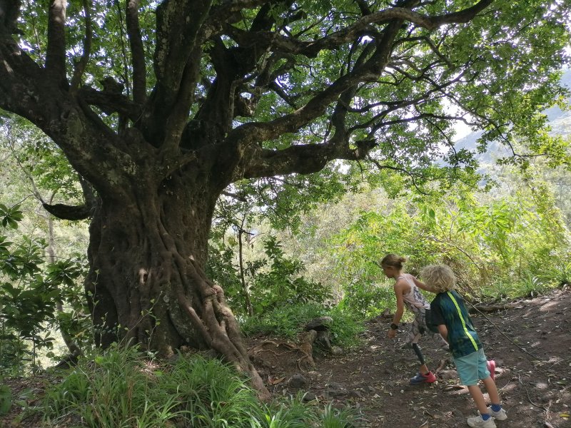 Cette courte balade familiale constituée de deux boucles permet de visiter l'arrière pays de Palmiste Rouge ou de l'Îlet à Calebasse et de varier les paysages. Les panoramas sur les remparts ou sur la petite ville sont magnifiques au lever du soleil. On y rencontre de gros spécimens de filaos, d'eucalyptus mais surtout un extraordinaire bois rouge qui a donné son nom à l'un des sentiers. La table installée sous ses immenses branches a disparu mais il faut dire que les pique-niqueurs ne devaient pas s'y bousculer. On retrouve les cascades déjà décrites dans la randonnée venant du Piton Morel et même si le circuit ci-dessous ne les a pas intégrées, c'est toujours un vrai plaisir que d'entendre ou de voir couler l'eau fraîche de la Ravine des Calumets. On peut également prolonger l'effort en rajoutant la montée au Piton Gros Galets qui évitera de marcher sur la route. Comme la randonnée est courte, éviter de partir trop tôt car on marche à l'ombre du rempart et les photos ne sont jamais bonnes comme celles présentées ci-dessous.