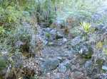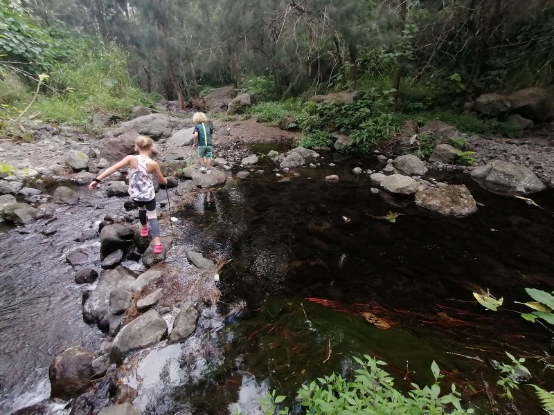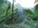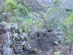 La randonnée débute à Palmiste Rouge près du terrain de sport où on a peu de mal à trouver de la place pour stationner. Partir sur la route vers l'Îlet à Calebasse et chercher le sentier aussitôt sur la droite. La descente vers la Ravine des Calumets est courte mais très raide malgré les nombreux lacets sableux (Photo 1). On bénéficie déjà de beaux panoramas sur le Morne Gros Galets et les remparts du Sommet de l'Entre Deux (Photo 2 & 3). Pas de problème pour traverser la rivière et remonter vers la route par un court sentier rocailleux. Afin de ne pas trop marcher sur le goudron, préférer le sentier qui part sur la gauche dans les eucalyptus pour rejoindre le radier et l'aire de pique-nique de Fond de Galet située dans le virage du radier (Photo 4). Marcher vers l'Îlet à Calebasse et tourner aussitôt à gauche sur le sentier du Morne Gros Galet. La montée est très courte sur un sentier sableux bordé d'une végétation pauvre et de hautes marches constituées de pierres (Photo 5). Emprunter le premier sentier à droite, le Sentier la Savane, qui chemine dans les petits bois de remparts (Photo 7). Des murets ou constructions indiquent que la zones fut sans doute cultivée au siècle dernier (Photo 8). Certaines parties sont recouvertes de grosses pierres qui ralentissent peu (Photo 9). On atteint très facilement et rapidement la route de l'Îlet à Calebasse (Photo 10). On peut dès à présent repérer le sentier qui rejoint la Ravine des Calumets qu'on empruntera au retour de la boucle suivante. La route n'est pas dangereuse et les panoramas sur Palmiste Rouge et les pitons qui l'entourent valent à eux seul cette balade. On rencontre très vite le départ du Sentier Bois Rouge sur la droite, là aussi facile à repérer. Poursuivre sur la route pour marcher jusqu'à l'autre extrémité de ce sentier qu'on retrouve à droite 600 m plus loin (Photo 11). Descendre sur un sentier agréable vers le Bras de Calebasse parmi les grands filaos (Photo 12). Le sentier, parfois un peu caillouteux est recouvert des aiguilles de filaos qui glissent sous le pied (Photo 14). On rencontre un discret embranchement avec un sentier partant sur la gauche et traversant le Bras de Calebasse dans les chouchous qui recouvrent arbres et berges. Le sentier est plus étroit mais sans aucun danger (Photo 15). Il permet en quelques minutes de rejoindre un promontoire où vit depuis plusieurs siècles un énorme bois rouge au tronc vérolé (Photo 16). La photo ne montre pas l'énormité du tronc imposant. Terminer la courte boucle qui redescend puis recoupe la ravine et rejoint le sentier principal près d'un belvédère rustique envahi par toutes sortes de plantes rendant difficile l'observation des panoramas (Photo 17). Si le temps est clair et qu'on affronte le fouillis de la végétation on y profite de nouveaux magnifiques points de vue sur le Piton Morel et le Morne de Gueule Rouge (Photo 18) ou sur la vallée de la Ravine des Calumets et le Grand Bénare (Photo 19). Quelques marches entrecoupées de sections plus plates permettent de rejoindre la route (Photo 20). Rejoindre la route après un raidillon (Photo 21). Marcher à nouveau en direction du Sentier la Savane mais ne pas atteindre son départ car le sentier qui descend à la Ravine des Calumets débute à quelques mètres en amont sur la gauche de la route. La balade, comme la précédente, n'est pas dangereuse et permet de se régaler des paysages vers Palmiste Rouge (Photo 22). Repérer le sentier qui descend sur la gauche. Des marches ou rondins ou des portions sableuses sous les filaos permettent d'atteindre sans problème les rives de la rivière. On est d'abord accueilli par l'agréable bruit de l'eau avant d'arriver à la ravine dont le niveau d'eau est assez faible entre quelques toboggans. Avant de traverser, profiter des vues sur les toboggans, le bassin et les premières chutes d'eau (Photo 23 & Photo 24). Traverser en passant là où l'eau ne coule pas trop fort en contournant des bassins. Un sentier, de l'autre côté, longe la ravine (Photo 26). Tenter de trouver le sentier plus étroit qui passe au plus près du torrent et repérer de beaux bassins ou chutes avant de repartir vers le village. Emprunter le sentier qui traverse ou contourne l'aire de repos constitué de quelques tables. Terminer le circuit par une pente assez faible à flanc de rempart (Photo 27) et rejoindre le Passage des Galets à Palmiste Rouge qui finit à un très beau point de vue sauvage sur l'aval de la Ravine des Calumets. Comme la randonnée est terminée et qu'elle est courte, ne pas hésiter à flâner dans le village pour rejoindre le terrain de sport par les rues ou des passages entre les habitations (Photo 28).