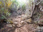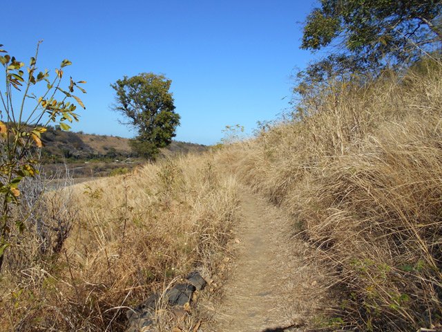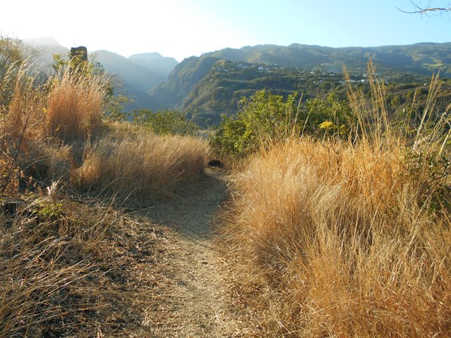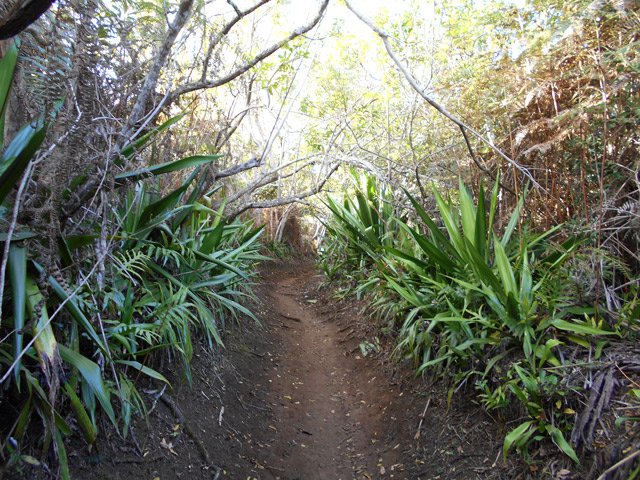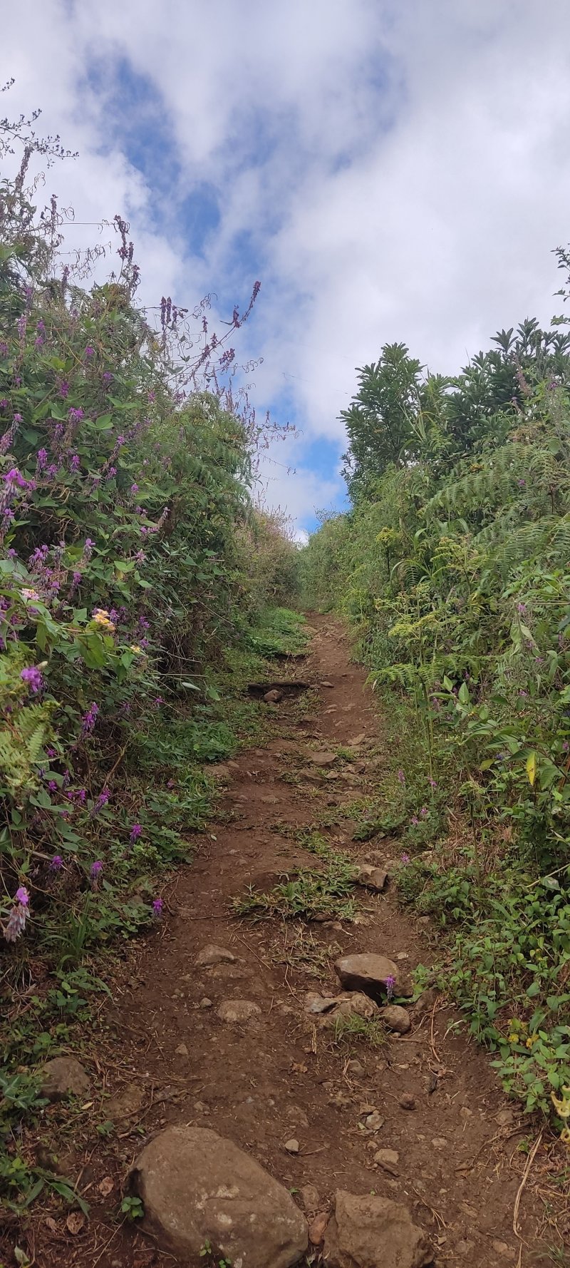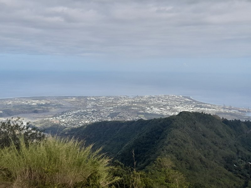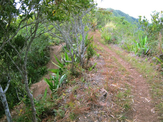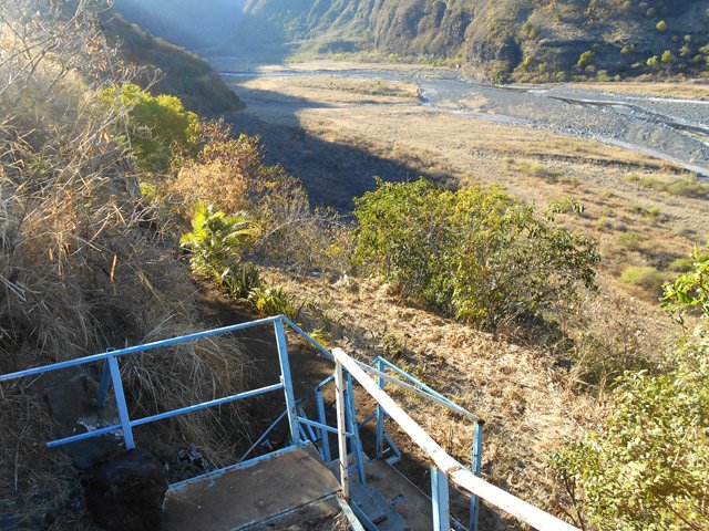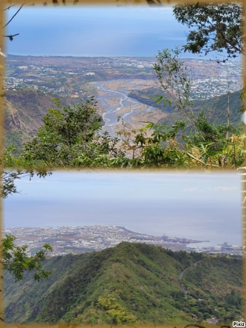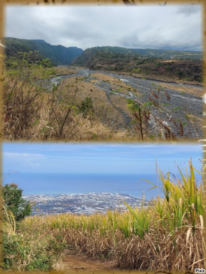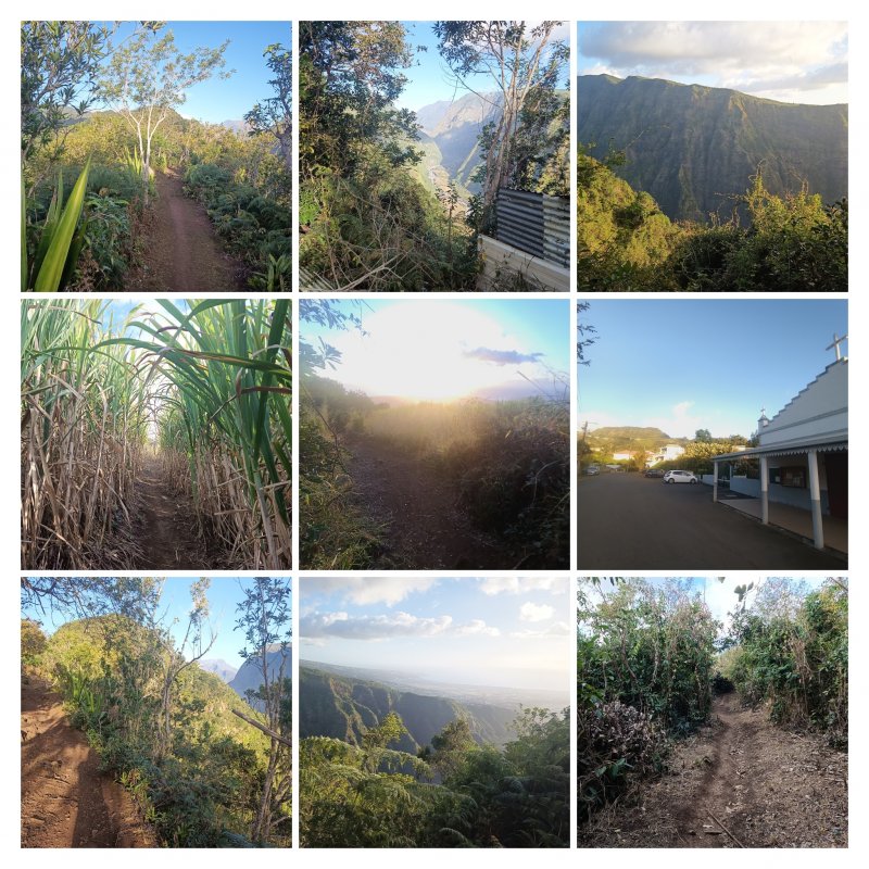 La randonnée débute, comme souvent, à l'église de la Rivière des Galets dont les alentours proposent plusieurs places de stationnement. En passant près de l'usine d'embouteillage, rejoindre la Rue de Mafate, pleine d'ornières et de petits dos d'ânes. Passer un parc canin et quelques cases avant de filer vers la Rivière des Galets qu'on retrouve au premier gué et à la piste empruntée par les taxis mafatais. Repérer, parallèle à la rivière, le sentier qui débute sous les poivriers, passe près d'une réserve d'eau entourée de grillage, longe une ravine profonde qui débute par un tunnel de lave et franchit une tuyauterie. Après le tuyau, le sentier caillouteux monte fortement en quelques lacets vers le haut de la colline (Photo 1), puis dans des herbes (Photo 3). Il descend ensuite sur un sol caillouteux, remonte encore plus rudement vers un des anciens pylônes en pierre qui soutenait le câble blindé (Photo 6). Il traversait jadis la rivière pour alimenter le port en électricité depuis la 1ère usine hydroélectrique installée sur l'ancien canal Lemarchand du côté de l'ilet Savannah. Puis il longe le rempart pour des vues magnifiques sur la Rivière des Remparts et l'entrée de Mafate avant d'arriver à la Rue de la Roche Glisse (Photo 5). Une échelle bleu clair attire le regard avant d'arriver à la rue (Photo 7). C'est là que se trouve une petite grotte abritant quelques vierges. Bifurquer sur la droite et remonter la rue jusqu'au terrain de football sur la droite. Longer le terrain et repérer le sentier qui débute en face de la cage de but (Photo 8). Il est de plus en plus court car les constructions poussent ici comme des champignons. Un peu plus haut, il finit à une route. A partir de là, suivre les flèches peintes au sol pour rejoindre un long escalier bordé de nombreuses plantations (Photo 9). Le reste de la montée alterne portions de routes, larges sentiers aménagés parfois en escaliers (Photo 10) ou en frôlant quelques lopins qui seront vite vendus aux promoteurs (Photo 11). Au croisement de plusieurs routes, prendre à gauche et repérer les premières pancartes "Sentier de Bord" (Photo 13) qui seront très utiles par la suite pour repérer les diverses et nombreuses bifurcations. Le sentier monte à travers les lianes papillon de plus en plus nombreuses qui ne tarderont pas, avec le temps, à le boucher. Des bambous bordent le nouveau sentier rectiligne qui longe des propriétés (Photo 14). Il devient à nouveau caillouteux avec de hautes marches (Photo 15). A la prochaine route, bifurquer sur la gauche, marcher jusqu'au croisement, prendre la route de droite, longer les cannes à sucre et obliquer dans le champ à un virage de la route sur un sentier qui traverse la plantation. Après une zone de poivriers et fougères, on rencontre une case en tôle sur la droite du sentier. Profiter du point de vue sur la vallée de la Rivière des Galets (Photo 16) et poursuivre en direction de l'oratoire (Photo 17) en longeant à nouveau des cannes (Photo 18). Prendre à droite à l'oratoire et poursuivre en direction de Dos d’Âne sur un sentier de plus en plus agréable en pente douce qui se rapproche du Ranch (Photo 19). Les chevaux éparpillés sur une terre inculte semblent tristes et n'hésitent pas à s'approcher de la clôture. C'est à ce moment qu'ils apprécient les marcheurs qui leur tendent quelques herbes cueillies auparavant. Il faut dire aussi que le contraste est saisissant entre les hautes herbes du chemin et le désert de l'enclos. Les galaberts et les fougères l'emportent dans une région en friche comportant ça et là des signes de quelques cultures anciennes (Photo 20). On rencontre une première bifurcation sur la gauche partant vers le Chemin Ratinaud (Photo 22). A un oratoire, une nouvelle bifurcation vers la gauche rejoint la route de Dos d’Âne. A la troisième en Y un peu plus loin, prendre à droite pour rejoindre le village et longer la paroi rocheuse en profitant de quelques points de vue sur la Rivière des Galets (Photo 23). De l'autre côté de la large vallée de la Rivière des Galets, on remarque le rempart de Sans Souci puis la coupure très visible de la Canalisation des Orangers (Photo 26). Le sentier se transforme en piste puis en route aux premières cases (Photo 27). On peut poursuivre entre les cases sur la piste bétonnée jusqu'à l'église du village avant de continuer vers une autre direction (Lataniers, Cap Noir, Roche Écrite ou Deux Bras) ou tout simplement reprendre le chemin inverse vers la Rivière des Galets. Dans ce cas, et pour varier les paysages, prendre alors à droite vers le lieu de décollage des parapentes aux alentours du sentier qui entre dans Mafate pour bénéficier de belles vues sur la Ravine à Marquet et sur le Port.