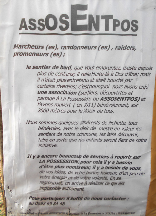 L'association Sentiers, découvertes et partage de la Possession recrute des volontaires afin de les aider à remettre en état ou entretenir les sentiers qu'ils ont déjà remarquablement mis en valeur. Ils sont responsables de la partie haute de l'itinéraire proposé pour monter à Dos d'Ane.