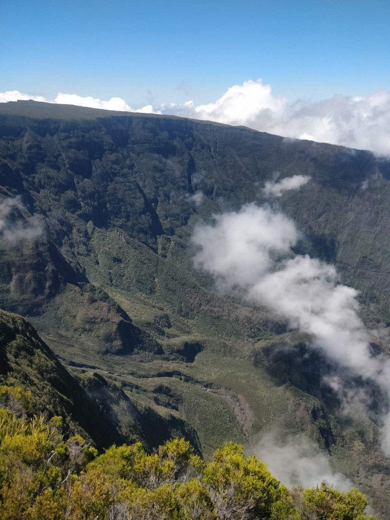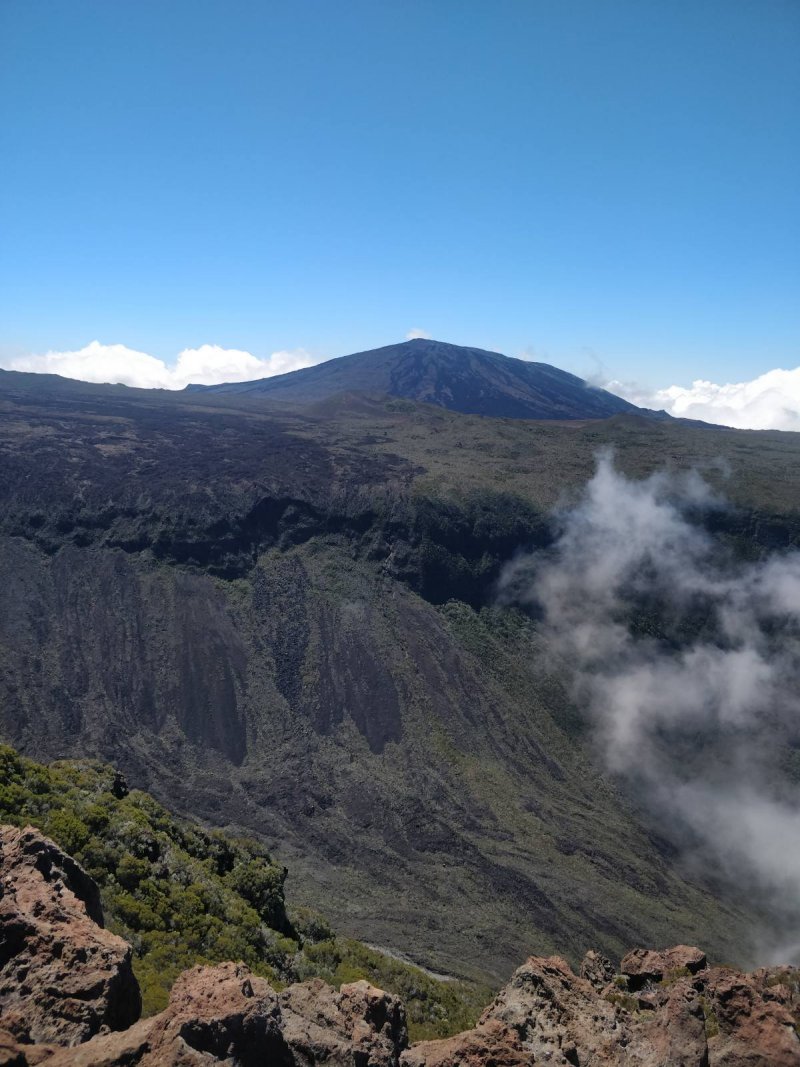Quelques secondes d'un film de qualité médiocre pour donner une idée du premier point de vue sur son éperon rocheux. Depuis le promontoire rocheux étroit, un panorama à 320° s'offre au marcheur pour une pause plaisir. Attention tout de même au vertige et à la bousculade si l'on est plusieurs. En partant de la gauche on a sous les yeux Grand Coude, la vallée de la Rivière des Remparts dominée par le Piton du Rond, la caldeira, la vallée de Mahavel et du Bras Dimitile, le Nez de Bœuf, le Cap Edouard, le Rein de Bouc pour finir par les flancs escarpés du Morne Langevin.