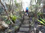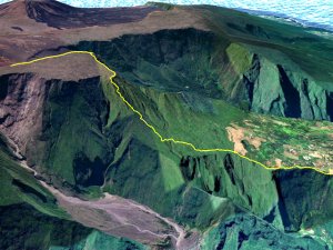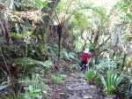 Le sentier marron de Grand Coude au Morne Langevin n'était connu que des braconniers et chasseurs de larves avant la parution de la fiche sur Randopitons en 2012. Depuis cette publication, il s'était élargi des multiples passages mais n'en demeurait pas moins compliqué à suivre tant par la pente empruntée que par la difficulté de suivre la trace des yeux. Même les précisions très détaillées du départ ne suffisaient pas à certains randonneurs qui abandonnaient après plusieurs essais infructueux. Ca y est, c'est fini et bien malin le marcheur qui pourra dire s'être égaré ! De l'église de Grand Coude jusqu'au Pas des Sables, le seul effort à fournir est de monter sans discontinuer l'escalier de plus de 2000 marches. Cette magnifique randonnée est effectivement réservée aux amateurs d'escaliers interminables et de fortes pentes. La fiche a perdu une icône aventure mais y gagne une place au Top5 des randonnées en fortes montées. Un travail colossal a été fourni par les équipes d'ouvriers et nous ne pouvons que les remercier du travail accompli. N'oublions pas le Parc National et l'ONF qui ont plutôt tendance à fermer des circuits que d'en ouvrir de nouveaux. Cet itinéraire deviendra en quelques mois une destination qui verra certainement affluer des centaines de marcheurs qui devront cependant avoir un bon entraînement. Le sentier jusqu'au kiosque est très bien entretenu. Celui du Morne Langevin n'a plus rien à envier à la montée du Taïbit ou du Piton des Neiges. Le GPS, de toute façon capricieux sur ces pentes y est devenu inutile. La forêt traversée est toujours aussi merveilleuse et il est fortement conseillé de nettoyer vêtements et chaussures avant la montée (voir § ci-dessous).