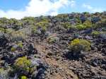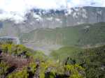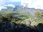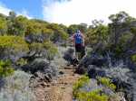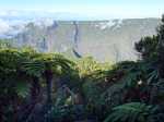 La randonnée débute au parking à 200 mètres de l'église de Grand Coude. La lecture du panneau installé par le Parc ne prend que quelques minutes (Photo 1). Marcher vers le rempart et bifurquer à droite sur le sentier de bord. Il traverse ou longe des prairies et monte de plus en plus par des marches en traversant également de larges surfaces envahies par les vignes et cannes fourragères (Photo 2). La montée n'est jamais raide et constitue un excellent entraînement à ce qui va suivre (Photo 3). On rencontre à droite le sentier des Trous de Cissia puis plus haut, quelques cryptomerias. Une Vierge trône désormais au coin de la prairie dans un oratoire tout neuf. Le kiosque est plus usé par les intempéries que pas les pique-niqueurs du dimanche. Prendre à gauche après le kiosque et marcher jusqu'au système installé pour nous débarrasser d'éventuelles graines récupérées en montant dans les zones de vigne marronne. Cette forêt ne comportant aucune peste végétale, il est fortement conseillé d'utiliser les installations de brossage pour ne pas la polluer (voir ci-dessous). Les 200 m qui suivent sont presque plats et traversés de minuscules ravines. Le sentier y est très boueux (Photo 4). Le sol s'assèche un peu et les premières marches font leur apparition, tout d'abord à dose homéopathique jusqu'à la Ravine Galet Bleu. Pas de roches bleues mais de beaux paysages autour de cette petite ravine à sec (Photo 5). On retrouve le sentier marron, élargi par les travaux mais comportant toujours les racines qui l'encombrent (Photo 6). Le cheminement est aisé sur un sentier correct serpentant entre les belles touffes d'arbres moussus (Photo 7). Une dizaine d'espèces de fougères bordent le passage dont ces belles blèchnes atténuées (Blechnum attenuatum) qui recouvrent les arbres (Photo 8). Les calumets y sont rares mais on traverse une zone où ils pullulent (Photo 9). Les orchidées sont partout, au sol comme sur les branches. Les marches deviennent de plus en plus nombreuses (Photo 10). Elles sont hautes et imposent de lever haut le pied à chaque pas. Les tronçons de plus de 50 marches sont très fréquents (Photo 11). On ne les quittera qu'au sommet avec, il faut le dire, un certain soulagement. On laisse parfois l'étroit sentier historique qu'on devine dans la pente pour partir sur le côté et trouver un itinéraire plus doux que la trace originelle (Photo 12). Certaines ravines se passent par de fortes descentes suivies de non moins fortes remontées, rajoutant ainsi un peu de D+. Les trouées dans la végétation permettent fréquemment quelques vues sur la Rivière des Remparts (Photo 13). Un point de vue a d'ailleurs été aménagé depuis un piton rocheux situé sur l'arête (Photo 14, voir film ci-dessous). Tout près, les premières échelles débutent pour franchir les barres rocheuses (Photo 15). De très bonne facture, elles résisteront très longtemps aux assauts de la météo humide de la région. Il faudra en emprunter une demi-douzaine jusqu'au sommet, rendant impossible le parcours avec un chien (Photo 16). Les marches ne diminuent jamais (Photo 18). La montée s'effectue désormais le long d'un rein offrant de plus en plus de larges panoramas sur Grand Coude, la rivière, Mahavel et jusqu'au Piton des Neiges (Photo 19 et 20). La forêt de bois de couleurs des hauts a presque disparu, remplacée par des branles verts dont certains atteignent d'imposantes tailles (Photo 21). Le sentier frôle une grotte, passe une dernière échelle (Photo 22), longe une petite falaise rocheuse et se termine sur le plateau du Morne Langevin. Profiter du spectacle des vallées et entamer la remontée du morne vers le point de vue officiel situé près de l'antenne. Après les centaines de marches, la remontée, pourtant rocheuse est une balade de repos (Photo 23). Le sentier serpente à quelques mètres du vide à travers de vastes surfaces de pierres de lave couvertes des brandes de cette altitude (Photo 24). Les hors sentiers d'une dizaine de mètres sont aisés pour atteindre le bord du rempart et profiter des vues sur Grand Pays (Photo 25). Poursuivre jusqu'au sommet puis obliquer vers la Plaine des Sables après avoir profité du point de vue officiel. Continuer sur le sentier officiel de bien meilleure qualité à travers les brandes (Photo 27). Cela fait près de quatre heures que l'on marche lorsque l'on parvient au-dessus de la Plaine des Sables (Photo 28). Il est alors possible de continuer vers la Plaine des Sables et revenir à Grand Coude par Grand Pays et Grand Galet mais il faut avoir préparé très sérieusement cette journée sportive. Il est également possible de partir vers le gîte, la Plaine des Palmistes ou Bourg Murat. Cette fiche prévoit un retour par le même itinéraire qui fera souffrir en descente les muscles qui se reposaient un peu à la montée !