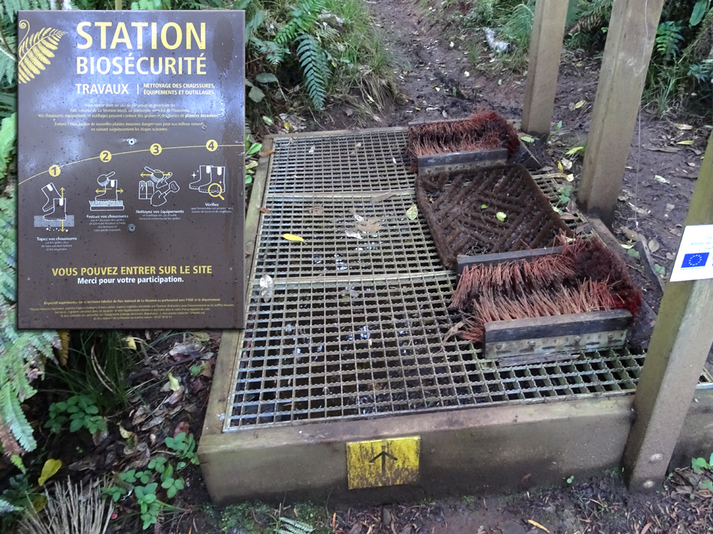 Les randonneurs habitués aux belles forêts de bois de couleurs des hauts ont souvent remarqué leur invasion par les longoses, vignes marronnes, jouvences et multiples autres plantes envahissantes. Celle-ci est particulièrement préservée et il serait dommage de la polluer avec les graines ramassées le long de la montée depuis l'église. Une fois à la station biosécurité, secouer le sac, épousseter les vêtements et frotter les chaussures ne prend qu'une minute, cela permettra à cette forêt de continuer à nous enchanter plutôt que de nous griffer.