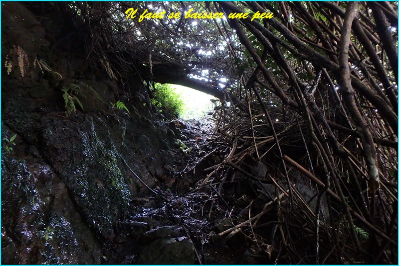 Quelques amateurs continuent de pratiquer ce sentier, ce qui fait que le sentier est en bon état pour un sentier de ce type; nous avons participé aussi en dégageant la vigne marronne qui tente d'envahir certains passages. Sur le plateau, le passage qui pouvait être compliqué à suivre dans les hautes fougères est bien tracé et ça passe bien. Arrivé au niveau de la ravine pied de canne, plus besoin de passer derrière le bananier, contourner la ravine et descendre dans la forêt pour retrouver le sentier, la trace permet maintenant de traverser la ravine et de reprendre directement le passage.