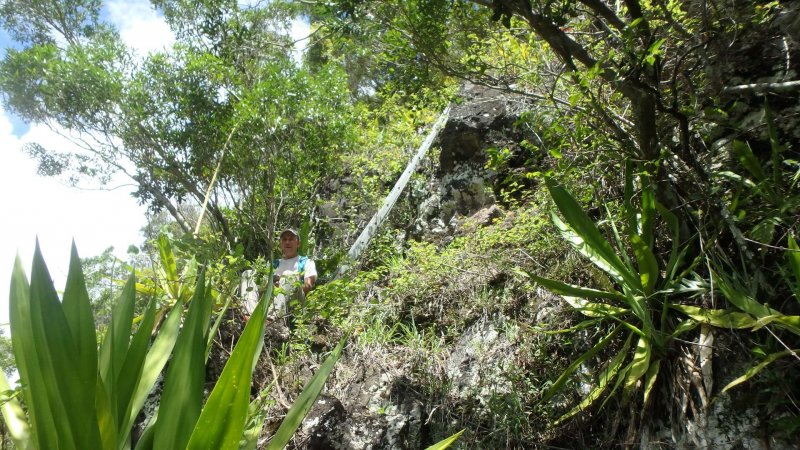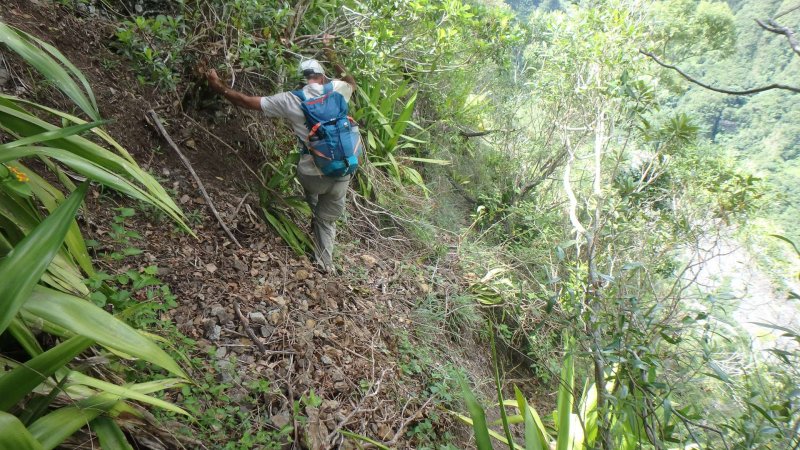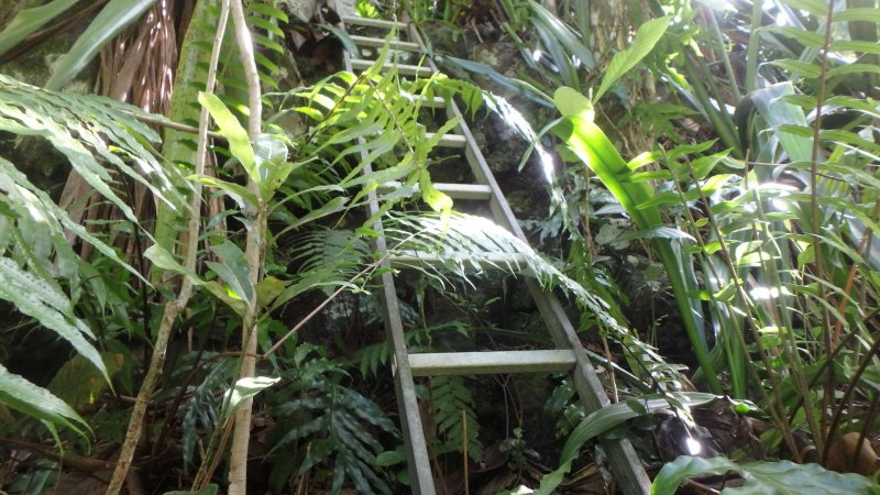 J'ai trouvé (dans le sens de la monté) l'entrée du sentier depuis le Bras de la Plaine sans difficulté. J'ai passé une première échelle, puis une très longue main courante, une seconde échelle (avec un barreau endommagé). Quelques instants après cette seconde échelle, j'ai buté sur un passage escarpé à proximité d'une ravine sur ma gauche.(ALT 850)