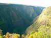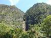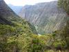 La randonnée débute au kiosque Jean Lauret et plonge par de nombreux lacets vers la ravine du même nom. Les panoramas sur la mer et les villes littorales ont nombreux (Photo 1). Après le petit gué rocheux, le sentier remonte de 300 mètres en deux paliers par de nombreux lacets et marches sous les bois de couleurs puis longe longuement le rempart (Photo 2). On distingue très bien et on entend le Bras de la Plaine (Photo 3). Plus loin, le sentier part sur la gauche, rencontre une bifurcation partant sur la gauche vers la D26. Il descend ensuite vers une nouvelle bifurcation vers Bellevue ou les Trophées Mondiaux et termine la descente par la traversée de la Ravine de l'Argamasse dont le fond rocheux comporte souvent des bassins laissés par les dernières pluies (Photo 4). Quelques lacets permettent de grimper le haut piton vertical aperçu dans la descente. Le sentier, bordé de rochers moussus, d'arbres divers, couvert de racines ou de cailloux par endroits, passe parfois très près du bord et aucune barrière ne protège du vide, excepté de la vieille rubalise posée pour le dernier Trans-Dimitile (Photo 5). Mais il est le plus souvent terreux et peut s'avérer glissant pas temps humide. On frôle un superbe filao centenaire en foulant une épaisse couche d'aiguilles (Photo 6). La pente reprend sur des longues séries de marches bordées de brandes et de plus en plus de filaos avant de rencontrer une première piste large et poussiéreuse par temps sec (Photo 7). Suivre les flèches pour quitter la piste et emprunter le Sentier le Doyen qui se termine après un agréable cheminement à plat près de grosses touffes de bambous. Bifurquer à droite sur le sentier de la Cape, parallèle, et descendre vers le Bras de Mahot. On retrouve les cailloux, les racines, les rochers sur la gauche dans la longue montée sous les Bois de couleurs de plus en plus envahis de goyaviers et jamrosats (Photo 8). La descente vers la Ravine Tabac ne suffit pas à reposer les jambes qui montent depuis plus de 5 km. On arrive, toujours dans le même paysage et avec peu de points de vue à la Ravine de la Cape qu'on traverse sur de gros cailloux. A quelques dizaines de mètres de la traversée, les premiers panneaux usés indiquent la direction du Dimitile sur la gauche mais surtout celle de l'Îlet Marron sur la droite. On voit que le sentier de gauche n'est pas trop entretenu et ne doit pas voir des centaines de randonneurs dans l'année. Il suffirait d'y faire passer la Trans-Dimlitile une année pour le remettre à neuf. L'aventure commence ici (Photo 9). Le sentier devient plus étroit, se couvre de jouvences et descend doucement vers un premier tunnel de galaberts qui surmonte une source rendant le sentier très humide. On traverse plus loin d'anciens éboulis au sol instable mais sans danger. Le premier point de vue sur l'îlet apparait et donne une très bonne idée de la descente de près de 400 mètres qui attend les courageux jusqu'à la vieille case (Photo 12). Le Bras de la Plaine coule 400 mètres plus bas que le plateau (Photo 10) : trop regarder c'est se décourager, alors, entamer la descente qui peut impressionner les moins habitués. Sentier étroit, en lacets très courts le long de la paroi, câbles protégeant du vide, végétation rabougrie, pierres surchauffées, murettes de soutènement : tous les ingrédients sont réunis pour tester ses aptitudes à sortir des GRR et sentiers balisés (Photo 13). Ne pas manquer les superbes panoramas sur le fond de la rivière en aval où l'on peut voir plusieurs îlets en très bon état, preuve de leur occupation. Heureusement le sentier s'assagit très vite dans les chocas et galaberts encore peu présents à cause de l'aridité du sol. On arrive sous un respectable manguier pour un court repos à l'ombre avant de poursuivre vers le bas dans les fougères. Vacoas, jacquiers, manguier, bambous et surtout une grosse plantation de bananiers indiquent l'emplacement de la vieille et émouvante case qu'on repère sur la gauche après avoir traversé la bananeraie et longé les bambous (Photo 15). Depuis la case, imaginer la vie des habitants qui avaient comme panorama la falaise verticale en rive gauche du Bras de la Plaine (Photo 16) ou la fin de la Ravine Creuse pour aller chercher de l'eau (Photo 17). Imaginer également le chemin qu'il fallait faire pour se rendre à Grand Bassin qu'on aperçoit dans la vallée (Photo 18). Les fougères deviennent de plus en plus présentes sous les acacias noirs jusqu'à boucher totalement le sentier devenu depuis longtemps invisible (Photo 20). Heureusement les coups de sabres et les piétinements laissent une trace bien visible qui descend vers la Ravine Pieds de Cannes qu'on traverse au-dessus d'une haute cascade à sec (Photo 19). Plus aucune trace de culture mais des fougères, acacias et chocas constituent l'essentiel de la végétation. La plus grosse difficulté du circuit se présente à la prochaine ravine reconnaissable à sa trochée de bananiers abandonnés, plantés sur une pente verticale et glissante. L'objectif, à partir des bananiers, consiste à rejoindre la rive gauche de la ravine. Il faut alors contourner une grande partie des bananiers, plonger entre les deux dernière touffes et traverser une dizaine de mètres de bois de couleurs sur un sol instable pour repérer le sentier qui longe le fond du ruisseau quelques mètres au-dessus du fond rocheux. Ne pas poursuivre sans avoir trouvé ce sentier à moins de 20 mètres en aval des bananiers. Le reste pourrait être facile s'il n'y avait pas ces galaberts et ces chocas qui n'ont qu'une idée : envahir le peu de sentier qui reste (Photo 21). On longe le rocher ; quelques câbles en très bon état sécurisent lorsque le sentier devient très étroit au-dessus du vide ; une première échelle verticale franchit une petite falaise basaltique. Le sentier devient parfois très étroit et l'attention ne doit pas se relâcher (Photo 23). Bie