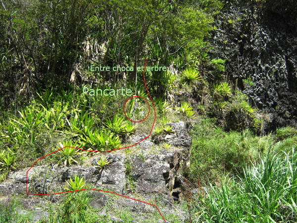 En longeant le Bras de la Plaine, repérer le grand champ de chouchous en face de la grotte bien marquée sur la carte en aval de l'Ilet Boulon. Repérer également la grotte en rive droite, baignée par un petit bras échappé du Bras de la Plaine. A partir de la grotte, marcher une cinquantaine de mètres en amont et trouver, sur un rocher couvert de chocas, la discrète pancarte, recouverte de végétation, indiquant l'Îlet Marron et la direction de l'Entre-Deux (cercle rouge). A cause du rocher, aucun sentier n'est visible avant d'avoir franchi le plus gros arbre, à gauche du trait rouge.