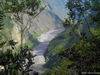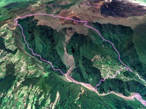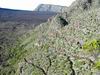 La sortie débute au plus près de la falaise basaltique qui entoure la caldeira formée par l'effondrement de la Rivière des Remparts un peu après le Nez de Bœuf. La descente (ici effectuée de nuit) est rapide vers la forêt domaniale sur un sentier bordé de branles verts. Les portions plates entre les lacets sont rares (Photo 1). Quelques marches en pierre ou encombrées de racines sont hautes et le sol peut être boueux ou glissant par endroits (Photo 2). La pente diminue, les bois de couleurs occupent tout le fond aux alentours de la Ravine Citron Galet. Certains spécimens sont énormes et magnifiques. D'autres créent des arches végétales obligeant à se baisser. Ils font doucement place aux goyaviers qui poussent dru mais le sentier est assez large pour ne pas être gêné. A la saison, il est même très agréable de faire le plein de vitamine C en goûtant les fruits faciles à cueillir. Mais la journée est longue et il ne faut pas trop traîner. La descente est régulière entre goyaviers ou dans les branles. Au milieu de la descente, on commence à voir Roche Plate qui s'éveille (Photo 3). Plus bas, quelques filaos ont souffert du passage récent de certains cyclones mais on s'approche sans encombre de Roche Plate. Juste avant de parvenir au hameau, le sentier est bordé de murets de pierres sèches (Photo 4). Roche Plate ne comporte que quelques cases et gîtes entourés de verdure (Photo 5). La rue principale n'est rien d'autre que le sentier bordé des mêmes murailles sèches. Les 4x4 dans les cours montrent que la piste vient désormais finir au cœur de l'îlet qui a longtemps été isolé par des heures de marche. Les quelques habitations se traversent en quelques minutes et il est trop tôt pour prendre une boisson dans un gîte. Le soleil est maintenant levé et on profite de l'ombre de la forêt de filaos qui se termine au Barrage de Mahavel. Ce barrage est en réalité un amoncellement de gravats et galets issus de l'effondrement d'une partie de la Falaise du côté de Mahavel couvert de plus en plus de filaos (Photo 6). Sur la gauche, l'imposant Rein de Bouc doit être difficile à grimper même en suivant l'arête. Depuis le lit de la rivière, on voit bien l'épaisseur du barrage qui s'effrite d'année en année (Photo 7). Affronter les trois kilomètres qui suivent en employant un maximum de la piste qui redescend vers Saint-Joseph. La vallée est large et il est plus agréable de marcher sur la piste que de sauter de rocher en rocher (Photo 8). Bien repérer le départ du Sentier du Dimitile, difficile à deviner si on n'a pas déjà reconnu ou parcouru ces tronçons. Si jusque là on a marché toujours en descente, la pente de l'Îlet Dimitile va très vite casser les jambes si on part trop vite. La montée est agréable au début mais devient de plus en plus abrupte sur un sentier étroit comportant peu de lacets. C'est en regardant vers la vallée qu'on voit la hauteur déjà parcourue (Photo 9). Les lacets sont rares au début, plus nombreux par la suite. Quelques échelles facilitent les passages rocheux (Photo 10). Une longue ligne presque droite suivant la courbe de niveau indique la fin proche de la grimpette. On arrive essoufflé, sans transition, des bois touffus à la verte prairie (Photo 11). Ne pas manquer, avant de poursuivre, le panorama sur l'aval de la Rivière des Remparts ou celui du Morne Langevin déjà bien éclairé. La traversée du plateau de Grand Coude, relativement longue sur pistes et route, permet de souffler un peu. Prendre le Chemin Théophile Gauthier jusqu'à la supérette et poursuivre par la rue Emile Mussard jusqu'au rempart de l'autre côté. Trouver sur la droite le sentier Tarzan qui relie Grand Coude à Grand Galet. Ce sentier, encore plus pentu que celui pris pour monter à Grand Coude est également difficile à trouver si aucune reconnaissance n'a été effectuée auparavant, mais il y a des cases habitées presque jusqu'au départ et les habitants le connaissent même si peu le pratiquent. Attention aux rochers glissants, aux marches de 80 cm et aux racines qui tiennent moins qu'on le voudrait parfois (Photo 12). Quelques bananiers et cultures annoncent la fin de la descente. Commence alors une montée douce et agréable jusqu'à l'abri de cap Blanc en longeant la Grande Ravine, souvent à Sec. Le sentier passe dans les longoses, dans les cannes fourragères en longeant des cultures ou dans les jouvences (Photo 13). Il reste même des cases habitées qu'on devine au caquètement des poules (Photo 14). Cette randonnée très longue ne permet pas de halte pour admirer bassins, cascades et l'arche naturelle le long de cette rivière qu'on franchit à gué un peu plus haut (Photo 15). La montée vers la Plaine des Sables débute à la passerelle qui enjambe la Ravine des Sept Bras (Photo 16). Le sentier chemine au début dans les chocas (Photo 17) avant d'arriver sous les filaos où il se recouvre de fines aiguilles le rendant glissant. Les pentes sont nombreuses mais encore supportables, surtout sous les filaos. A 1200 m, un panneau souhaite bon courage à ceux qui marchent dans cette direction. Bien profiter des moments plats à Grand Pays car la montée vers la Plaine des Sables est proche et sera plus difficile que depuis la Ravine des Sept Bras. On se retrouve en rive gauche de la Ravine de Grand Sable qui est proche et où le sentier chemine en courts lacets sur les flancs escarpés et parfois éboulés de la petite rivière. Certains gros éboulis ont d'ailleurs mis à mal le sentier à une époque (Photo 18). Les lacets n'en finissent plus mais la température fraîchit au fur et à mesure qu'on prend de l'altitude. On longe toujours la très curieuse Ravine de Grand Sable qui est une longue trainée de basalte (Photo 19). Le sentier balisé de blanc passe même dans le lit de la ravine par de fortes pentes où il est préférable qu'il n'y ait pas d'eau qui coule (Photo 20). La végétation disparaît p