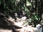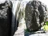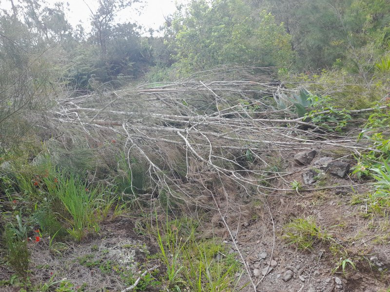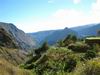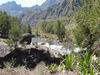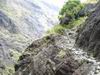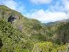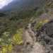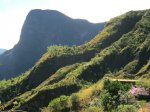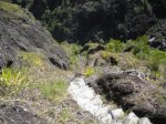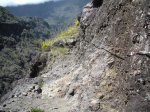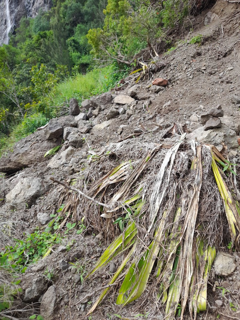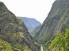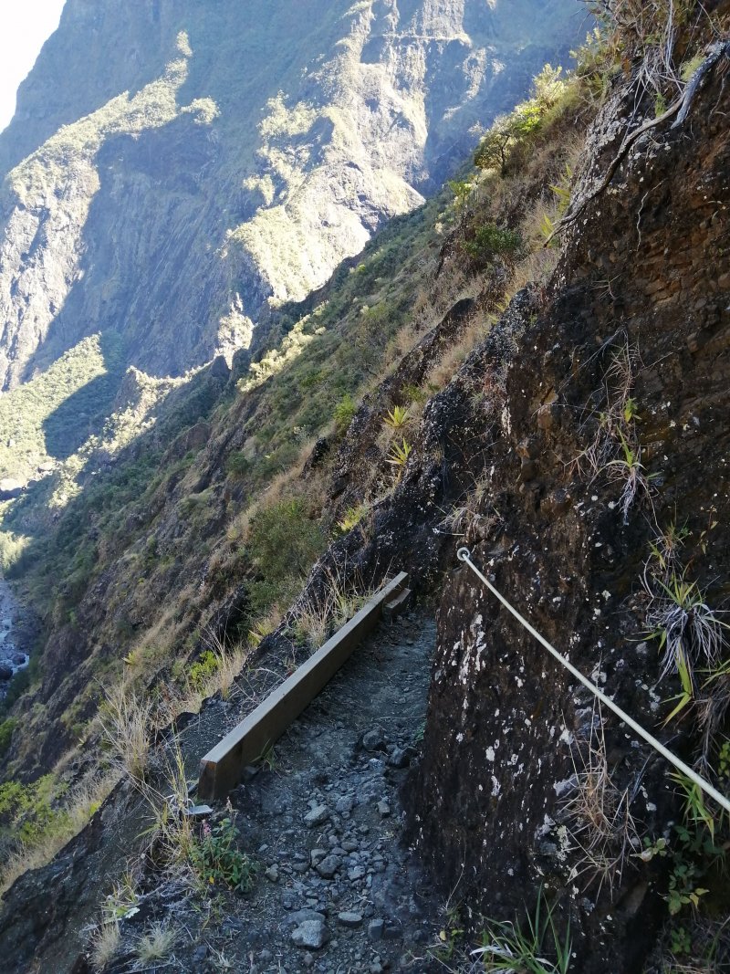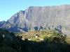 La randonnée débute à la Nouvelle, traverse ce grand îlet du Cœur du cirque et s’approche rapidement du rempart duquel on aperçoit le Bronchard qu’on remontera dans une heure. La descente est abrupte par moments sur un sentier d’assez bonne qualité qui comporte des parties glissantes. D’autres portions étroites sont équipées de longues mains courantes qui renforcent l’impression de sécurité. Il faut passer de longues échelles avant de franchir la Rivière des Galets qui a été un peu chamboulée par le passage de Béjisa en début d’année 2014 et peut nécessiter de passer dans l’eau (si le niveau est trop haut). Comme il n’y aura plus d’occasion de se mouiller, le mieux consiste à traverser en ôtant les chaussures. On retrouve presque en montée le pourcentage qu’on vient de franchir en descente. Ce sérieux effort se termine au col du Bronchard à deux pas du sentier qui fait le tour du sommet. Le sentier qui relie Roche Plate est une vraie partie de plaisir sous l’ombre des filaos. L’arrivée à l’école de Roche Plate permet de se désaltérer ou faire le plein d’eau au robinet. Suivre les indications qui montrent la direction de Trois Roches et débuter la partie la moins agréable du parcours en direction du gué sur la Rivière des Galets. La végétation comporte plus de pestes que sur le reste du parcours et la chaleur y est forte puisque le sentier longe au plus près le rempart qui piège l'air chaud. On distingue bien la Rivière des Galets qui coule dans un plus ou moins large canyon en aval de la Cascade de Trois Roches. On aperçoit bientôt les filaos qui entourent la chute et on peut enfin distinguer l’eau qui se précipite entre les falaises qui se touchent presque (photo 15 & photo 17). Un promontoire rocheux permet de s’en approcher sans trop de danger. On rejoint en quelques mètres le haut de la cascade et ses trois gros rochers (Photo 16) qui ont donné leur nom au lieu. Certains semblent prêts de tomber mais il faudrait pousser fortement pour les ébranler. L’approche pour la photo est ici beaucoup plus incertaine et il vaut mieux éviter de glisser. Si le débit est faible, on peut faire trempette dans la Rivière des Galets entre la cascade et le sentier qui remonte à la Nouvelle. On arrive après une bonne remontée à la Plaine aux Sables où paissent parfois quelques petites vaches (Photo 21). De là, on a de très belles vues sur le Gros Morne et le Morne de Fourche. La traversée est rapide et reposante avant d’attaquer la pente, parfois forte vers la Nouvelle. Elle n’est pas très longue mais paraît interminable et c’est avec plaisir qu’on arrive au col d’où l’on aperçoit les premières cases annonçant la fin de la boucle et le gîte où sont restées quelques affaires. Il est possible, pour les plus courageux de poursuivre vers la Plaine des Tamarins et remonter au Col des Bœufs mais rien de tel qu’une nouvelle nuit au frais après un bon rougail de saucisses.
