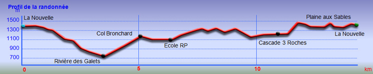 Se rendre à la Nouvelle (nombreuses solutions ; la plus simple étant de partir du Col des Bœufs) – Partir en direction de l’Ouest pour récupérer le sentier qui rejoint la Rivière des Galets par une forte descente – Traverser la Rivière et prendre en face la montée au Bronchard – Au col, laisser à droite le sentier du tour du sommet puis le Sentier de la Roche Ancrée pour gagner l’Îlet de Roche Plate – Traverser l’îlet et marcher jusqu’à l’école – Bifurquer à gauche pour rejoindre la Cascade de Trois Roches puis poursuivre le long de la Rivière jusqu’au croisement des sentiers de la Nouvelle et de Marla – Prendre à gauche vers la Plaine aux Sables – Traverser l’espace dénudé et remonter vers la Nouvelle, fin de la boucle.