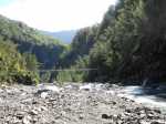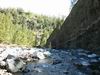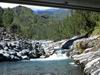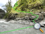 Après avoir rejoint la passerelle, suivre le cours d'eau sur une vingtaine de mètres puis repérer sur la rive gauche une avancée rocheuse dépassant d'une partie assez rectiligne de la roche, dans laquelle pousse un arbuste. Traverser la rivière puis filer sur la gauche en montant, tout d'abord à la passerelle puis très vite en montée forte vers la boucle. Il n'y a qu'une vingtaine de cm d'eau au moment de la traversée. On passe sur l'autre rive en voyant encore très bien la passerelle, comme sur la photo.