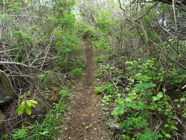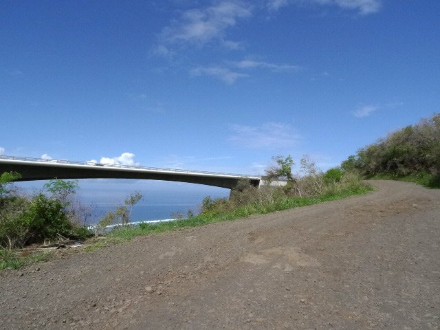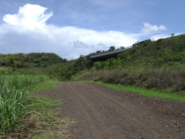 La randonnée débute au fond de l'aire de la Ravine Tabac. Quand on ne connait pas trop la région, il faut rouler doucement pour ne pas manquer l'entrée qui n'a rien d'évident mais qui est indiquée par un panneau. Une fois garé au fond du parking, on se retrouve face à une pancarte bleue indiquant un circuit de randonnée qui débute immédiatement par la piste qui franchit la Ravine Tabac quelques mètres plus loin. Comme cette route est accessible aux véhicules, on peut y rencontrer des énormes tas d'ordures plus ou moins odorants. Un grand bravo aux courageux qui sont "obligés" de charger un véhicule, rouler jusque là et décharger le tout sous une chaleur souvent insoutenable !!! De l'autre côté du tunnel, ce n'est guère mieux mais des poubelles sont néanmoins présentes même si d'autres courageux n'ont pas encore compris leur utilité. Cet écart vaut tout de même le déplacement car c'est d'ici qu'on a la meilleure vue sur la côte et les villes du littoral (Photo 1). On distingue bien les vagues qui se brisent sur les rochers sur la gauche ou le lagon vers la droite. La randonnée peut alors débuter en longeant la piste qui suit au plus près la Route des Tamarins (Photo 2). Au franchissement de la Ravine Tabac, on profite d'un point de vue sur le spot de surf de la Pointe des Trois Bassins (Photo 3). On distingue même les petits points noirs qui glissent sur les vagues. La piste est large, caillouteuse et surtout poussiéreuse. Il est fréquent d'y rencontrer des troupeaux de chèvres ou de petits bœufs moka qui cherchent leur pitance dans les acacias ou le long de la RN 1 (Photo 4). Sur la droite, la piste longe quelques prairies sans troupeaux. L'herbe est juste destinée à être séchée et récoltée pour la nourriture des élevages plus à l'ouest (Photo 5). Plus loin, ce seront des champs de canne qui longeront le parcours. On rencontre rapidement une petite colline qui permet de passer l'ère de service de la Saline (Photo 6). On domine toute la station et on profite de nouveaux larges panoramas jusqu'à l'Ermitage les Bains. On distingue également la totalité de la Saline les Bains et le lagon (Photo 7). En bas de la pente, on pourrait avoir envie de poursuivre sur la piste herbeuse qui longe les cannes mais le terrain est trop encombré. Suivre la piste qui remonte vers la Saline et qui débute en face de la station essence. Elle rejoint les bords de la Ravine de la Saline (voir carte car il y a plusieurs pistes). Certaines pistes sont privées et il ne faut pas les emprunter. Longer la piste jusqu'au départ du sentier, bien visible, qui part vers la gauche (Photo 10), franchit la ravine à sec en passant près de grosses touffes de bambou (et bien évidemment quelques nouvelles ordures) et retrouve une autre piste de l'autre côté. C'est la seule portion de la boucle qui est recouverte d'herbes qui peuvent être grandes à la saison (Photo 11) mais cela ne dure qu'une petite centaine de mètres. On retrouve la RN1 et ses vrombissements de moteurs. La piste qui lui est parallèle est belle, plane et facile à suivre (Photo 12). Marcher jusqu'à un tunnel qui permet d'accéder au Chemin Bruniquel pour ceux qui ne voudraient pas poursuivre. La piste se finit à un petit champ de canne à quelques mètres du Petit Bras de l'Ermitage et du pont qui l'enjambe. Il est donc très facile de viser l'escalier qui y descend en longeant le grillage de l'autoroute sur une vingtaine de mètres. Dès qu'on atteint le fond de la ravine, il n'y aura plus aucune difficulté pour revenir au point de départ car on suit sans interruption le Chemin Bruniquel (Photo 13). Les cannes et quelques cultures recouvrent l'ensemble des terres cultivables (Photo 14). On peut se poser parfois la question de savoir la direction à prendre mais, la carte en main, on revient sans hésitation vers le point de départ. La Route des Tamarins, même si on s'en éloigne assez, est toujours le point de repère à garder en mémoire (Photo 15). La piste large et facile sillonne encore entre les champs de canne ou les maraîchages avec de nouveaux panoramas sur le lagon (Photo 16). Les arroseurs sont toujours en action mais la canne a beaucoup plus de mal qu'ailleurs à atteindre des hauteurs correctes et les rendements sont beaucoup plus bas que dans le Sud Sauvage ou dans le Nord du département. La piste, toujours en bon état, passe au plus près de l'autre station en bordure d'autoroute puis se rapproche de plus en plus du bruit des véhicules. A l'approche de la Ravine Tabac, il faut quitter cette direction puis passer sous la voie rapide et rejoindre le chemin pris au départ (Photo 17). Prendre le même itinéraire qu'en début de boucle pour retrouver le parking de l'Aire du Tabac, fin de la randonnée.