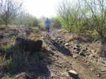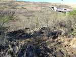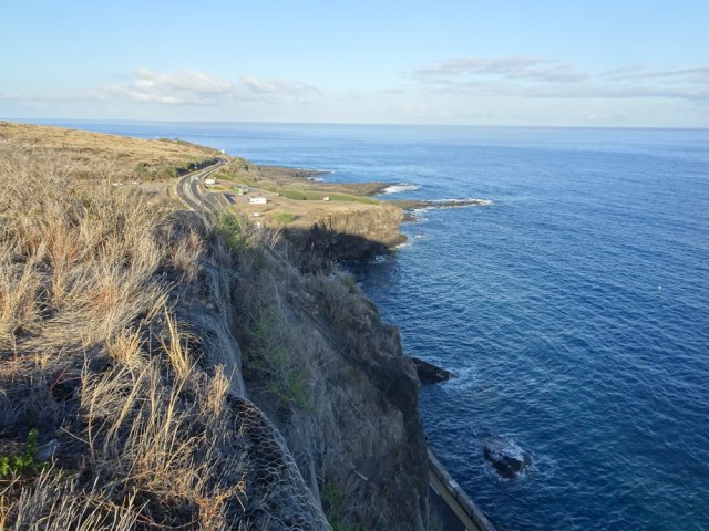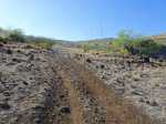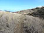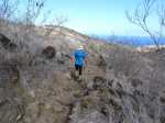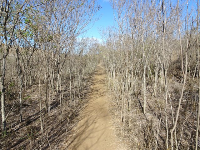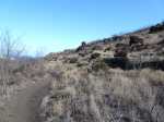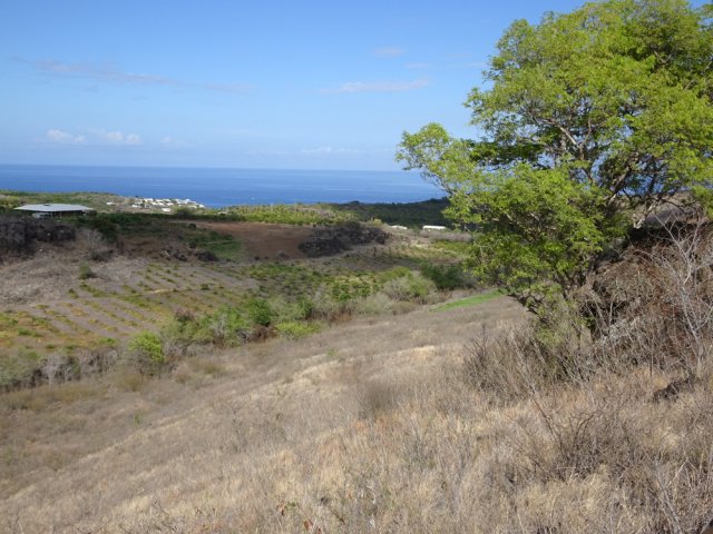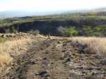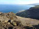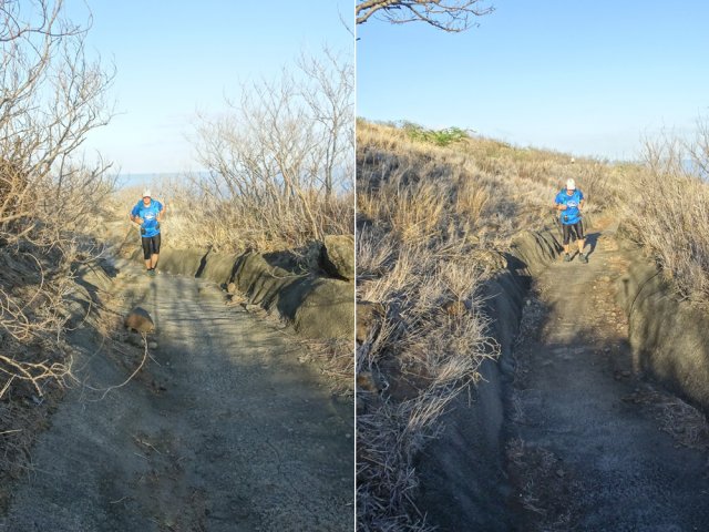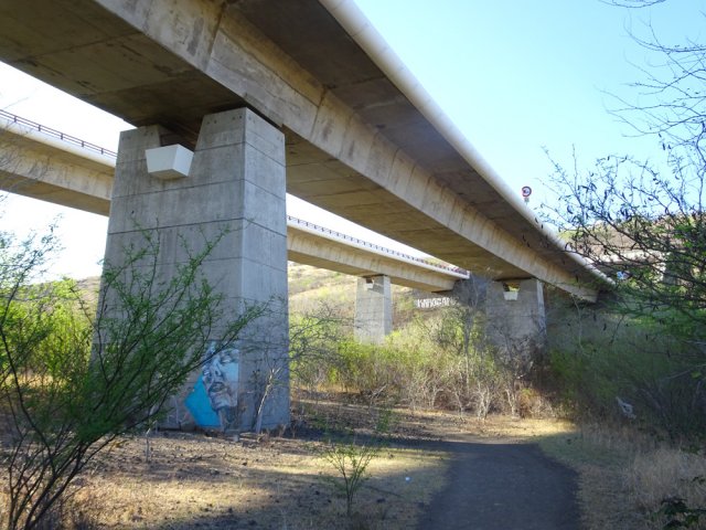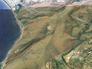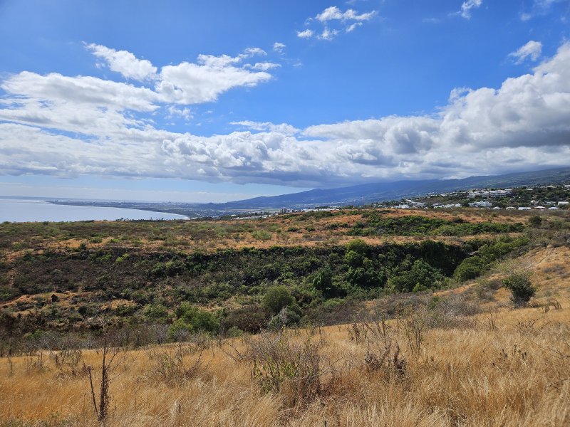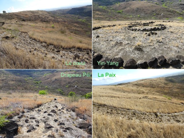 La randonnée débute par la petite route goudronnée située en face du parking du Cap la Houssaye et se transforme très vite en piste terreuse (Photo 1). Repérer, quelques mètres après la barrière, cette ravine sur la gauche dont tout le fond et les rives ont été gunités. Cette couche de béton est un vrai plaisir pour la marche car les herbes n'y poussent pas et les cailloux y sont rares (photo 2). Ne pas hésiter à suivre cette ravine sur un kilomètre. Le vide est parfois tout près et on peut à loisir profiter des panoramas sur la mer et sur les falaises en direction du Cap La Houssaye (photo 3). Elle monte tout d'abord avant de redescendre en direction de la Barrière (Photo 4). La végétation s'intensifie aux abords de la petite ravine qu'on rencontre dans le bas. Sur la gauche, on se retrouve au sommet de la cascade où Jace a peint son Gouzou pendu par le pied à un gros clou (Photo 5). On remarque ainsi qu'il manie aussi bien le harnais et le rappel que la bombe de peinture. Laisser la ravine bétonnée, bifurquer à droite lorsque la ravine finit sa descente, rejoindre le chemin après de nouvelles montées bétonnées et un sentier en terre. On se retrouve sur le plateau de la savane qu'on ne quittera jamais jusqu'au retour (Photo 6). Poursuivre sur la piste et ne pas manquer un écart pour un nouveau point de vue sur le hameau de la Barrière (Photo 7). On y voit la baie de Saint-Paul, les plages de sables gris et les falaises du Cap la Marianne. Plus haut, un croisement de plusieurs sentiers se situe en face de la descente vers la Barrière. Trouver le sentier qui file plein sud. Plus ou moins large, il est toujours très facile et en faible pente (photo 8). On parvient à une piste plus large fermée par une barrière, juste en face de la Ravine Fleurimont (Photo 9). Pas de difficulté pour rejoindre les ponts parallèles de la RN1, passer dessous et filer à droite en direction de la Ravine (photo 10). Là également, la marche est agréable car le terrain est en pente très douce (Photo 12). La montée s'accentue sur un sol de plus en plus rocailleux et l'on domine la Ravine Fleurimont (Photo 13). Une rencontre est possible avec quelques bovins venant brouter dans cette savane (Photo 15). La personne qui les accompagne et les garde est très aimable et profite d'une rencontre pour discuter, contrairement aux nombreux sportifs ne répondant jamais à un bonjour. Sans doute la courtoisie des plaines, à 150 m d'altitude, est-elle différente de celle des hauts sommets ? Les maisons de Plateau Caillou sont proches et l'humidité saisonnière de la ravine a permis l'installation d'une végétation plus haute constituée essentiellement de bois noirs des bas, chocas et épineux (photo 16). La Ravine Fleurimont et son petit affluent se traversent sans trop s'en apercevoir. Le sentier entame une grimpette vers l'héliport de Plateau Caillou souvent repérable aux engins qui décollent ou atterrissent (Photo 17). Une fois la piste d'envol passée, prendre à gauche vers l'héliport et repérer, plus loin, le sentier qui part à droite et descend en direction de la Ravine de Boucan Canot qu'on longe en rive gauche. On aperçoit d'ici la fin des tunnels et les deux ponts sous lesquels on passera bientôt (Photo 18). Le sentier, souvent rocheux, est bien marqué dans la végétation par les incessants passages. On parvient rapidement sous les deux ponts de la RN1. Certains arbres sont déplumés dans le haut à cause des dizaines de tisserins qui ont élu domicile et l'on piétine au passage tous les nids détachés par les femelles insatisfaites du travail acharné des mâles. Longer la ravine jusqu'à la route bétonnée que l'on n'emprunte pas car un sentier débute une dizaine de mètres avant. Le cheminement s'effectue à plat à travers quelques arbustes rabougris (Photo 19). Devant, on aperçoit une colline comportant des géoglyphes obtenus en tondant l'herbe et en y rajoutant des pierres (Photo 20). Rien à voir avec Nazca au Pérou où les figures font souvent plusieurs centaines de mètres ! Poursuivre en rive gauche avant de traverser la ravine et continuer sur le même type de sentier en prenant à droite à la première bifurcation (Photo 21). On parvient très vite en face de ces géoglyphes représentant un cœur, un signe yin-yang, un symbole de paix et le drapeau réunionnais. Une fois sur place, difficile de reconnaître les signes qui sont trop grands (Photo 23). Un sentier serpente entre les figures et quitte le drapeau en son milieu pour filer à l'ouest vers la Ravine Boucan Canot. La descente, un peu sportive, passe entre deux tamarins caractéristiques (Photo 24). Le sentir remonte ensuite vers le nord et rejoint la petite vallée de la Ravine Patent Slip (voir § ci-dessous). Il traverse des zones rocheuses et très caillouteuses et peut devenir technique sur quelques dizaines de mètres (Photo 25). Il se rapproche de la ravine à sec (Photo 26), la traverse et pénètre dans une zone de rochers plantés sur la rive (Photo 27). On aperçoit bientôt les véhicules stationnés sur le parking, fin de la boucle.