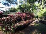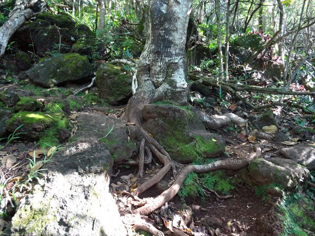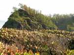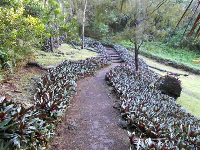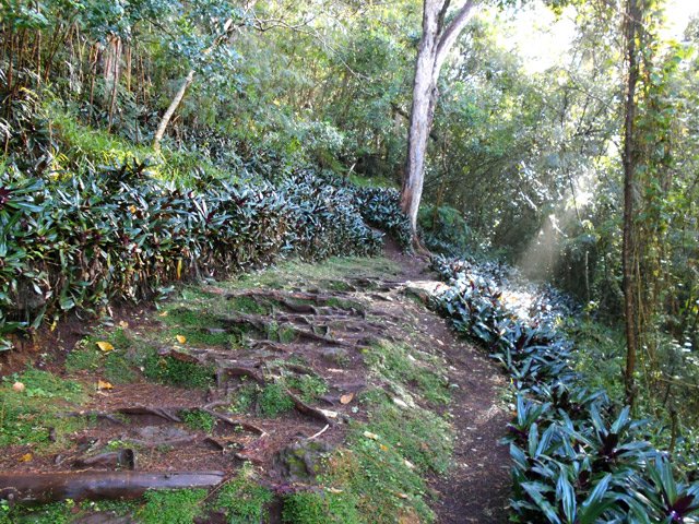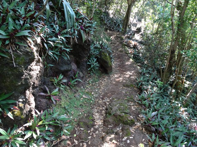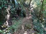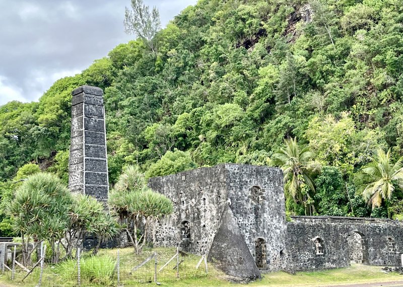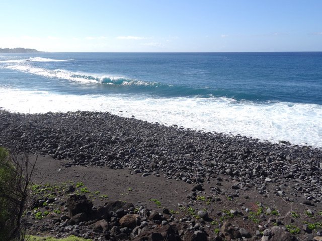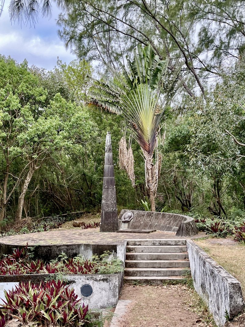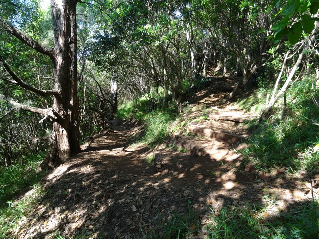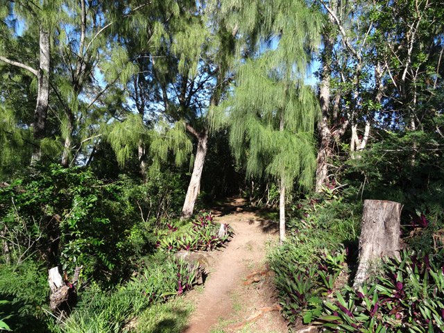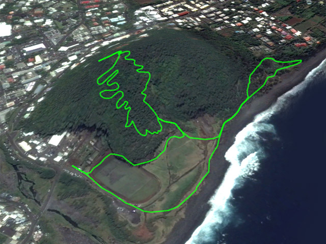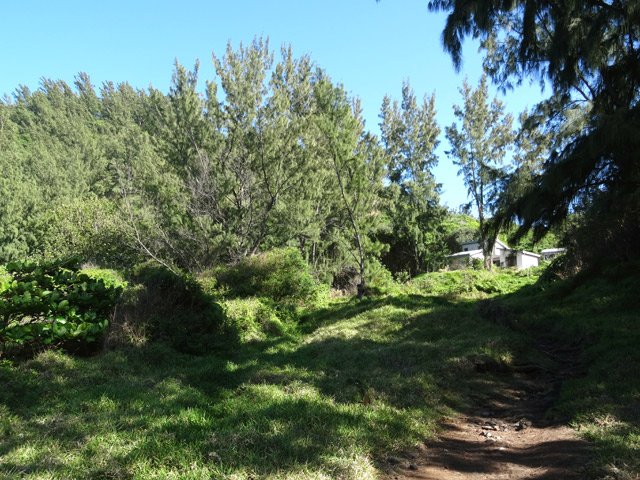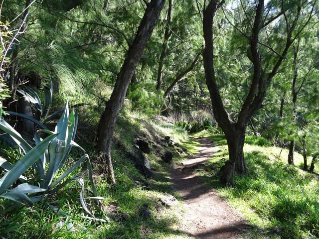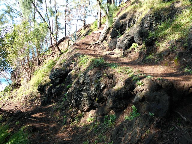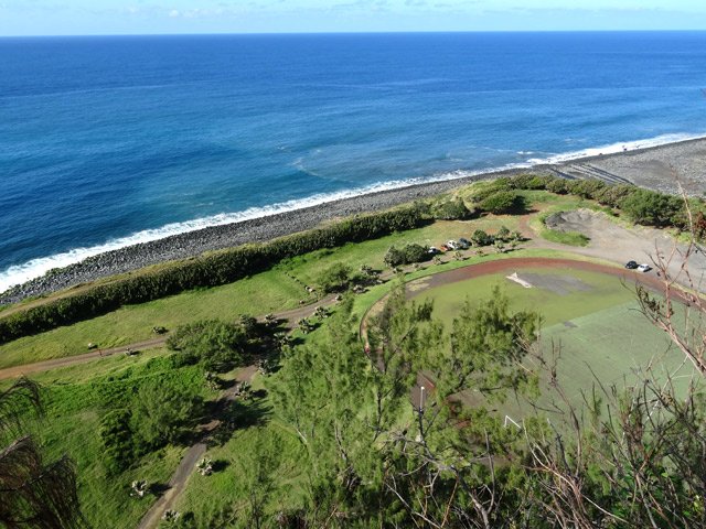 La randonnée débute en bordure de l'océan, près du radier régulièrement emporté par les crues cycloniques. Un grand parking proche de la ruine de l'usine sucrière accueille les sportifs de Saint-Joseph venant effectuer ce parcours. La piste longe le stade et la Rivière des Remparts qu'on a du mal à apercevoir en raison de la végétation. Elle oblique vers la gauche pour suivre la côte en se transformant en sentier (Photo 1). Si la mer est forte, attention aux embruns sur l'objectif de l'appareil photo. On a le piton sur la gauche en partie caché par les raisiniers qui ont du mal à pousser à cause du vent qui les penche sur le côté (Photo 2). Poursuivre sur une belle portion aménagée sous les filaos sur un très large sentier terreux bordé de cailloux (Photo 5). Continuer jusqu'à la falaise par un sentier qui borde les galets de la plage. Un emplacement de bivouac envahi par les cactus pitaya et entouré de galets permet de se mettre à l'abri du vent. Prendre à gauche sur un sentier étroit dans les grandes herbes (Photo 6), couper la piste qui remonte vers la ville et continuer en longeant la falaise sur un sentier à l'ombre des filaos (Photo 7). On retrouve la piste avant d'obliquer en direction de la falaise (Photo 8) et de la Caverne des Hirondelles (Photo 9). Ne pas déranger les salanganes qui viennent raser les cavités pour y saisir les insectes. La montée peut commencer sur un large sentier entouré de tradescantiaLes Tradescantia ou setcréasées sont des plantes herbacées monocotylédones de la famille des Commelinaceae. C'est un genre d'environ 75 espèces regroupant des plantes venant d'Amérique, aux feuilles engainantes et aux fleurs à trois pétales. Wikipedia, un grand classique de l'ornement des jardins qui donne de belles couleurs carmin ou vertes (Photo 10). La pente est raide parfois, les marches hautes et les parties plates rares (Photo 11). On parvient un peu essoufflé au sommet pour profiter du calme de l'esplanade à l'ombre des grands filaos (Photo 14). Rendre une visite au monument d'Auguste Babet (Photo 15) ou redescendre un peu sur la piste venant de la ville (Photo 13). Ce petit écart au milieu de grandes étendues de tradescantia permet de constater les dégâts occasionnés aux lampes par des vandales. Profiter également des magnifiques panoramas sur la vallée de la Rivière des Remparts (Photo 17) avant d'entamer le sentier de descente (Photo 18). Ce sentier, toujours en sous-bois, descend par de nombreux lacets. Il remonte parfois pour effectuer un contour de rocher ou de gros arbre. On y trouve des portions plates (Photo 19), d'autres constituées de hautes marches (Photo 20) ou passant sur des racines (Photo 21). Après plusieurs de ces lacets, un minuscule sentier part sur la droite et arrive en quelques mètres sur un petit promontoire pour un beau point de vue sur la ville vers la Petite Île qu'on aperçoit au loin (Photo 23). Dans le dernier lacet (Photo 24), un hors sentier de 10 mètres donne l'occasion d'un nouveau point de vue sur le stade (Photo 25). Comme un incendie a détruit cette partie du piton, la terre est pour le moment assez glissante. On rejoint enfin le sentier pris dans la montée. Bifurquer sur la droite pour passer devant la Caverne des Hirondelles et les spots d'escalade (Photo 27) puis rejoindre l'usine en suivant la triste piste d'athlétisme qui a très mal vieilli.