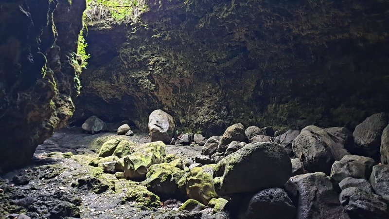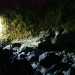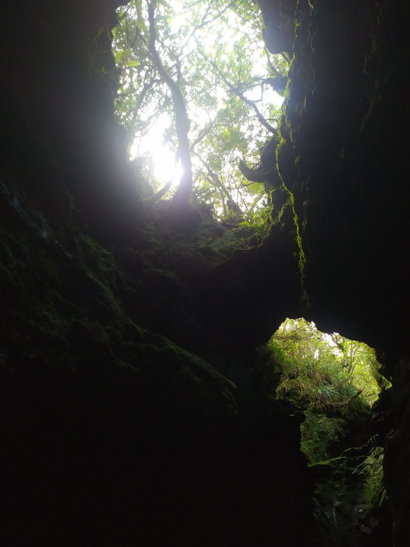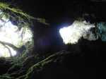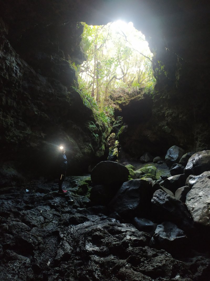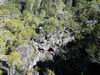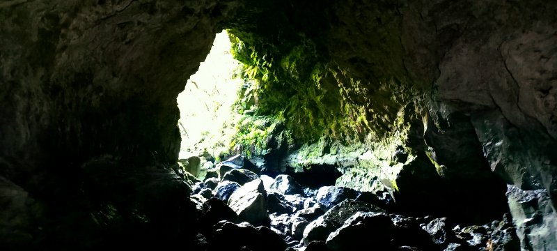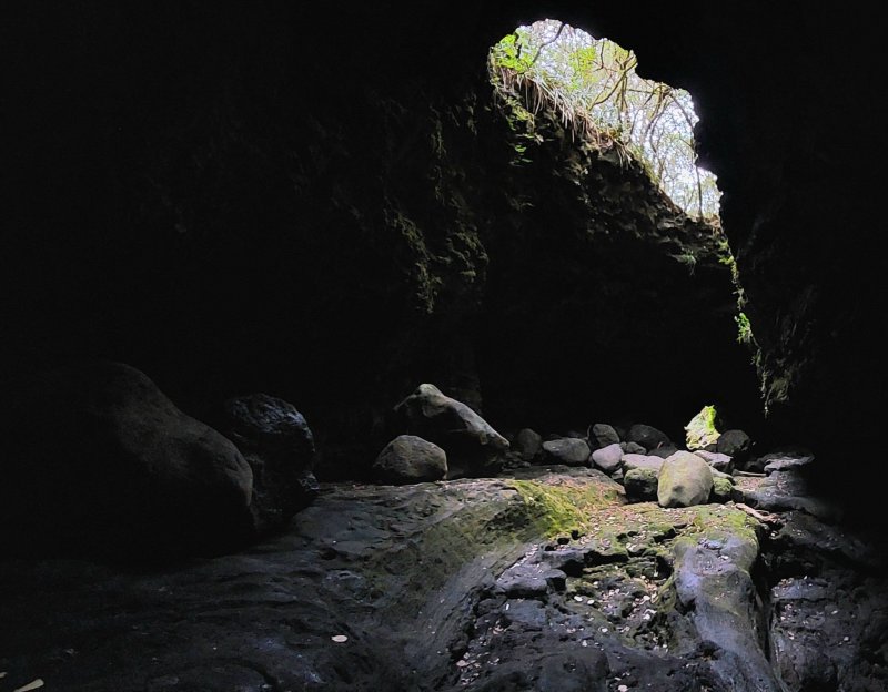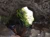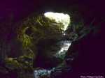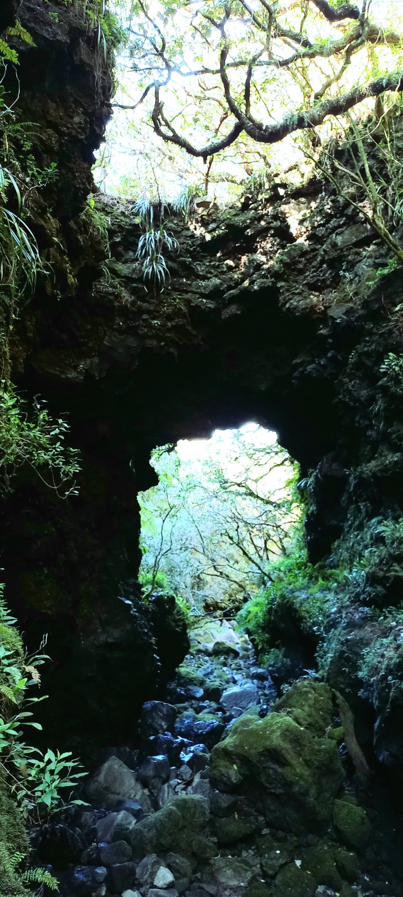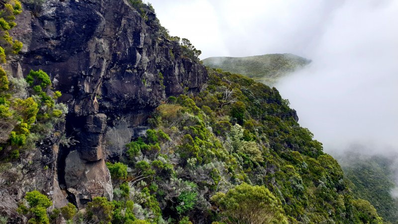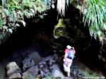La sortie débute au plus près du rempart de la Rivière des Remparts, cette caldeira presque verticale qui isole l'îlet de Roche Plate de la zone du Volcan. Le sentier, constitué de marches nombreuses en bois et en pierre est assez étroit et en forte pente dans les branles qui le bordent (Photo 1). Il comporte d'assez nombreux lacets, des parties vertigineuses protégées de rambardes ou isolées du vide par la végétation (Photo 2). Le haut de la vallée de la Rivière des Remparts est totalement recouverte d'une belle forêt de bois de couleurs visitée uniquement des braconniers et des spéléologues à la recherche de nouveaux tunnels (Photo 3). La descente dure moins d'une heure pour rejoindre les superbes mapous et autres énormes arbres qu'on trouve dans la zone humide à la fin du sentier (Photo 4). L'endroit porte d'ailleurs le nom de cet arbre très présent à l'aire discrète que tout le monde utilise pour se reposer ou se ravitailler. Les premières grottes se situent à la fin de la descente et sont faciles à repérer. Quand on arrive à la pancarte en bois qui indique les directions, prendre à gauche le petit sentier arrivant très vite à l'effondrement qui paraît inaccessible. Longer la paroi sur quelques mètres sur de gros rochers moussus et descendre dans le lit de la rivière. La descente est très délicate et les racines indispensables pour se maintenir. Le premier tunnel est situé immédiatement sur la droite. Attention aux gros rochers lisses, humides ou moussus, en permanence arrosés par les gouttelettes tombant du plafond (Photo 5). Le tunnel lui-même est moins beau que ceux plus récents qui se visitent dans le Grand Brûlé. Le cadre, en revanche, surpasse largement. C'est le début d'une originale balade sportive dans un monde minéral peu connu puisque difficile d'accès. La lampe devient souvent indispensable pour apercevoir la suite de la galerie ou admirer quelques anciennes coulures accrochées au plafond (Photo 6). Les portions courtes sont naturellement éclairées par les rayons du soleil mais la lampe permet de surveiller où poser le pied (Photo 7). Profiter de l'effet de lumière qui passe par les ouvertures faites dans le plafond par les effondrements successifs (Photo 8). On peut ainsi se promener à l'ombre et à la fraîcheur pour se rapprocher d'une superbe arche naturelle surmontée par une trouée de la voûte (Photo 9). On a du plaisir à parcourir le fond du torrent à sec même s'il n'y a pas de tunnel (Photo 10). La pente devient un peu plus forte et s'approche d'une merveille de la nature représentée par le tunnel qui file vers le bas, surmonté d'une arche et d'une trouée où s'infiltrent les rayons (Photo 11). On retrouve ces lumières irisées à plusieurs endroits à condition de passer à la bonne heure, quand le soleil est haut (Photo 12). La descente prend fin à l'approche d'une profonde cavité creusée par une cascade, équipée par les professionnels mais infranchissable au randonneur. Il faut donc remonter à la surface, mais sans regret, car peu de gens peuvent admirer ces paysages uniques. Il est possible de remonter la ravine Citron Galet en amont du sentier mais on ne trouvera plus de ces tunnels. Reprendre le discret sentier pour retrouver l'ombre des mapous ou grands tamarins des hauts. Le sentier se poursuit vers Roche Plate, d'abord plat et humide avant de descendre de plus en plus en alternant les portions terreuses, basaltiques, caillouteuses (Photo 14 et Photo 18). On distingue très bien sur les photos satellites d'énormes cavités sur la gauche du sentier lorsqu'on descend. Elles ont toutes été visitées et de très discrètes sentes envahies de végétation permettent de s'en approcher au plus près. Attention de bien regarder où on met les pieds car la cassure arrive sans avertir et une chute serait fatale malgré la végétation qui a envahi ces énormes trous de plus de 20 mètres de diamètre (Photo 15 et16). Une astuce pour repérer ces minuscules sentiers : ils sont à peine visibles mais comportent presque tous un caillou de lave pour en marquer le début. Il est tout à fait normal que les professionnels ne créent pas de sentier officiel ou ne posent pas de cairns qui attireraient tout un chacun de passage dans le coin. Ces visites s'effectuent donc au gré de chacun. La carte ci-dessous marque trois de ces emplacements reconnus ; deux très visibles, un autre un peu plus bouché par la végétation. Les voir tous nécessiterait plusieurs heures supplémentaires. On reprend donc la descente jusqu'à la cascade de la Ravine Citron Galet, facile à repérer s'il y a de l'eau car elle coule à deux mètres du sentier avant de plonger dans une cavité sans fond et dangereuse (Photo 19). Si elle est à sec, comme ici, trouver le seul vrai départ de sentier sur la droite depuis le début de la descente (la cascade est marquée réglementairement d'un trait bleu sur la carte IGN). Prendre garde pour passer le haut de la chute puis remonter la ravine jusqu'à l'entrée d'un tunnel (Photo 20). Visiter ce nouveau havre de fraîcheur proposant également des trouées dans le plafond en partie bouchées par la végétation (Photo 21). L'endroit, plus court que les précédents, offre les mêmes lumières que plus haut (Photo 23). Le haut du tunnel est barré par une cascade et une pente forte s'il n'y a pas d'eau (Photo 24). Il faut donc rebrousser chemin jusqu'à la cascade du départ. Pourquoi ne pas rajouter un peu d'aventure supplémentaire en bifurquant à droite à la cascade et en rejoignant la ravine après avoir traversé une partie de la forêt de bois de couleurs. Les rives ne sont pas toutes abruptes et on rejoint facilement les galets après une centaine de mètres. Il suffit alors, après avoir flâné à la recherche de nouvelles curiosités, de prendre en rive gauche pour rejoindre le sentier en traversant une végétation facile à franchir. On peut désormais rejoindre le poi