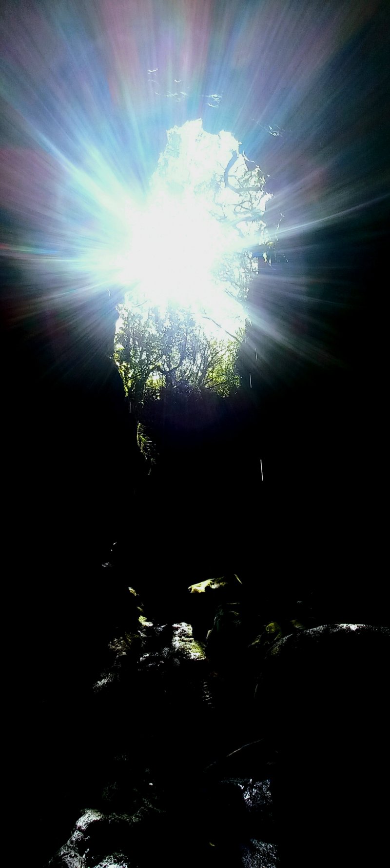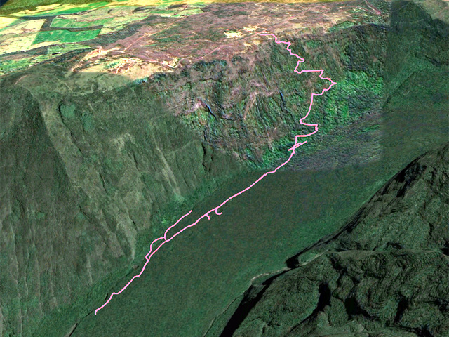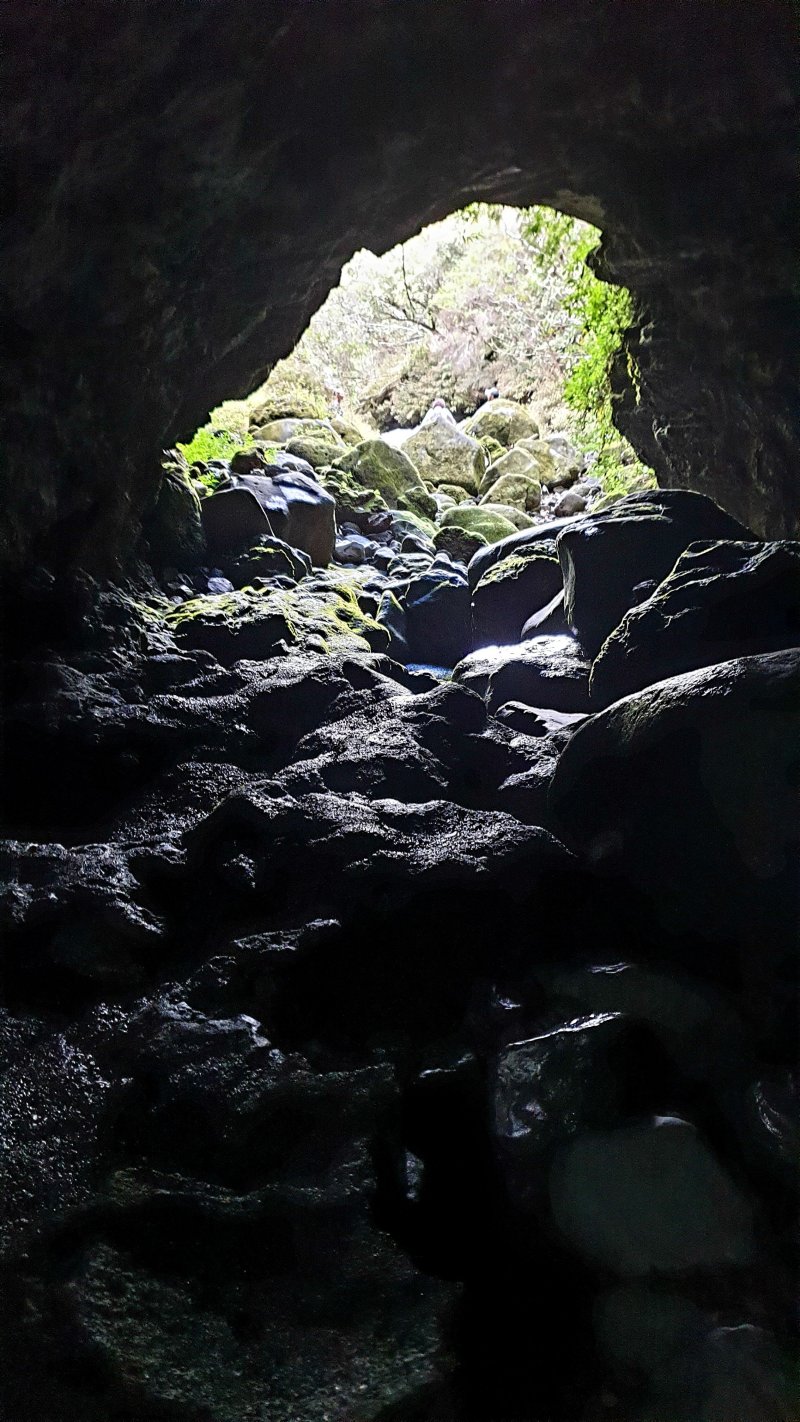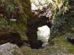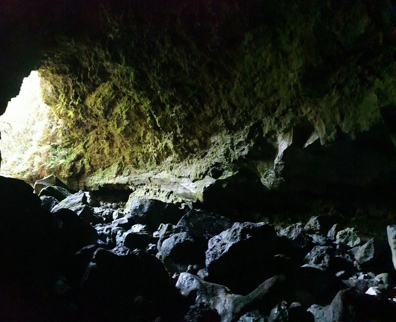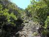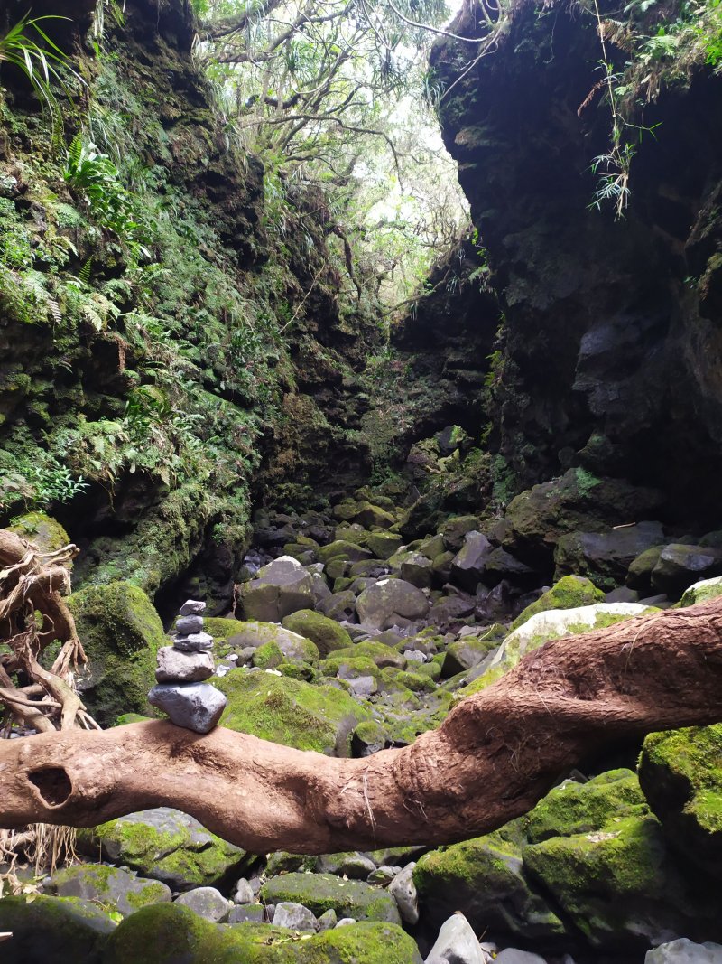 La sortie débute au plus près du rempart de la Rivière des Remparts, cette caldeira presque verticale qui isole l'îlet de Roche Plate de la zone du Volcan. Le sentier, constitué de marches nombreuses en bois et en pierre est assez étroit et en forte pente dans les branles qui le bordent (Photo 1). Il comporte d'assez nombreux lacets, des parties vertigineuses protégées de rambardes ou isolées du vide par la végétation (Photo 2). Le haut de la vallée de la Rivière des Remparts est totalement recouverte d'une belle forêt de bois de couleurs visitée uniquement des braconniers et des spéléologues à la recherche de nouveaux tunnels (Photo 3). La descente dure moins d'une heure pour rejoindre les superbes mapous et autres énormes arbres qu'on trouve dans la zone humide à la fin du sentier (Photo 4). L'endroit porte d'ailleurs le nom de cet arbre très présent à l'aire discrète que tout le monde utilise pour se reposer ou se ravitailler. Les premières grottes se situent à la fin de la descente et sont faciles à repérer. Quand on arrive à la pancarte en bois qui indique les directions, prendre à gauche le petit sentier arrivant très vite à l'effondrement qui paraît inaccessible. Longer la paroi sur quelques mètres sur de gros rochers moussus et descendre dans le lit de la rivière. La descente est très délicate et les racines indispensables pour se maintenir. Le premier tunnel est situé immédiatement sur la droite. Attention aux gros rochers lisses, humides ou moussus, en permanence arrosés par les gouttelettes tombant du plafond (Photo 5). Le tunnel lui-même est moins beau que ceux plus récents qui se visitent dans le Grand Brûlé. Le cadre, en revanche, surpasse largement. C'est le début d'une originale balade sportive dans un monde minéral peu connu puisque difficile d'accès. La lampe devient souvent indispensable pour apercevoir la suite de la galerie ou admirer quelques anciennes coulures accrochées au plafond (Photo 6). Les portions courtes sont naturellement éclairées par les rayons du soleil mais la lampe permet de surveiller où poser le pied (Photo 7). Profiter de l'effet de lumière qui passe par les ouvertures faites dans le plafond par les effondrements successifs (Photo 8). On peut ainsi se promener à l'ombre et à la fraîcheur pour se rapprocher d'une superbe arche naturelle surmontée par une trouée de la voûte (Photo 9). On a du plaisir à parcourir le fond du torrent à sec même s'il n'y a pas de tunnel (Photo 10). La pente devient un peu plus forte et s'approche d'une merveille de la nature représentée par le tunnel qui file vers le bas, surmonté d'une arche et d'une trouée où s'infiltrent les rayons (Photo 11). On retrouve ces lumières irisées à plusieurs endroits à condition de passer à la bonne heure, quand le soleil est haut (Photo 12). La descente prend fin à l'approche d'une profonde cavité creusée par une cascade, équipée par les professionnels mais infranchissable au randonneur. Il faut donc remonter à la surface, mais sans regret, car peu de gens peuvent admirer ces paysages uniques. Il est possible de remonter la ravine Citron Galet en amont du sentier mais on ne trouvera plus de ces tunnels. Reprendre le discret sentier pour retrouver l'ombre des mapous ou grands tamarins des hauts. Le sentier se poursuit vers Roche Plate, d'abord plat et humide avant de descendre de plus en plus en alternant les portions terreuses, basaltiques, caillouteuses (Photo 14 et Photo 18). On distingue très bien sur les photos satellites d'énormes cavités sur la gauche du sentier lorsqu'on descend. Elles ont toutes été visitées et de très discrètes sentes envahies de végétation permettent de s'en approcher au plus près. Attention de bien regarder où on met les pieds car la cassure arrive sans avertir et une chute serait fatale malgré la végétation qui a envahi ces énormes trous de plus de 20 mètres de diamètre (Photo 15 et16). Une astuce pour repérer ces minuscules sentiers : ils sont à peine visibles mais comportent presque tous un caillou de lave pour en marquer le début. Il est tout à fait normal que les professionnels ne créent pas de sentier officiel ou ne posent pas de cairns qui attireraient tout un chacun de passage dans le coin. Ces visites s'effectuent donc au gré de chacun. La carte ci-dessous marque trois de ces emplacements reconnus ; deux très visibles, un autre un peu plus bouché par la végétation. Les voir tous nécessiterait plusieurs heures supplémentaires. On reprend donc la descente jusqu'à la cascade de la Ravine Citron Galet, facile à repérer s'il y a de l'eau car elle coule à deux mètres du sentier avant de plonger dans une cavité sans fond et dangereuse (Photo 19). Si elle est à sec, comme ici, trouver le seul vrai départ de sentier sur la droite depuis le début de la descente (la cascade est marquée réglementairement d'un trait bleu sur la carte IGN). Prendre garde pour passer le haut de la chute puis remonter la ravine jusqu'à l'entrée d'un tunnel (Photo 20). Visiter ce nouveau havre de fraîcheur proposant également des trouées dans le plafond en partie bouchées par la végétation (Photo 21). L'endroit, plus court que les précédents, offre les mêmes lumières que plus haut (Photo 23). Le haut du tunnel est barré par une cascade et une pente forte s'il n'y a pas d'eau (Photo 24). Il faut donc rebrousser chemin jusqu'à la cascade du départ. Pourquoi ne pas rajouter un peu d'aventure supplémentaire en bifurquant à droite à la cascade et en rejoignant la ravine après avoir traversé une partie de la forêt de bois de couleurs. Les rives ne sont pas toutes abruptes et on rejoint facilement les galets après une centaine de mètres. Il suffit alors, après avoir flâné à la recherche de nouvelles curiosités, de prendre en rive gauche pour rejoindre le sentier en traversant une végétation facile à franchir. On peut désormais rejoindre le poi