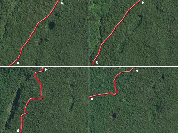 Un coup d'œil rapide à la photo satellite de la zone montre une multitude d'autres trous, cavités, effondrements, entrées de tunnels ou longues failles d'effondrement. Le trait rouge représente le tracé du sentier en direction de Roche Plate. Chaque cavité a été souvent explorée par des équipes de canyoneurs curieux de mieux connaître le sous-sol. S'ils peuvent s'en approcher pour descendre au fond, le randonneur peut également s'approcher pour en voir le bord. La seule difficulté réside dans l'art de retrouver la trop discrète sente utilisée quelques fois pour leur exploration. Ne pas oublier le caillou !! Les curieux responsables ne manqueront pas d'en découvrir d'autres.