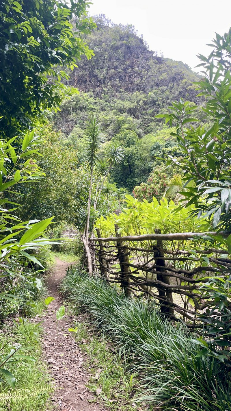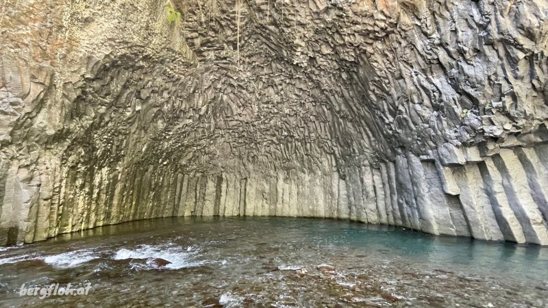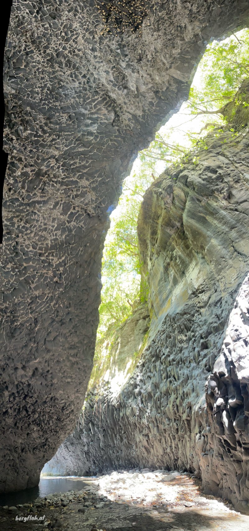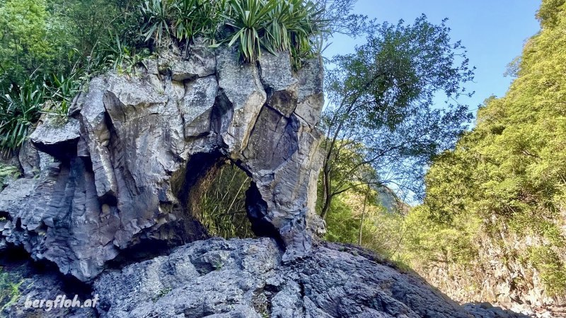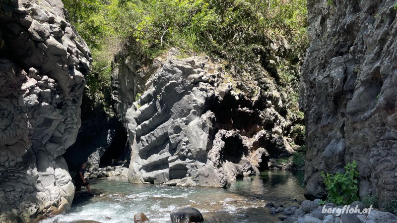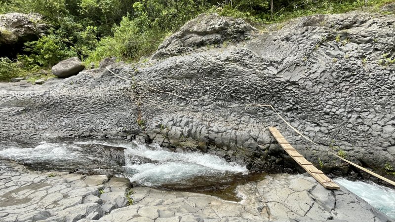 La randonnée débute au Dassy où de nombreux emplacements de stationnement sont situés le long de la RD26 ou dans un parking privé à quelques euros de la journée. Débuter la très classique descente au Pont de la Liane en longeant tout d'abord un champ de canne à sucre puis en plongeant le long du rempart sur un sentier très fréquenté usé par les semelles des joggers (Photo 1). Quelques rambardes en bois sont installées dans les premiers mètres. Sans être une balade, le trajet est à la portée de tous sur des portions de sentier toujours larges mais très souvent encombrées de pierres. La descente facile est agréable avec quelques vues plongeantes sur la vallée. Le sentier longe des zones rocheuses qui abritent comme souvent des oratoires rouges, blancs ou bleus. Quelques portions sont aménagées avec des marches en rondins. D'autres ont été construites sur de véritables murs pour franchir des parois. On parvient en fin de descente à de petits îlets abandonnés ou remis en valeur depuis quelques années. Longer l'un de ces îlets sur un sentier bordé de murets de pierres sèches, de bananiers ou de manguiers. Poursuivre jusqu'au Pont de la Liane et profiter de la vue sur le bas de la rivière ou vers l'amont que l'on empruntera dans quelques minutes (Photo 2). Remonter vers le Dassy de quelques mètres et emprunter un des sentiers qui rejoint la berge. A partir de là il n'y a plus à réfléchir pour rechercher un sentier. Inutile de se munir de la trace GPS qui n'est qu'indicative ; de plus les appareils ne reçoivent pas l'éclairage des satellites dans les gorges étroites. On débute en face d'un beau pisse en l'air qui n'a malheureusement de l'eau qu'après les pluies (Photo 3). La marche s'effectue tout d'abord en rive gauche dans le sable gris et les galets. Un premier gué impose de se mouiller les pieds. Inutile de se déchausser car il faudrait rajouter deux bonnes heures à cette boucle vu le nombre de futures traversées. On laisse à droite la dernière cascade du Bras de Pontho, à sec. La marche est agréable malgré les franchissements jusqu'à l'arche minérale située en rive gauche (Photo 4). On peut l'atteindre sans problème en partant sur la droite pour une photo originale. Après la visite à cette curiosité géologique, repartir vers l'amont en cherchant toujours le meilleur passage, soit le long de la rivière encombrée de gros galets, soit dans l'eau. Les gorges qui suivent sont banales, l'eau y est peu profonde et on marche les pieds à peine mouillés ou sur l'étroite bande sableuse qui sépare de la falaise (Photo 6). L'eau est fraîche et le courant jamais très fort. On s'approche, sans les voir, de quelques habitations sur le plateau qui domine où seules des pancartes d'interdiction ou des échelles permettent de deviner la présence de vie. Les gorges proprement dites débutent à une muraille au bord du lit de la rivière équipée par les alpinistes pour d'impressionnantes grimpées. L'endroit est magnifique. Sur la droite, dans le coude de la rivière, l'eau a creusé une grande cavité qu'on rejoint facilement (Photo 7). A partir de ce point, on pénètre dans la gorge, inoubliable, qu'on suivra en fonction du niveau de l'eau ou de la force du courant. Débute une suite ininterrompue de grottes, cavités, coudes, orgues et parties étroites du canyon où la lumière a parfois du mal à pénétrer (Photo 9). D'autres spots d'escalade se dénichent aux anneaux brillants fixés au mur ou aux passionnés pendus à leur câble (Photo 10). Comme depuis le départ au pont, il faut opter pour une marche sur les berges ou dans le lit en fonction du cours d'eau qu'on franchit très souvent. On passe sous une passerelle bétonnée et branlante qui reliait l'Îlet Cannelle à la civilisation (Photo 11). Ces grottes et falaises sont le plus souvent constituées de magnifiques orgues basaltiques sculptées par les crues millénaires (Photo 12). La vallée s'élargit par moments mais sur de très courtes distances avant de retrouver un nouveau canyon (Photo 13). Les falaises sont parfois si proches qu'on les toucherait les bras écartés et les jeux de lumière à certaines heures sont vraiment magiques (Photo 14). Les salanganes volent constamment et l'on peut même passer au plus près de la colonie qui a supporté les longs travaux et passages d'engins (Photo 15). Si on ne les voit pas en levant la tête, on constatera leur présence en marchant sur le guano qui atteint par endroits 10 cm d'épaisseur. Une grande colonie a pris possession de certains aménagements du filtrage de l'eau du barrage en amont (voir § ci-dessous). Repérer, en rive droite, une petite échelle près d'une avancée rocheuse (Photo 16). C'est le départ du sentier de l'Îlet Tata que l'on peut emprunter immédiatement ou décider d'explorer encore les gorges en amont. Sur la droite, la Caverne des Hirondelles porte bien son nom car on voit les volatiles pénétrer à toute allure dans la cavité (Photo 1). Juste en face, se trouve un autre accès à l'Îlet Tata mais beaucoup plus scabreux dans les rochers. Si l'on décide de poursuivre, on se régale des paysages de ce canyon qui se remonte assez facilement malgré l'eau ou les roches encombrant le lit (Photo 18). L'îlet Tata se trouve au-dessus de la falaise. On passe sous la très vieille passerelle métallique désormais abandonnée (Photo 18). La partie qui suit est l'un des plus beaux spots d'orgues basaltiques de La Réunion (Photo 19). La remontée continue le long d'une très haute falaise parfois en surplomb de laquelle peuvent chuter des pierres en période pluvieuse. Dans les virages, certaines grottes rappellent la violence de l'eau lorsqu'elle projette les rochers qu'elle transporte (Photo 20). En rive droite, une autre immense grotte pourrait abriter des dizaines de personnes (Photo 21). Cette fiche arrête ici le parcours proposé et chacun prendra ses responsabilités pour la poursuite ver