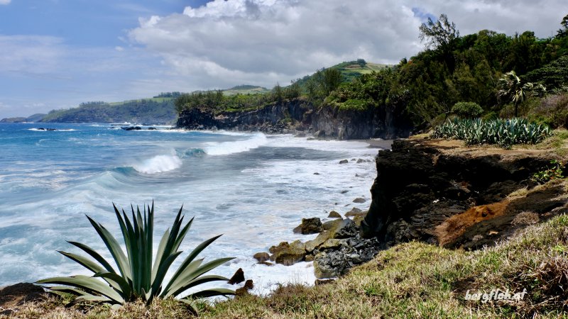 Parcours familial : La randonnée débute au parking situé près de la déchèterie de Saint-Joseph. En raison de la présence de chantiers, la meilleure solution consiste à partir sur la Rue de la Ligne François Martin et trouver, au tout début, le sentier qui part sur la gauche. Après une très courte descente, prendre la piste partant à droite. Cette piste, en bon état et entretenue, longe la rue puis bifurque sur la gauche dans les poivriers et le hautes herbes (Photo 1). Elle tourne ensuite à droite dans les hautes herbes vers la plage avec de nombreux pieds de ricin dans la végétation (photo 2). On parvient rapidement à la plage qu'on peut apprécier depuis le sentier bordé des pancartes d'interdiction. La petite falaise domine la plage très agréable et la Petite Île à l'horizon (photo 3). Si la mer est calme et basse, utiliser la rampe formée par les basaltes et laves pour descendre jusqu'au sable gris. Repérer les falaises équipées par les grimpeurs qu'on peut parfois voir à l'œuvre (photo 4), les cavernes plus ou moins profondes et les coquillages agglutinés sur les roches à quelques mètres de la mer. Si la mer n'est pas trop forte ou qu'elle est basse, la bande de sable est assez large pour rejoindre la suite de la plage (Photo 5). Des grottes plus profonde se trouvent facilement en longeant la falaise (Photo 6). Remonter par le même circuit et entamer la balade vers Saint-Joseph sur le sentier de bord. Il est totalement plat et bordé de grandes herbes au départ. En se retournant, on a de très belles vues sur l'ensemble de la plage et les falaises jusqu'à la Petite Île. Il pénètre ensuite dans un tunnel végétal constitué par les branches de poivriers (photo 8) puis descend en direction du radier bétonné sur la ravine Dominique (photo 9). Deux petits sentiers qui se rejoignant permettent de remonter après la ravine (photo 10). On remarque, de l'autre côté, la falaise qui se fissure et dont les roches ne resteront pas longtemps en place par forte houle (photo 11). Ne surtout jamais grimper sur ces roches pour faciliter leur chute. Le sentier, large et terreux repart en direction de Saint-Joseph dans les herbes. Sur la gauche, on profite de larges panoramas sur les collines environnantes qui dominent les prairies et champs du Lycée agricole (photo 13). Quelques filaos poussent sur le bord mais souffrent du vent et des embruns. Dès que la falaise s'effrite et que les racines sont exposées au sel, les arbres meurent et tombent à l'eau (photo 16). Les lavangères couvrent d'assez grandes surfaces en bordure de falaise (photo 15). Il est vrai qu'elles supportent mieux le sel que les filaos. Le sentier se rapproche au plus près du bord sans devenir dangereux (photo 14). Il s'en éloigne parfois pour s'approcher des champs (photo 17). Le sentier, large et sec est toujours agréable dans les herbes (photo 20). Des petites sentes utilisées par les pêcheurs sont sûres et peuvent être empruntées par les marcheurs. Il faut traverser de larges plaques de laves et de terre avant de parvenir à une minuscule ravine venant du cimetière (photo 21). Elle se traverse sur une petite passerelle en planche et la balade se poursuit vers la ville en s'approchant de la plage de galets qui a remplacé la falaise (photo 22). Marcher jusqu'à une ancienne aire de pique-nique dans l'herbe qu'on reconnait aux anciens socles bétonnés de kiosques (photo 23). La sortie familiale peut très bien s'arrêter là et repartir vers le départ pour rejoindre la plage de Petit Sable pour profiter de son sable gris mais pas de ses vagues dangereuses à plusieurs titres.