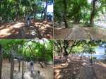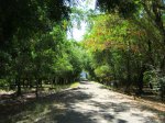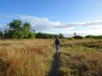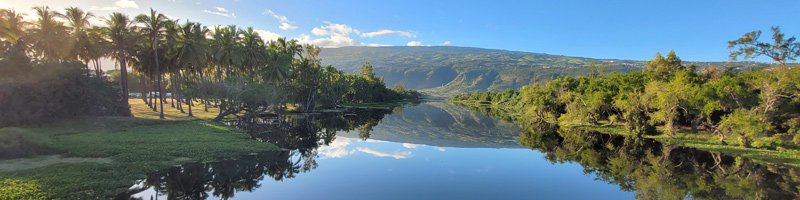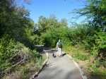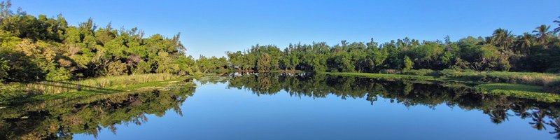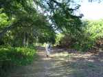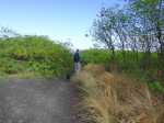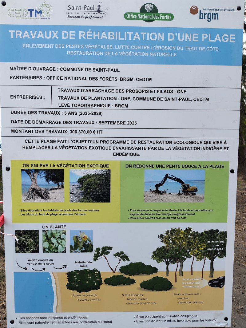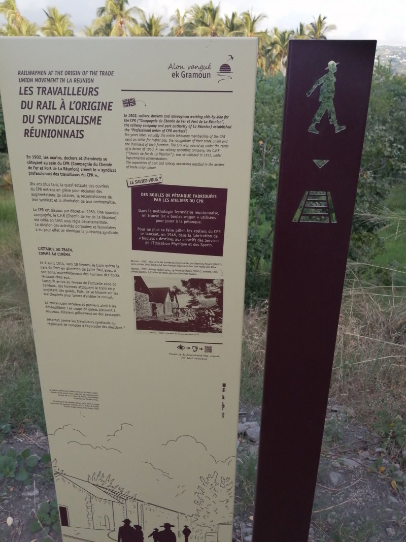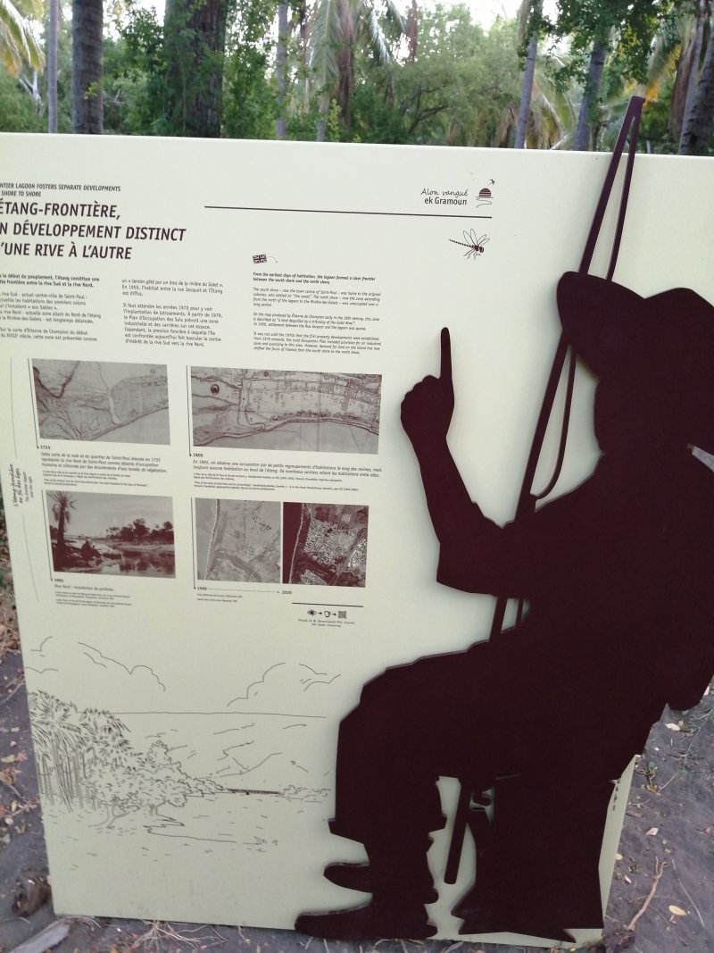 La randonnée débute au parking situé en bordure d'étang à la fin de la Rue de la Croix. Il est vaste, ombragé et très fréquenté toute l'année par les sportifs et même par quelques familles utilisant les emplacements vieillissants d'aires de pique-nique presque abandonnées. Entamer la boucle par la piste partant en direction de l'étang et du pont métallique qu'on devine dans la trouée (Photo 1). C'est l'ancienne voie de chemin de fer qui reliait Saint-Pierre à Saint-Denis, transformée en piste après enlèvement des rails. La longue passerelle métallique au plancher de bois traverse l'Etang Saint-Paul. Repérer, avant le pont, le sentier descendant à droite vers les berges en rive gauche. Les curieux désirant rajouter 2 km à la boucle effectueront le tour complet des queues de l'étang en rejoignant la Chaussée Royale. Un agréable sentier bordé de galets longe l'étang, se transforme en sentier étroit dans les traînasses, rejoint une rue près d'un lotissement que l'on contourne en suivant un grillage avant de retrouver la Chaussée Royale (Photo 2). Partir à gauche sur 400 m de rues en franchissant le pont de l'étang puis le rond-point de Savannah avant de rejoindre le bord de l'étang envahi de jacinthes d'eau (Photo 3). Des emplacements pour pêcheurs et barques de fortune confirment la présence de poissons dont 4 espèces d'anguilles (Photo 4). Il est très facile de longer l'étang dans la prairie qui le borde ou de se promener dans la cocoteraie abritant une dizaine de taphiens de Maurice, des chauve souris grises et blanches d'une envergure de 40 cm passant une grande partie de leur journée pendues sous les feuilles des grands arbres. Solitaires, elles se remarquent pourtant assez aisément en prêtant attention (Photo 5). L'opération amusera assurément les enfants tout en donnant un côté ludique à cet écart des sentiers battus. Quitter les chiroptères et poursuivre en franchissant une petite passerelle (Photo 6). On rejoint en quelques enjambées le parcours venant de la passerelle. Ne pas hésiter à en franchir une partie pour bénéficier de splendides panoramas sur l'étang et les prairies d'altitude au-dessus de Bois de Nèfles (Photo 7). Poursuivre vers le nord en prenant le chemin verdoyant entre les habitations (Photo 8). Il se termine au milieu des fleurs à la Rue Jacquot qu'on emprunte en partant vers la mer. Remonter vers le nord en longeant le collège sur une agréable petite route ombragée et fleurie (Photo 9). On rejoint plus loin la route circulaire effectuant le tour de la Plaine Chabrier après la zone de la gendarmerie. Afin d'éviter de trop marcher sur route, ne pas hésiter à entreprendre la traversée par un sentier bien marqué sur la droite (Photo 10). Le terrain est plat, la végétation rare et les herbes séchées ne cachent pas le passage (Photo 11). Les joggers en ont fait leur circuit de footing et la traversée s'effectue sans surprise (Photo 12). On devine la présence de gros plots en béton qui, à l'époque, maintenaient les câbles tendus de tous côtés pour tenir l'antenne verticale. On bénéficie souvent de larges panoramas sur les montagnes en direction de la Possession ou de Mafate. Une fois la route retrouvée, marcher sur la petite route jusqu'à la barrière fermant l'accès à la base ULM de Cambaie. Quelques mètres après cette barrière, un large sentier file en direction de la plage que l'on devine déjà au bruit des galets roulés par les vagues. Là aussi, pas de question à se poser sur la direction (Photo 13). Les épineux deviennent de plus en plus touffus à l'approche de la plage. Longer galets et sable en suivant les milliers de traces de pas ou de pneus (Photo 14). Trouver la première piste à un panneau du conservatoire du Littoral ayant beaucoup souffert. Quitter le sable gris remplissant les chaussures pour emprunter une piste ombragée où d'importants travaux de défrichages ont été entrepris (Photo 15). La balade s'effectue sous les tamarins d'Inde à quelques mètres de la plage (Photo 16). Elle frôle aussi le talus bordant les galets en offrant quelques beaux points de vue sur le Cap Lahoussaye et le tunnel de la tranchée couverte de Saint-Paul (Photo 17). On s'approche à nouveau de la route circulaire de la Plaine Chabrier mais un sentier permet de l'éviter au plus près du littoral. Quitter la route pour pénétrer sous le couvert des filaos afin de retrouver les pistes fréquentées des sportifs dans le Parc de la Poudrière (Photo 18). Là encore, la marche est un réel plaisir s'il ne fait pas trop chaud (Photo 19). Ce large sentier se poursuit jusqu'à l'embouchure de l'étang d'où l'on peut apercevoir le pont métallique emprunté en début de boucle (Photo 20). Un panneau très intéressant donne des informations de qualité sur la création de l'étang ou sur la faune et l'on apprend la différence entre diadromie, amphidromie et catadromie ! On y découvre également qu'une batterie militaire a été découverte sous le sable de l'embouchure. L'endroit se prête idéalement à une halte reposante (Photo 21). Le sentier repart en direction du pont mais il est très facile de poursuivre sur une trace entre galets et acacias (Photo 22). L'aspect du gué entre mer et étang change continuellement au cours d'une année ; passage les pieds mouillés en période pluvieuse ou gros tas de galets après les fortes houles (Photo 23). Entamer une boucle sur le parcours sportif qui a perdu nombre de ses spots d'exercices mais reste en très bon état (Photo 24). Constamment bordée de galets alignés, la piste est usée par les passages (Photo 25). Il est possible de revenir au point de départ au grand virage sud mais un autre endroit mérite une dernière balade. Rejoindre le trottoir, traverser la petite ravine en marchant vers Saint-Paul et entamer une nouvelle boucle très bien entretenue, identique au parcours sportif (Photo 26). En arrivant près du CREPS, faire