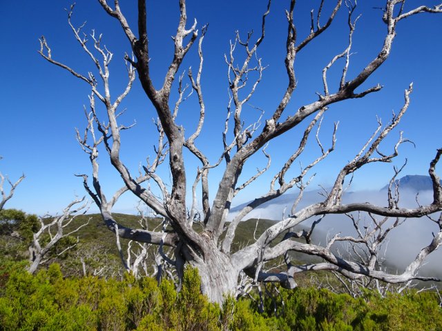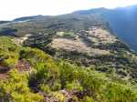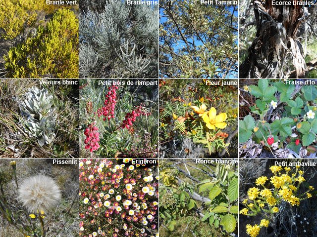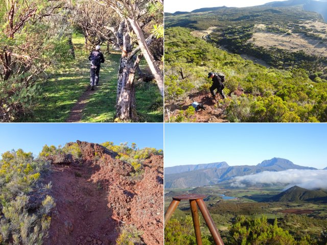 La randonnée débute à l'aire de repos très connue du Nez de Bœuf où les emplacements sont nombreux. Il est préférable de grimper immédiatement au sommet de Nez de Bœuf tant que la météo est clémente. Le sentier débute au plus près de la route par une courte mais forte montée. Il suit la crête séparant la route du volcan et l'aire de pique-nique. Plus loin, en arrivant sous les petits tamarins, on coupe le sentier se dirigeant vers les Trous Blancs. Poursuivre jusqu'au sommet du Nez de Bœuf par une pente moyenne comportant quand même quelques courts raidillons. Seuls les 30 derniers mètres méritent un peu d'attention à cause du vide et du sol glissant (Photo 1). Une fois sur la plateforme cimentée du sommet, il est difficile de songer à la descente car les paysages alentour sont à couper le souffle. Les plus impressionnants donnent vers la Vallée des Remparts et Roche Plate (Photo 2), les plus champêtres vers les prairies de la Plaine des Cafres (Photo 3), les plus sauvages sur la plaine qui entoure le Nez de Bœuf (Photo 4). On peut même profiter de cette halte pour imaginer la randonnée que l'on va effectuer en devinant le nom des petits sommets. Entreprendre la descente sans glisser jusqu'au croisement du sentier des Trous Blancs. Bifurquer à droite, descendre par le GRR2 vers la petite plaine accueillant l'aire de repos. La traverser avant de franchir la route du Volcan et d'emprunter le sentier qui mène au Lac Argamasse (Photo 5). Que l'on prenne le sentier ou la piste récemment rénovée, il faudra rapidement prendre à droite dans les branles verts puis poursuivre sur un sol creusé le plus souvent par les nombreux passages. Le sentier est soit étroit dans les branles et ambavilles, soit creusé dans le sol, soit large et sableux (Photo 6). Il traverse plus loin un joli bois de petits tamarins et de branles blancs pour une agréable marche à l'ombre (Photo 7). Les points de vue sont omniprésents et il faut s'habituer à ne pas quitter des yeux le Piton des Neiges et les autres plus grands sommets de l'île. On traverse quelques clairières au sol herbeux ou rocheux. Laisser une bifurcation de sentiers puis poursuivre jusqu'à une courte portion rocheuse. Ne pas manquer le discret sentier partant sur la gauche dans les branles verts au pied des roches recouvrant une partie du sentier (Photo 8). Si on le manque, ce n'est pas grave puisque le sentier principal mène également au lac. Il comporte quelques marches par endroits en grimpant sur le flanc sud du cratère entourant le lac (Photo 9). Il rejoint un peu plus loin le sentier venant du Chalet des Pâtres par le Piton Rouge et le Piton des Herbes Blanches. Partir à droite et entamer la descente vers le Lac Argamasse, tari en cette période de sécheresse (Photo 10). Longer le sentier entre le lac et la végétation. Trouver un des trois sentiers étroits montant vers le sommet à travers la végétation touffue, la trace se distingue encore bien (Photo 11). On bénéficie des plus beaux panoramas sur la Plaine des Palmistes (Photo 12) et sur le lac lui-même. Les amateurs poursuivront sur la trace qui longe la ligne de crête, sinon, faire demi-tour puis descendre vers le lac. Il est possible d'en faire le tour en prenant garde de ne pas glisser ou s'embourber dans le marécage qui entoure la petite étendue d'eau (Photo 13). Reprendre vers l'Est en direction du Piton Textor, impossible à manquer avec ses grandes antennes installées à son sommet (Photo 14). Quelques parties terreuses, rocheuses et des lacets courts permettent d'atteindre sans difficulté le sommet couvert d'antennes. Rejoindre la piste, prendre à gauche puis suivre le grillage de clôture pour arriver à la zone de décollage des parapentes et aux superbes vues sur la Plaine des Palmistes. L'itinéraire contourne le grillage et le petit mur d'enceinte puis pénètre dans une végétation facile à passer. Il rejoint plus bas la large plaine herbeuse entre les Pitons Textor et de Caille. Franchir la ravine et marcher en direction du Piton Doré sur un sentier très agréable dans les petites herbes. On longe les flancs du Piton de Caille qui baissent au fur et à mesure de la progression. On a encore les antennes comme repère en marchant sous quelques petits tamarins (Photo 15). Quand le terrain est presque plat, trouver sur la droite un sentier discret débutant dans la végétation. Il est parfois très bien marqué, parfois difficile à suivre mais on distingue devant soi les première pentes descendant vers la prairie qui en occupe le fond. Prendre à droite dans la végétation, traverser un petit bois de tamarins puis trouver le meilleur passage pour atteindre le sommet (Photo 16). Les randonneurs peu habitués aux hors sentiers devront toujours chercher les passages créés par les bovins même s'ils ne viennent plus sur le piton, mais une grande partie de la montée s'effectue sur une trace très visible. On passe au plus près de grands tamarins qui n'ont pas résisté aux incendies de 2013 mais créent de belles natures mortes (Photo 17). On peut sans danger parcourir l'ensemble de la crête et se régaler des nouveaux panoramas offerts depuis les 2184 mètres du sommet et des vues sur le centre du cratère recouvert d'herbe (Photo 18). Après avoir effectué un long demi-cercle à suivre l'arête, repérer au pied du Piton de Caille la route passant au sud (Photo 19). Redescendre à l'instinct en visant cette route forestière qui relie les prairies du Piton de l'Eau. On peut passer n'importe où sans danger, que le sol soit dénudé ou recouvert de courte végétation (Photo 20). On arrive près d'une ancienne carrière d'extraction ou le long d'une petite ravine avant de rejoindre la piste. Marcher sur le sol poussiéreux sans crainte de voir passer un véhicule (Photo 21). Rejoindre la route du volcan ou traverser la prairie pour rejoindre le petit sentier qu'on devine dans la montée au Piton de Sable. La tr
