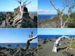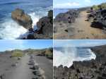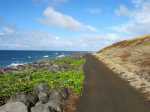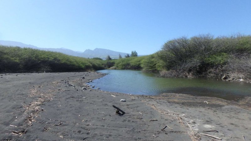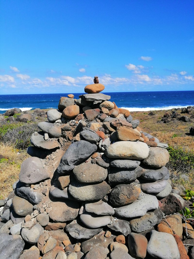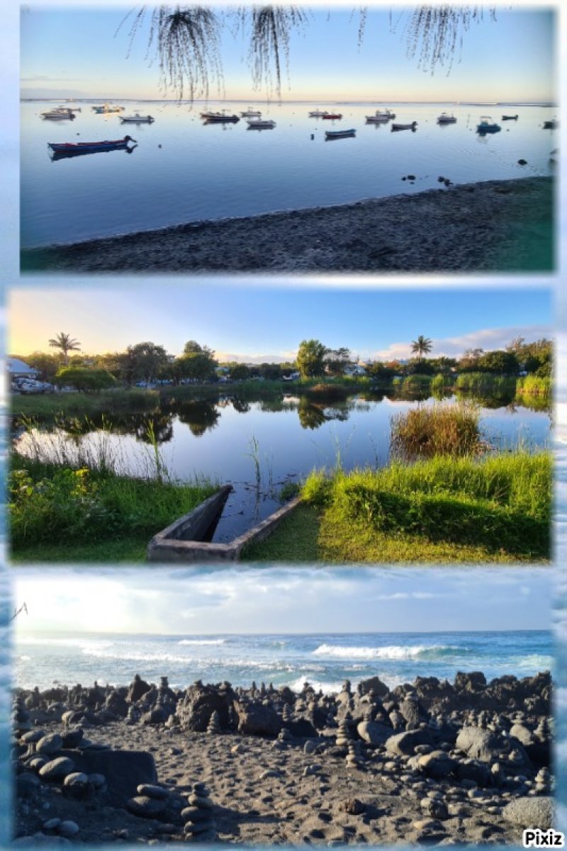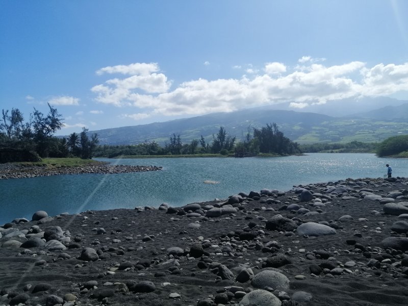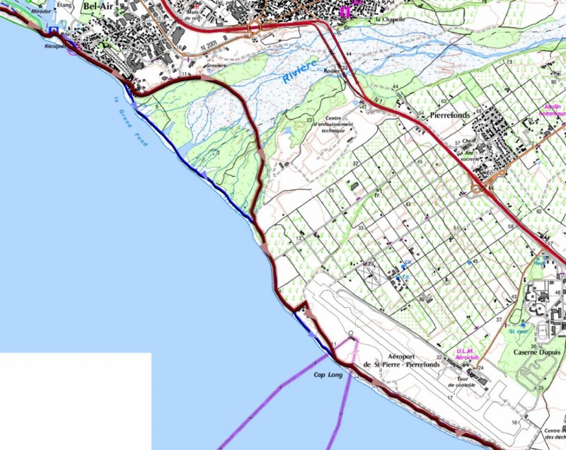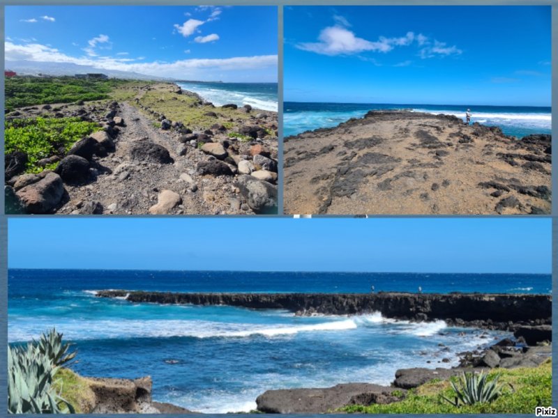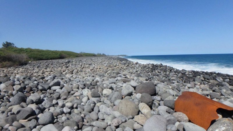 La randonnée débute n’importe où à l’Étang Salé à condition d’être au plus près de la mer. Une petite visite à l'étang envahi de roseaux au centre du village ne prend que quelques minutes (Photo 1). On peut même facilement en effectuer le tour complet. Si on part de la plage il suffit de longer la mer au plus près, de frôler le Bassin Pirogue qui est le petit port du village puis l'ancien Parc à Huitres qui se remarque surtout à marée basse. Sous les filaos, à la sortie du village, emprunter un sentier bien marqué bordé ou encombré de cailloux qui suit la côte par quelques courbes totalement à plat (Photo 2). Si on a le temps, on peut se rapprocher des vagues pour trouver des petits bassins d'eau claire mais la marche sur le basalte acéré peut s'avérer dangereuse. De loin en loin, de belles pancartes indiquent les itinéraires qui passent par ce sentier et qui font de 2 à 13 kilomètres (Photo 3). Le sentier passe au plus près de la côte bordée de roches noires, de filaos vivants ou morts. Plus loin, on traverse une belle portion sableuse où poussent quelques filaos autour d'un grand parking très fréquenté. Une rambarde sur la droite et des bruits sourds de vagues qui se brisent indiquent l’arrivée au Gouffre de l’Étang Salé. La mer est si violente dans cette faille taillée dans le basalte qu’une simple chute peut faire craindre le pire (Photo 4). De multiples croix fleuries viennent confirmer que certaines personnes désespérées connaissent ce lieu faisant régulièrement l’actualité. La zone abrite également des aires de pique-nique pour les personnes qui ne craignent pas trop la chaleur. Le Bassin Bleu peut également se rejoindre mais en marchant sur les basaltes coupants. Le sentier se poursuit, bordé de gros cailloux en haut de la falaise qui entoure la Roche des Oiseaux. Par forte mer, l'écume peut monter facilement à dix mètres de hauteur. Les laves découpées par l'érosion ou les arbres morts créent souvent de belles natures mortes (Photo 5). Côté montagne, on profite parfois de panoramas sur les Makes ou les hauts vers les Bénares (Photo 6). Vers la mer, la vue porte jusqu’à la Pointe au Sel de Saint-Leu et on peut guetter le souffle des baleines en hiver ou apercevoir les pêcheurs à la ligne (Photo 7). Les filaos, rabougris et penchés dans le sens du vent tentent de pousser comme ils le peuvent sur cette roche pauvre et arrosée d’eau salée à longueur d’année. Les roches noires recouvrent par moment la totalité du parcours (Photo 8). Tout près, une grande surface du littoral a été recouverte de dizaines des cairns du Vortex Énergétique ou d'empilements de galets plats à travers lesquels serpente le sentier, parfois étroit. Il ne reste plus beaucoup de galets pour continuer l'œuvre qui ôte cependant du charme au côté naturel du littoral (Photo 9). A la fin de cette portion originale débute une longue partie dans le sable fin des dunes qui entourent l’Étang Salé jusqu'à l'étang du Gol. Le sentier, bordé de galets qui le délimitent, s’éloigne du littoral pour un temps mais le retrouve rapidement (Photo 10). Poursuivre sous les filaos en direction de Saint-Pierre pour remarquer que ces pauvres arbres ne réussissent toujours pas à se redresser. Quelques cairns de deux mètres de hauteur ont été érigés sur le bord du parcours (Photo 11). Le sentier se rapproche par moment assez près du bord de mer (Photo 12). Le sable atteint souvent plusieurs dizaines de cm d'épaisseur et il pénètre facilement dans les chaussures (Photo 13). On alterne sable, galets ou roches avant d’arriver à la Ravine Sèche qui se franchit facilement (Photo 14). S'il a beaucoup plu, poursuivre sur les galets pour contourner l'estuaire embourbé ou immergé plutôt que de patauger dans la boue. La mer, très proche, se précipite sur d’énormes tas de galets accumulés par les vagues. De l’autre côté de la ravine, on récupère pour une longue distance un très large sentier recouvert de sable et bordé de galets, de nouveaux cairns ou des arrangements élaborés comme décorations (Photo 15). Jusqu’au pont détruit de l’Étang du Gol, on peut choisir entre plusieurs itinéraires en empruntant ce large sentier, la piste cavalière ou en marchant sur le bord de la falaise qui s’effrite doucement avec les vagues et le temps. Ne pas manquer, avant d'arriver à Bel Air de bifurquer à gauche pour rejoindre les rives de l'étang du Gol et profiter des paysages ou y voir des oiseaux migrateurs (Photo 16). A la fin de l’étang, traverser le petit barrage naturel de galets qui le sépare de l’Océan et longer la mer jusqu’à la sortie du village ou, plus simplement, traverser le parking. Un court écart de 100 mètres amène à la fin de la Rue Valmy pour y admirer un petit temple tamoul très coloré. Bel air est un petit village de pêcheurs qui se traverse facilement en empruntant le Boulevard du Front de Mer puis la Rue Lambert ou en longeant le rivage recouvert de galets (Photo 17). Depuis la Roche des Oiseaux, on n'a guère quitté les galets qui roulent bruyamment, poussés par les vagues (Photo 18). On rejoint très rapidement la partie la moins agréable de cette sortie pour la traversée du large delta de la Rivière Saint-Étienne. Après la dernière ruelle et un dépôt d'engins de terrassement, on débute la traversée par l'ancienne piste encore bien visible, surtout en raison des tas d'immondices qui y sont déposés. Le premier gué arrive très vite. La piste a été défoncée par les engins pour la faire disparaître et la végétation a tendance à la dévorer rapidement jusqu'au prochain cyclone. Elle se devine le plus souvent mais il faut suivre quelques cairns dans les portions de galets (Photo 19). Impossible de franchir les gués sans se mouiller à moins d'être un champion du saut en longueur (Photo 20). Les désagréments cessent en arrivant au pied de la grand