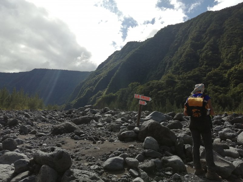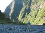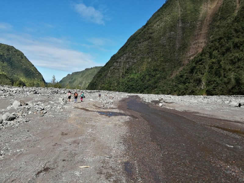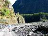 Nous sommes partis samedi du Nez de Bœuf et avons fait dimanche la partie Roche Plate - Grand Coude. RAS dans la rivière des Remparts, dont le lit a beaucoup changé depuis mon dernier passage il y quelques années. Ça devait être dantesque quand on voit les quantités de galets amoncelés, déplacés, ou les éboulis. Il y a même encore de l'eau qui coule sur la piste, ce qui laisse imaginer les quantités tombées ces derniers mois.