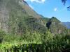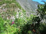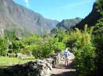 La randonnée débute au classique parking situé à 200 m de l'église de Grand Coude qu'on peut visiter avant de partir s'il n'y a pas d'office (Photo 1). Rejoindre rapidement le rempart en bordure de prairies avec vues sur le Morne Langevin (Photo 2). Au lever du soleil, le morne offre toujours un agréable spectacle (Photo 3). Il est également possible de partir du village par le Chemin de l'Aventure (sic), par la piste qui relie directement le départ du Sentier Dimitile mais il est plus difficile de trouver un emplacement de stationnement. Longer le rempart vers le sud sur un sentier herbeux bordé de hautes cannes fourragères, de bringeliers et surtout de beaucoup de vigne marronne qui empêche souvent des points de vue (Photo 4). Ne pas partir sans se régaler du spectacle du panorama situé en aval de la Rivière des Remparts qu'on rejoindra dans une heure. Juste en face, la muraille infranchissable du Piton de la Mare, issu de l'effondrement de la caldeira de la Rivière des Remparts ne comporte aucun sentier (Photo 5). Le sentier plonge immédiatement dans la forêt de bois de couleurs pour descendre d'une cinquantaine de mètres par des lacets courts et déjà abrupts. Puis on chemine à plat ou en très douce descente sur 200 mètres avant d'attaquer la véritable plongée vers les galets du fond de la rivière. Heureusement, quelques échelles éviteront des glissades lors des passages délicats (Photo 6). Le sentier est très raide mais surtout presque rectiligne. Plus de lacets pour reposer un peu sur les 450 mètres de descente qui suivent. La vue remonte jusqu'au Nez de Bœuf au nord de la vallée qui ne recevra le soleil qu'une heure plus tard (Photo 7). On rejoint un petit rein pour poursuivre la plongée encore plus difficile sur des plaques de lave, cailloux, terre glissante. La végétation est assez dense et donne peu l'occasion de points de vue sur le rempart en face, excepté dans la portion la plus abrupte du sentier, près du rein. La pente ne diminue pas du tout quand reviennent les lacets mais on aperçoit l'Îlet Dimitile et on sait que les efforts vont prendre fin. Quand il bifurque vers la gauche dans les cailloux et les jouvences, c'en est presque fini. On rencontre la portion d'une ancienne piste et un petit replat ; c'est à gauche qu'on trouvera la sortie du bois. On domine la vallée de quelques mètres à travers les chocas (Photo 8). Les tas de galets qu'on rencontre très vite sont difficiles à escalader et certains sont instables. Chercher le meilleur passage dans les zones basses ou sableuses pour marcher tout droit vers le rempart opposé et trouver la piste qui remonte vers Roche Plate (Photo 9). De ce point jusqu'à la petite muraille du Barrage de Mahavel, il n'y a plus à réfléchir où poser le pied ou chercher une branche pour ralentir la descente car on chemine presque à plat sur une piste large, poussiéreuse mais sans aucune difficulté. Les remparts qui bordent le large lit de la rivière créent des murs infranchissables (Photo 10). Après un peu moins de 3 km on arriver à l'aplomb du Coteau de Sipec donnant l'impression qu'on pourrait le grimper s'il y avait un îlet plus haut (Photo 13). Devant, les filaos servent de repère pour indiquer qu'on s'approche du barrage (Photo 14). L'épaisseur de remblai est assez importante par endroits (Photo 15). La piste s'approche du gué du Bras de Mahavel où un mince filet d'eau peut parfois couler. Les cailloux qui jonchent le sol proviennent d'une part des travaux fréquents pour aménager la piste, d'autre part du grand effondrement de 1965 (Voir § ci-dessous). Comme ce crochet est très sportif il faut éviter de le combiner avec cette visite de Roche Plate. En revanche, les difficultés déjà passées et les temps permettent d'évaluer ce qu'il faudra la prochaine fois pour relier ce gué. La falaise de cailloux et de terre recouverte de filaos constituant le Remblai (ou Barrage de Mahavel) se passe rapidement malgré la pente en lacets. On se retrouve très vite dans une belle forêt de filaos qu'on ne quittera qu'aux abords de l'îlet (Photo 17). La piste est large car très fréquentée par les 4x4 qui ont créé çà et là des ornières qui n'arrivent que très rarement à se vider de leur boue. Des petits détours sont obligatoires pour éviter de "s'embourber". Quelques fruitiers, bambous, cultures annoncent le village de Roche Plate entouré de hautes falaises et dominé par l'Îlet Ulysse (Photo 18). Ce petit hameau accessible uniquement par sentier n'abrite plus beaucoup d'habitants si on ne compte pas les gîtes (Photo 19). Traverser l'îlet par la rue principale qui fait moins de deux mètres de large (Photo 21). On peut gagner le dernier gîte sur la droite pour s'y reposer avant de repartir. Des cases anciennes donnent une idée de la vie lontan comme on dit ici (Photo 24). Les vues sur le rempart jusqu'au Nez de Bœuf sont impressionnantes et on comprend pourquoi il faut venir de Saint-Joseph ou de la Route du Volcan pour s'isoler dans cette étroite vallée (Photo 20). Il y a moins de trois heures qu'on marche mais il faudra en rajouter un peu pour la remontée du rein du Dimitile. Une petite pose, un verre dans un gîte et c'est parti pour le chemin inverse qui utilisera le même itinéraire, c'est à dire aucune difficulté pour la forêt de filaos ou la piste mais obligera à se pencher vers l'avant pour remonter l'étroit sentier abrupt qui relie la vallée à Grand Coude (Photo 26). Les parties plates dépassent très rarement les dix mètres (Photo 27). Plusieurs fois lors de cette montée, on sera amené à se demander pourquoi personne n'a installé plus d'échelles (Photo 28). Quand on a le panorama du Morne Langevin dans les yeux et qu'on longe le rempart pour retrouver l'église, on sait que c'en est fini.