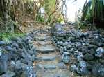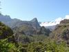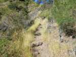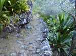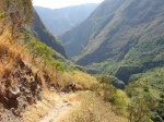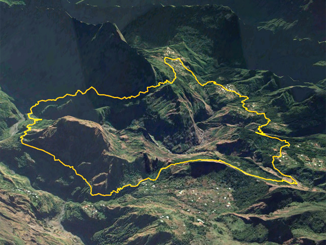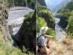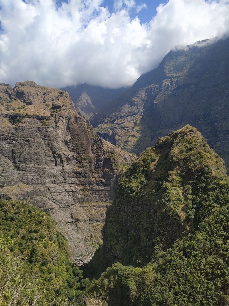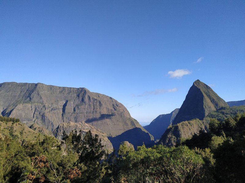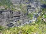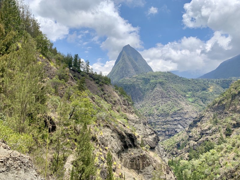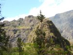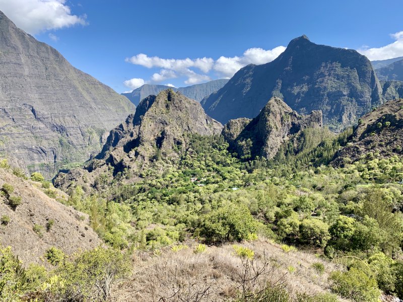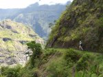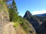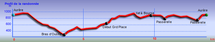 La randonnée débute à Aurère où on aura séjourné durant la nuit en venant du Bélier par le Sentier Augustave ou le Sentier Scout par exemple. Une petite pente amène tout droit à Bord Bazar où une halte s'impose pour bénéficier des superbes panoramas sur le cirque. On commence par le Piton Diable qu'aucun sentier ne dessert même si on devine des parties planes qui auraient pu accueillir un îlet (Photo 1). La descente, rocailleuse à flanc de la falaise abrupte des pentes du Piton Cabris, a souvent été creusée à même la pierre. Il faut prendre tout son temps pour admirer ce côté sauvage du cirque où les pitons pointus et déchiquetés se succèdent (Photo 3). On domine le Bras d'Oussy coulant au fond de son canyon qu'on atteindra rapidement en fin de descente (Photo 4). Le sentier, le plus souvent en descente, présente tout de même quelques rares portions plates (Photo 5). On longe une zone particulièrement vertigineuse où fort heureusement, des rambardes sont installées pour sécuriser (Photo 6). On peut repérer, en regardant sur la gauche, le Piton des Calumets et les cases de Grand Place qu'on atteindra dans deux heures. Après cette partie délicate, le sentier entame sa descente vers le Bras d'Oussy à partir de l'Îlet Fougères avec de belles vues sur la vallée de la Rivière des Galets (Photo 7). Plus bas, on domine d'ailleurs la rivière à partir de points vertigineux mais splendides (Photo 9). On s'approche assez vite à la passerelle qu'on aperçoit 200 mètres avant d'y parvenir et l'on peut admirer le cirque formé par le Bras d'Oussy qui s'est frayé un chemin au milieu des rochers (Photo 11). Le sentier s'élève doucement à partir de l'ouvrage qui permet d'observer l'impressionnante gorge étroite du bras qui termine sa course ici en se jetant dans la Rivière des Galets. Une imposante falaise semble barrer le chemin mais le sentier, étroit et très vertigineux, creusé à même la falaise permet de passer l'écueil sans danger grâce aux mains courantes, rambardes et passerelle (Photo 12). Plus loin, il monte à l'assaut du Piton Tortue pour rejoindre un petit col au-dessus de la Rivière des Galets sur un terrain aride et sec (Photo 13). A partir du col situé à 522 m d'altitude, le sentier est soit plat soit en descente légère et ne comporte aucune difficulté. On voit très bien l'îlet des Lataniers avant de rencontrer le sentier qui part à droite pour le rejoindre (Photo 14). Dans la descente, un sentier sur la droite amène au vieux cimetière dont le détour ne prend que 5 minutes. Le sentier oblique sur la gauche et suit de loin la Ravine Fontaine en direction de Grand Place. Laisser à droite le sentier de Cayenne. Un escalier bordé de pierres sèches marque symboliquement le début du très vaste Îlet de Grand Place (Photo 15). Il faut franchir quelques lacets constitués de hautes marches en pierre pour atteindre l'école de l'îlet (Photo 17). Laisser toutes les traces partant à droite et arriver au gîte des Bougainvilliers pour aller saluer la statue du facteur de Mafate. Un peu plus loin, seuls les habitués trouveront sur la gauche le départ vers l'Îlet Moutou dont le sentier serpente entre le Piton Papangue et le Piton Canal. On a depuis déjà quelques temps de belles vues du très pointu Piton des Calumets. Il semble très aigu mais se monte presque sans effort si on n'a pas le vertige. Au prochain croisement, il est possible de partir à droite vers Grand Place les Hauts mais le sentier de gauche contourne le Piton Carré par le nord en donnant des vues sur Aurère et le Piton Cabris. Bien profiter des portions plates sous les filaos car le relief changera très bientôt. En effet, après un oratoire sur la gauche, le sentier plonge sur un sol rocheux et terreux vers le Bras d'Oussy. On voit très bien le torrent couler dans le bas ainsi que le sentier qu'on empruntera après le gué. L'effort est important pour la descente comme pour la montée mais on atteint l'îlet à Bourse pour quelques minutes de repos (Photo 18). Après avoir franchi une nouvelle passerelle (Photo 19), on entame une descente sous les filaos en direction de la Grande Ravine. La descente s'effectue en forte descente comportant lacets, escaliers en roche, câbles, toujours en bordure de ravin (Photo 20). On aperçoit déjà Aurère et le Piton Cabris, fin de cette boucle (Photo 21). Franchir cette fois la Grande Ravine sur une passerelle étroite qui oscille au moindre mouvement (Photo 22) avant d'entamer la montée en lacets courts sur un sentier terreux (Photo 23). On rejoint très facilement la Plaque et l'îlet à Malheur sur un sentier à l'ombre des grands filaos (Photo 24). Le village fleuri est une invitation à la halte mais la boucle est bientôt terminée (Photo 25). En fonction de la durée du séjour dans le cirque, il est possible de repartir sur la droite par le Sentier Scout ou vers la gauche pour traverser l'Îlet à Malheur. Après une visite de l'îlet, descendre sur les grosses pierres dans les chouchous vers le Bras Bémale qu'on traverse sur une passerelle (Photo 26) qui domine le canyon d'une cinquantaine de mètres (Photo 27). La nième et dernière montée de la journée débute sous de nouveaux filaos par des escaliers en pierre. La pente est forte et caillouteuse à travers les chouchous. La fin de la boucle s'effectue dans le vaste îlet d'Aurère où l'on retrouve certainement le gîte loué la veille.