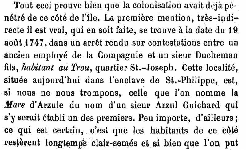 Arzule revient souvent au cours de cette boucle qui fait le tour complet de la ville de Saint-Philippe. La randonnée est dominée par le Piton Mare d'Arzule puis on coupe sa ravine en amont du Chemin de Ceinture avant de retrouver la Pointe éponyme battue par les vagues près de Saint-Philippe. Mais les recherches entreprises n'indiquent pas qui était le personnage qui a laissé son nom près de Saint-Philippe.