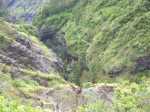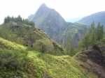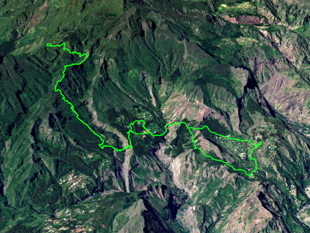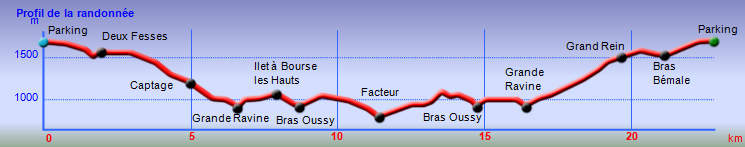 La randonnée débute au point le plus haut de la journée, au parking proche du sentier, sur la route du Bélier et du Col des Bœufs. Le sentier est très étroit au départ mais prend très vite une bonne allure entre fanjans et bois de couleurs (Photo 1). Il serpente de ravine en ravine, dans une végétation très fournie, en suivant la courbe de niveau. Les nombreux gués sont rocheux et se franchissent aisément. Il faut près de 30 minutes pour arriver au bas de l'escalier bien sécurisé qui remonte vers Deux Fesses en bordure de falaise (Photo 2). La falaise est assez abrupte mais le sentier monte peu. Le vide, sur la droite, peut inquiéter certains marcheurs. Le sentier de Deux Fesses passe en ligne de crête qui semble étroite mais ne représente guère de danger. On domine le très vertical canyon de la Grande Ravine dont on a parfois du mal à voir le fond. On arrive très vite au Plateau de la Sale sur un très agréable sentier (Photo 3). Le plateau humide et boueux se traverse sans effort (Photo 4). A la fin du plateau, avant d'entamer la descente, les vues sur le Piton Cabris sont parmi les plus belles de l'île. On distingue également le Piton des Calumets et le Maïdo (Photo 5). On domine plusieurs îlets, proches ou plus lointains comme Roche Plate. La descente du Grand Rein débute dans les filaos sur une étroite ligne de crête (Photo 6). Après les filaos, le sentier est facile dans les goyaviers (Photo 7). Il est large et toujours bien entretenu (Photo 8). Vient ensuite une forte descente caillouteuse par de très nombreux lacets vers le Captage Grimaud qui a depuis longtemps perdu son rôle de récupération de l'eau pour les îlets situés en-dessous. La pente s'assagit et on poursuit sur l'agréable sentier sous les filaos qui s'envahissent petit à petit de longoses et de galaberts (Photo 9). Les filaos ne cessent pas à la Plaque où l'on rencontre le sentier qui débute à gauche en direction de l'Ilet à Bourse. Après un passage presque à plat dans les jouvences et les pierres qui encombrent le passage, on s'approche de la Grande Ravine (Photo 10). On profite, avant d'entamer la descente, de superbes vues sur le Piton Cabris et on devine même quelques toitures à Aurère (Photo 11). Le terrain s'appauvrit, les chocas se multiplient, la descente débute vers la Grande Ravine dont on n'aperçoit pas encore le fond (Photo 12). Le sentier en lacets plonge vers la Ravine de manière parfois abrupte sur un sol sableux et glissant (Photo 13). La petite rivière, à peine en eau, se franchit par une passerelle métallique qui danse au moindre mouvement (Photo 14). Eviter de passer à plusieurs personnes à la fois pour éviter ce mouvement de balancier et sauvegarder l'édifice. Débute une très sportive remontés sur un sol rocheux et dénudé où de nombreuses marches ont été creusées à même la roche (Photo 15). Certains passages sont beaucoup plus vertigineux qu'à Deux Fesses, surtout s'ils sont en bordure de falaise (Photo 16). Les vues sur la vallée sont tout aussi vertigineuses (Photo 17). Après tous ces lacets abrupts et dépourvus de végétation, on parvient à une zone très ombragée sous les filaos (Photo 18). La montée devient agréable malgré quelques roches en travers du sentier. (Photo 12). La Ravine Bruneuil se franchit sur une nouvelle passerelle menant à quelques touffes de bambous deux minutes avant de parvenir au panneau annonçant l'Îlet à Bourse. Prendre à gauche le premier sentier et remonter, si le chrono le permet, en direction de l'Îlet à Bourse les Hauts. Cet écart, moins visité, respire la sérénité au milieu des fleurs (Photo 19). Les sentiers, qu'ils soient herbeux, pierreux ou faits de marches sont tous agréables et faciles sur des pentes faibles (Photo 20). Ne pas manquer cette chapelle lontan qui ne résistera pas aux vents violents mais qui donne du cachet à cet endroit isolé (Photo 21). En fin de boucle, partir sur la gauche et plonger vers le Bras d'Oussy sur une pente plus agréable que la précédente. L'autre rive, en revanche, se franchit par plus d'efforts sur des lacets courts en en zigzag (Photo 23). Le Bras d'Oussy est beaucoup plus en eau que la Grande Ravine. Dès la passerelle franchie, débute une montée rocheuse, longue et difficile jusqu'à un oratoire qui en annonce la fin. L'arrivée au croisement des sentiers de Grand Place marque la fin proche de l'itinéraire et des principales difficultés. Cet îlet est vaste et traversé de plusieurs sentiers. Comme on ne peut les utiliser tous et qu'on veut en garder pour une autre visite, la meilleure solution consiste à effectuer le tour du Piton Carré en rejoignant le Plateau de Gousse et en laissant sur la droite le Piton Bois Jaune. L'itinéraire est plus long mais les paysages magnifiques et le sentier assez facile (Photo 24). La végétation est bien moins dense que dans le reste du cirque (Photo 25). Grand Place, comme son l'indique, est une vaste étendue de champs et d'habitations tournées vers l'accueil. Avant de filer plein sud pour traverser l'îlet, tenter une petite visite à la statue du facteur de Mafate (Photo 26). L'écart ne prend que quelques minutes pour rendre hommage à ce grand sportif tant attendu chaque semaine avec sa sacoche pleine de courrier. Après une halte dans un gîte ou une épicerie, on est prêt pour le retour qui emprunte le même itinéraire après s'être rapproché du Piton des Calumets en marchant vers le sud (Photo 28). Si l'aller comportait de nombreuses descentes qui permettaient de marcher sans grands efforts, il faut garder à l'esprit que ces descentes sont désormais des montées, parfois fortes, et que l'énergie dépensée sera plus conséquente et les temps substantiellement augmentés. Bien veiller, depuis Grand Place, au stock de nourriture et boisson restantes, sinon il faudra faire un petit arrêt dans l'un des îlets suivants.