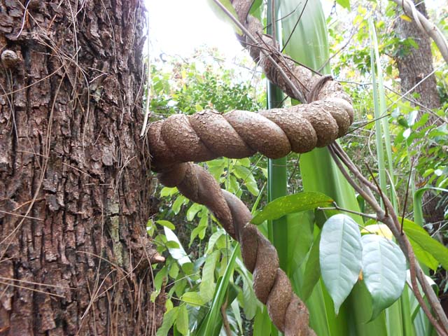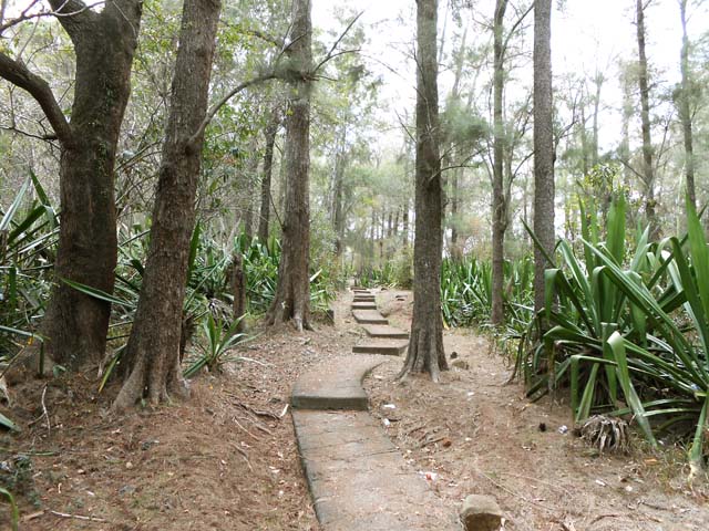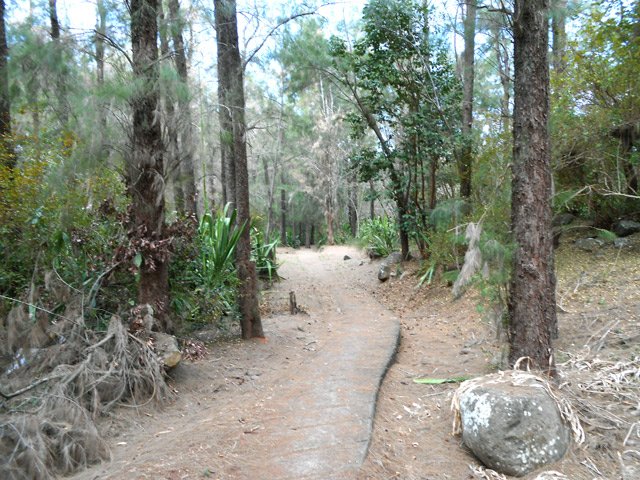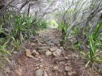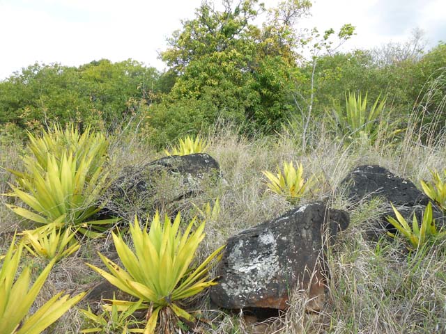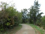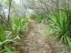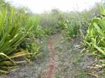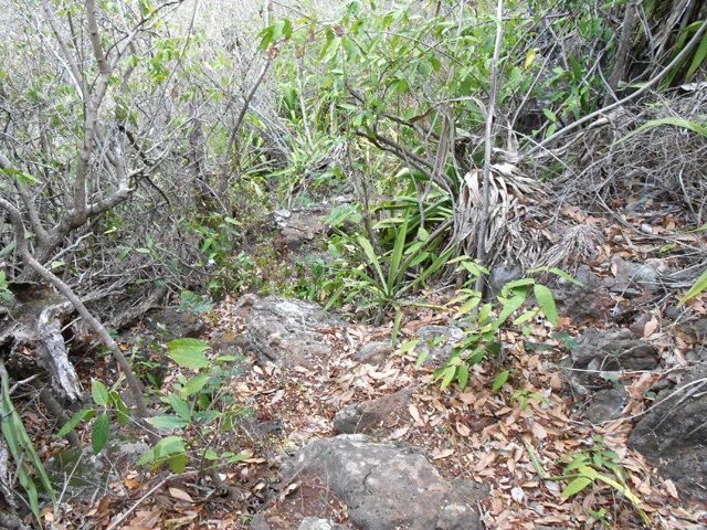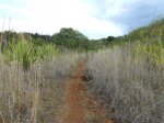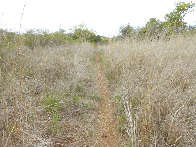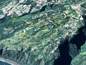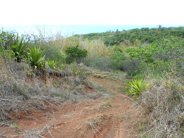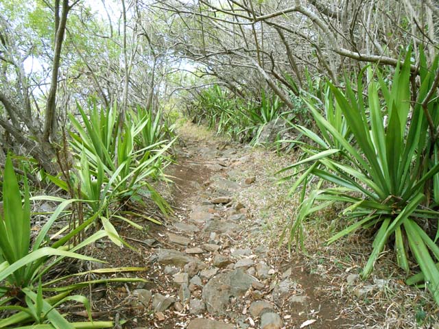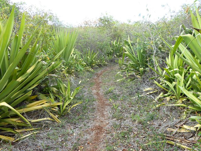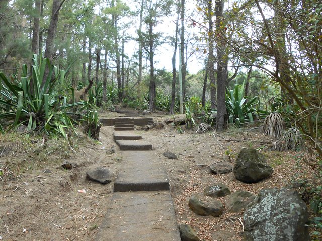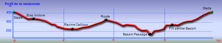 La randonnée débute au terrain de sport des Bambous puis emprunte le Chemin de Saint-Bernard vers le nord. Dans le premier virage à droite, ne pas manquer le très sympathique sentier bétonné qui remonte sous les filaos (Photo 1). La marche est facile sur les portions plates recouvertes d'aiguilles de filaos (Photo 2). Les marches, quant à elles, sont basses et éloignées (Photo 3). Repérer les lianes papillon qui tentent de monter à l'assaut des filaos (Photo 4). Si on les laisse faire, on ne pourra plus passer sur ce sentier en quelques années seulement puisque rien n'arrête Hiptage benghalensis qui prend possession lentement du nord et de quelques cirques. Ce sentier finit près de champs de salades et autres légumes qui poussent sur la droite (Photo 5). Au Chemin Depeche, prendre à gauche vers le centre équestre de la Montagne (Photo 6). Partir sur la gauche pour rejoindre le très discret Bras Isidore qu'on traversera ou longera plusieurs fois. Emprunter une piste quelques mètres après le premier franchissement et partir en longeant de loin ce ruisseau. Bordée de chocas et d'une végétation pauvre, ce segment ne pose aucun problème (Photo 8). A la fin de la large piste en terre partent de nombreux sentiers dont beaucoup sont devenus impraticables (Photo 9). Un coup d'œil sur la carte peut d'ailleurs donner des craintes d'égarement. Ce n'est pourtant pas le cas car le sentier présenté sur la carte ci-dessous est le plus instinctif, le plus agréable et le plus facile de tous ceux qu'on aperçoit ça et là. Le terrain est sec, le sol poussiéreux s'il n'est pas recouvert de pelouse sèche (Photo 10). On se rapproche de l'océan qu'on aperçoit à l'horizon (Photo 11). Quelques rares cailloux obligent à regarder de temps en temps où l'on pose les pieds mais c'est sans danger que l'on peut flâner en guettant des panoramas sur la région. Le sentier oblique sur la droite, toujours dans ces savanes sèches qui pourraient brûler au moindre mégot (Photo 12). Le sentier rejoint plus loin la toute aussi discrète Ravine Cailloux et effectue une petite boucle vers le Nord entre chocas, grandes herbes et épineux (Photo 13). Il revient vers la ravine, la traverse et oblique plein sud (Photo 14). Certaines portions peuvent faire comprendre le nom de la ravine (Photo 15). La pente est encore faible et on domine la région qu'on vient de traverser où le regard porte jusqu'à la Montagne (Photo 15). La piste oblique sur la gauche pour rejoindre la fin du chemin au délicieux nom de Couilloux mais un raccourci file tout droit en direction du centre équestre rencontré en début de boucle. Le terrain recouvert de poivriers et de chocas est traversé par un sentier pentu et caillouteux mis à mal par les sabots des chevaux (Photo 17). Il devient plus plat avant de rencontrer le Chemin Couilloux (Photo 18). Remonter cette route jusqu'au croisement du Chemin José Michel. On peut repartir à droite pour revenir au terrain de sport mais cette boucle étant très courte, pourquoi ne pas poursuivre un peu vers la Grande Ravine. La rivière a de l'eau toute l'année ou presque même si elle n'a pas toujours un débit impressionnant. L'intérêt réside à se rapprocher du Bassin Passage. Il faut alors marcher un peu sur le Chemin José Michel (Photo 20) qui effectue une longue boucle vers la droite pour aller franchir la Ravine Jeanneton. On parvient à quelques habitations où tout le monde sait qu'un marcheur approche. Ne pas craindre les aboiements servant d'avertisseur et filer tout droit au premier croisement. La piste se poursuit puis rejoint le début de la piste près de cases assez modestes et entourées de meutes de chiens tout aussi bruyants où on retrouve ici le plaisir et la sécurité d'avoir emporté le bâton de randonnée. La piste se transforme en agréable sentier (Photo 21) qui va en se rétrécissant de plus en plus (Photo 22). Il plonge ensuite vers la ravine de manière abrupte sur des cailloux, vieilles branches et vigne papillon (Photo 23). On rejoint assez vite le Bassin Passage, en partie entouré de rochers et petites falaises, alimenté par le ruisseau de la Grande Ravine (Photo 24). Le week-end, les jeunes des villages alentour se lancent des défis, perchés sur les plus hautes branches du manguier qui domine le bassin d'où ils se jettent pour créer les plus gros remous (Photo 25). L'eau du bassin, peu profond, est fraîche même si le débit de l'eau est assez faible (Photo 26). A quelques mètres de là, vers l'aval, la Cascade des Hirondelles se jette dans le vide mais elle est bien modeste une bonne partie de l'année (Photo 27). Pour se rendre au pied, il faut partir par un sentier escarpé débutant à Moulin Cader (Photo 28). Après ce rafraichissant aller-retour qui est parfois un peu encombré de végétation, faire demi-tour en direction du centre équestre par le même chemin. Récupérer alors le beau sentier-escalier qui ramène en quelques minutes au terrain de sport des Bambous.