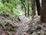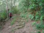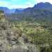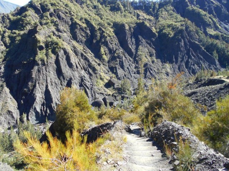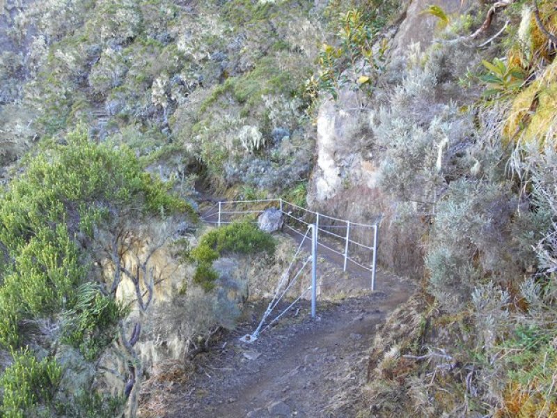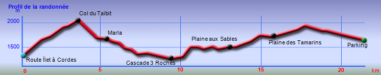 Le départ s'effectue au croisement du sentier du Taïbit et de la route de l'Ilet à Cordes. Le cheminement est assez difficile car il s'effectue en forte montée directement en sortant du véhicule. Il faut alors doser l'effort et ne pas chercher à rejoindre le col en battant des records, ce qui serait plus facile si on venait de Cilaos et qu'on avait pu s'échauffer en passant près de la Cascade du Bras Rouge. Le sentier débute par des escaliers et monte parfois fortement par des lacets courts et serrés, sur terre, racines ou marches en bois (Photo 1). Quelques rares portions plates permettent des repos de courte durée (Photo 2). Le sentier s'approche de l'Îlet des Salazes et son stand de boissons après la montée sous les eucalyptus (Photo 3). Plus loin, il traverse une zone en pente bordée de très gros blocs disséminés dans la nature avant de traverser les branles du côté du sentier de Cap Bouteille (Photo 4). On distingue très souvent le pain de sucre pointu qui flanque le Grand Bénard et on devine le Col du Taïbit, encore très loin (Photo 5). Les parties ombragées sont assez rares mais moins utiles le matin où le soleil est encore bas (Photo 6). La pente est assez forte sur de nombreux lacets après avoir passé la Source Ti Louis qui coule en permanence. Un repos de courte durée est salutaire en traversant l'agréable Plaine des Fraise. Puis la remontée reprend en direction du col. Le Grand Bénare qui domine est assez impressionnant et bien malin qui trouverait un passage d'escalade (Photo 7). Les panoramas sur le Cirque et l'océan en direction de Saint-Louis sont toujours aussi beaux, quelle que soit l'heure (Photo 8). Après avoir passé un ancien éboulis très bien remis en état avec sentier protégé par câbles, on attaque la dernière montée sur des partie parfois dénudées et un peu vertigineuses (Photo 9). Le col est très proche lorsqu'on frôle l'oratoire en béton qui vieillit très mal, sans la protection habituelle d'une grotte et attaqué par les intempéries (Photo 10). La descente vers Marla est délicate car le sol est parfois abrupt et souvent glissant. Le sentier serpente tout d'abord dans la végétation puis traverse une zone aride et rocheuse par des marches creusées à même le roc. On retrouve très vite la végétation et les filaos avant de parvenir au snack de Marla d'où l'on peut voir tout l'îlet. La traversée de Marla est un vrai plaisir par une pente très faible qui descend vers la Rivière des Galets en profitant du spectacle de l'énorme piton du Nez de Bœuf (Photo 12). La traversée de l'îlet s'effectue en pente assez douce entre les habitations dispersées sur une des plus vastes surfaces du cirque, bordée de toutes parts par des pitons pointus (Photo 13). On croise quelques vaches le plus souvent attachées à un piquet. Les cultures sont rares sur ce circuit. Pour voir des champs de lentilles il faudrait partir un peu sur la gauche avant de poursuivre (Photo 15). Bifurquer à gauche à l'école du village et poursuivre en direction de Roche Plate. Le sentier alterne les parties plates et les vertigineuses descentes sur pierriers ou sur escaliers qui évitent de glisser sur les portions terreuses (Photo 16). La descente, assez technique, laisse deviner l'effort pour remonter à Marla. Après le gué de la Rivière des Galets qui se franchit très facilement (Photo 18), le cheminement est beaucoup plus facile en rive droite de la rivière qu'on entend tout le long. Après un escalier, il faut longer l'agréable Rivière des Galets à cet endroit sur de larges plaques basaltiques (Photo 19). On doit normalement prendre à gauche à la première bifurcation pour remonter à la Plaine aux Sables mais la Cascade de Trois Roches n'est qu'à quelques centaines de mètres. Le spectacle vaut ce petit détour sans difficulté (Photo 20). Attention en se penchant sur le bord pour tenter d'en apercevoir le fond (Photo 21). Reprendre le chemin inverse et attaquer la montée vers la Plaine aux Sables sur un sentier en forte pente, comportant lacets et de nombreux cailloux qui imposent de lever le pied. La grimpette sportive, heureusement courte, se termine à un oratoire situé au col d'où part un sentier vers la crête (Photo 22). La Plaine aux Sables se présente, plate et très facile à traverser (Photo 23). Elle permet de reposer un peu les jambes avant la vraie montée à la Nouvelle. La Plaine aux Sables est un endroit plat et charmant, entouré de filaos, d'où l'on voit très bien le Gros Morne (Photo 24). Il ne doit pas y avoir de source car son emplacement idéal aurait du y voir s'installer le plus grand îlet du cirque. On y trouve une petite ruine et une tombe, signe qu'au moins une personne a pu vivre ici (Photo 25). Une nouvelle grimpette d'une centaine de mètres, courte mais sérieuse, permet de franchir le Bord de Mars. Il faut ensuite redescendre un peu vers la Ravine Gérien et poursuivre par une nouvelle montée qui se termine à la Nouvelle (Photo 26). On arrive essoufflé à cet îlet très peuplé donnant l'occasion d'un ravitaillement ou d'un repos dans le village. La dernière partie de cette sortie, maintes fois décrite, rejoint la Plaine des Tamarins par un sentier escarpé pourvu de hautes marches ou de bois posés au sol pour éviter la boue (Photo 27). En fonction de l'heure, ne pas hésiter à se reposer ou grignoter en ces lieux ombragés sous des centaines de tamarins des Hauts tout en profitant des superbes panoramas sur le Gros Morne ou le Morne de Fourche (Photo 28). Même si la dernière pente comporte quelques lacets et nécessite un dernier coup de rein, on la monte allègrement puisqu'on sait qu'il en est fini des escalades et que tout le reste du circuit s'effectuera en descente jusqu'au parking du Piton Marmite ou le Bélier. On peut gagner deux kilomètres en terminant au parking du Col des Bœufs plutôt qu'au Bélier qui nécessitera des passages sur route. Même sans difficul