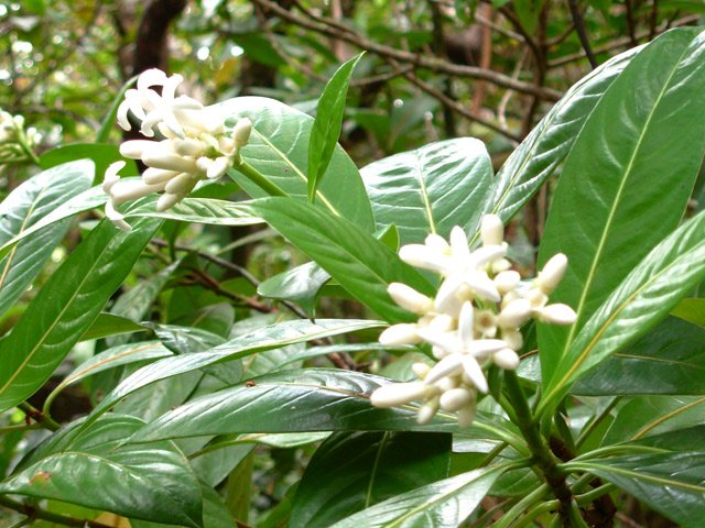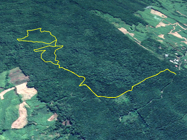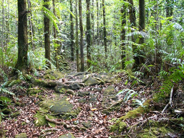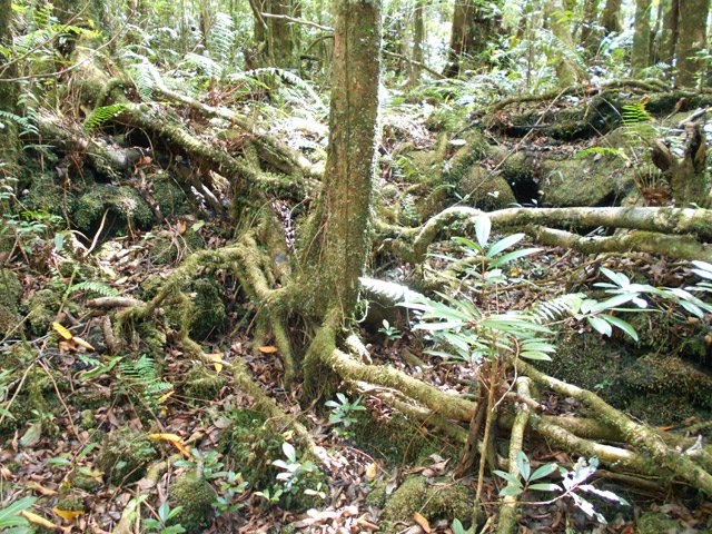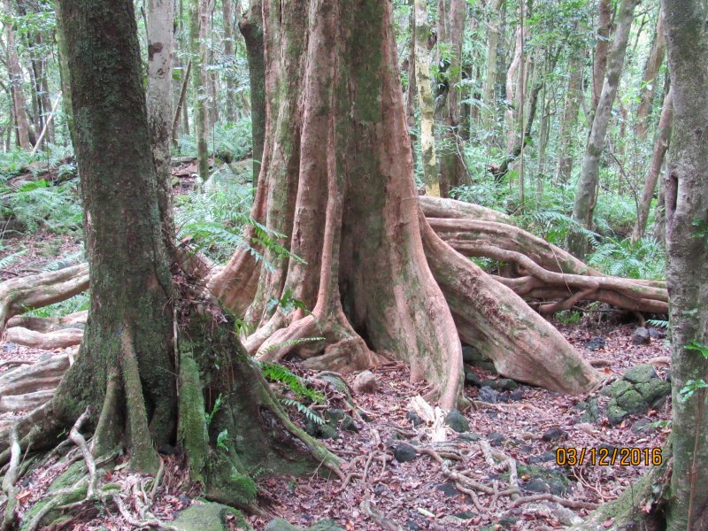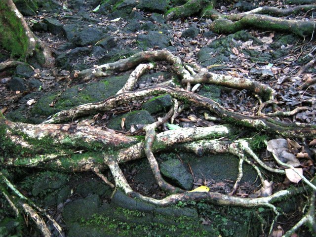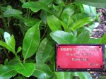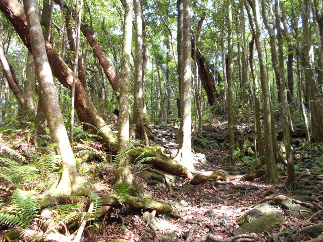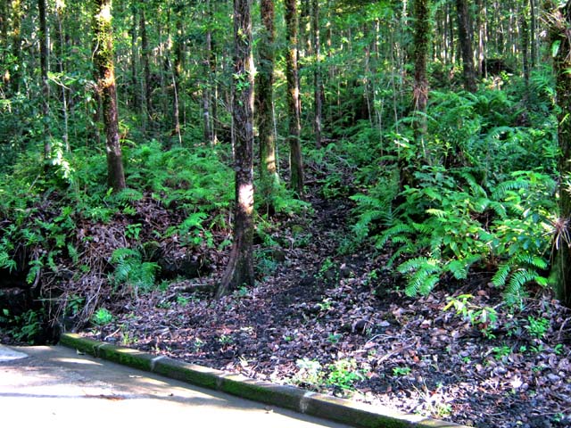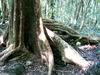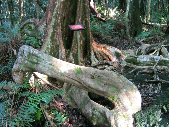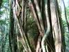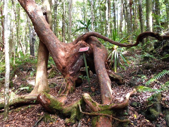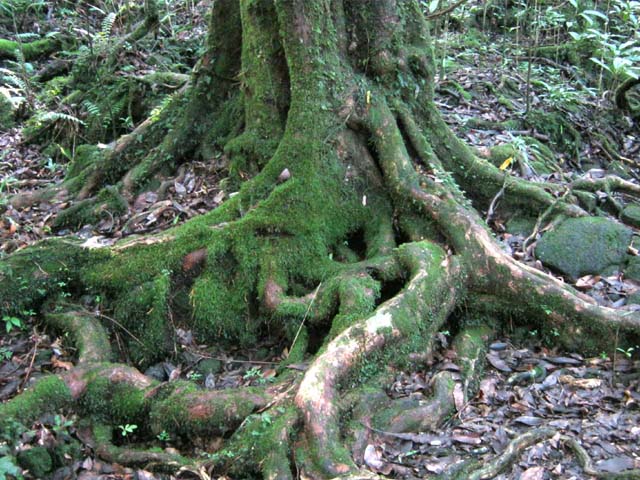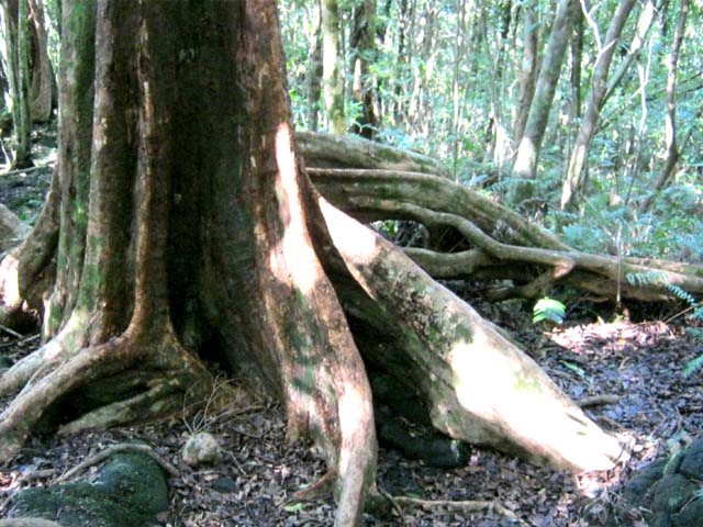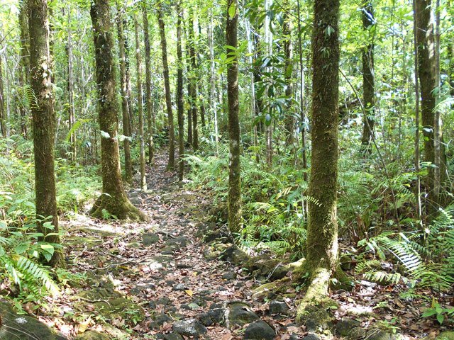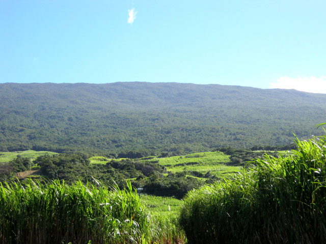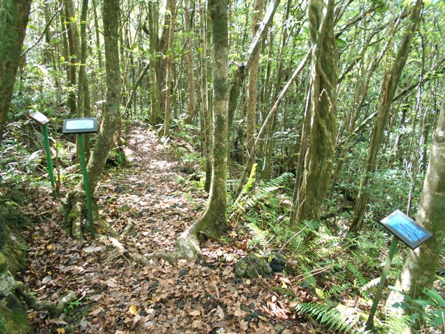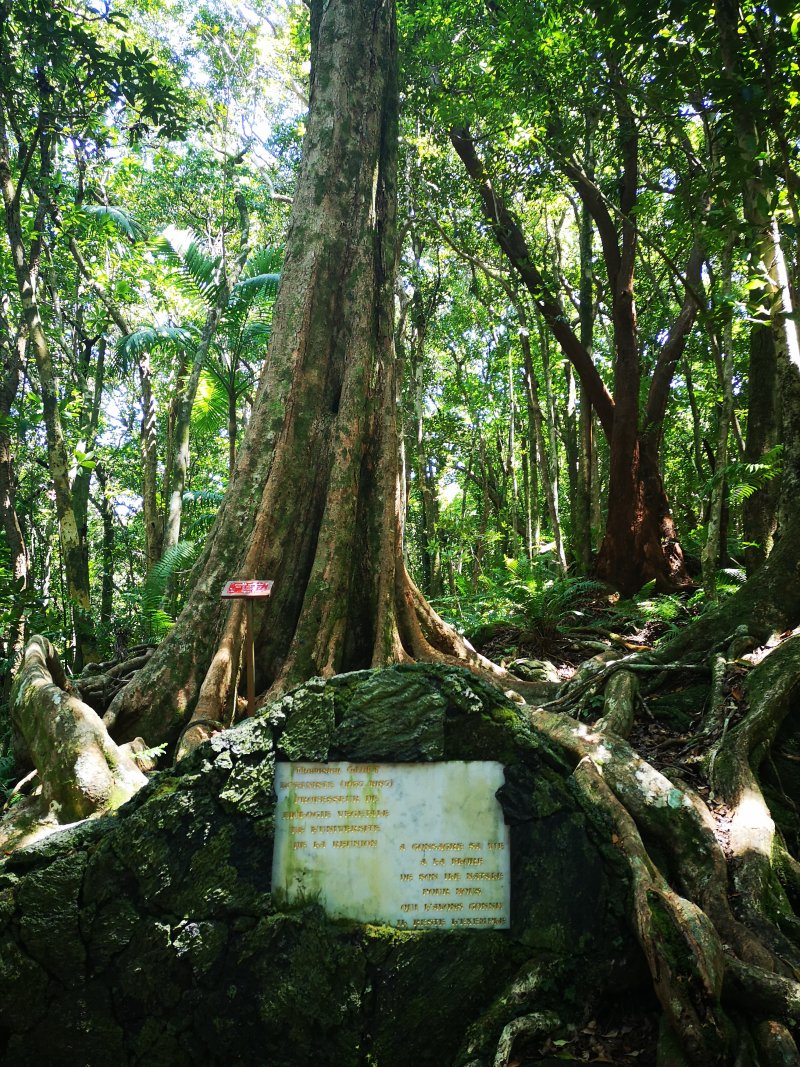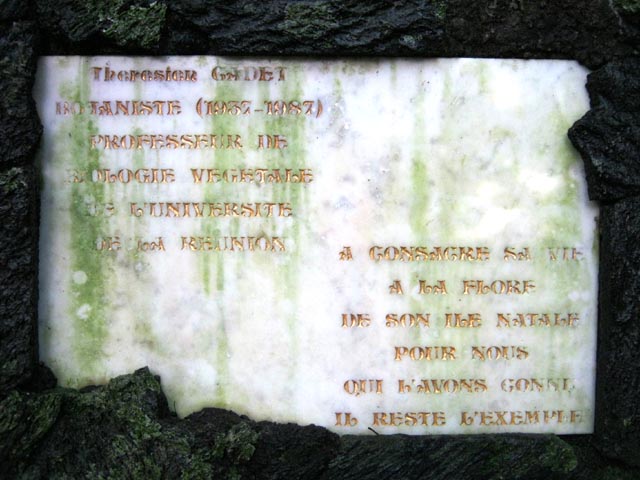 La randonnée débute ici sur le Chemin de Ceinture pour rallonger un peu ce circuit trop court pour organiser spécialement une sortie. Il est même conseillé de partir du Souffleur d'Arbonne par le sentier, d'effectuer la boucle et le retour par la route et de s'arrêter au jardin des Parfums et des Epices pour compléter les connaissances botaniques. Depuis les cannes cultivées jusqu'à 300 mètres d'altitude, on a une belle vue sur la Forêt de Mare longue (Photo 1). Après avoir roulé 2000 m sur la route et passé le croisement du Chemin de Ceinture, stationner près du départ du sentier. Il est facile à repérer sur la gauche un peu après le croisement. Il part en pente douce sous les bois de couleurs dont beaucoup de grands nattes (Photo 2). Comme toute la forêt qui couvre cette région, le sol est le plus souvent constitué de vieilles plaques de basaltes moussues ou de pierres parfois glissantes (Photo 3). Après deux tronçons de route forestière et trois de sentier, on parvient au début du sentier botanique matérialisé par un grand panneau de l'ONF (Photo 4). Tout près d'un arbre énorme aux racines multiples, un modeste monument basaltique couvert de mousse rend hommage à Thérésien Cadet, botaniste connu dans l'île (Photo 5). La visite botanique peut commencer. Elle s'effectue au gré de l'humeur et surtout de la lumière qui permet de mieux repérer les essences rencontrées. Le cheminement s'effectue souvent à l'ombre des hautes futaies. Les pancartes sont de couleurs différentes en fonction du tronçon parcouru. Rouge sur le GR, jaune, blanches ou bleues ailleurs (Photo 6). Tous les sentiers se ressemblent, couverts de pierres et de feuilles (Photo 7). On remarque le travail soigné à l'époque pour la création de ce sentier assez fréquenté (Photo 10). Les pancartes sont bien situées par rapport à l'arbre à observer (Photo 13). Le sentier serpente de manière à ne pas manquer certains spécimens aux racines remarquables (Photo 16 et 18). Inutile d'avoir une carte ou un GPS car le circuit est facile à suivre. Attention cependant pour la boucle le plus haute car elle emprunte une partie de route forestière.