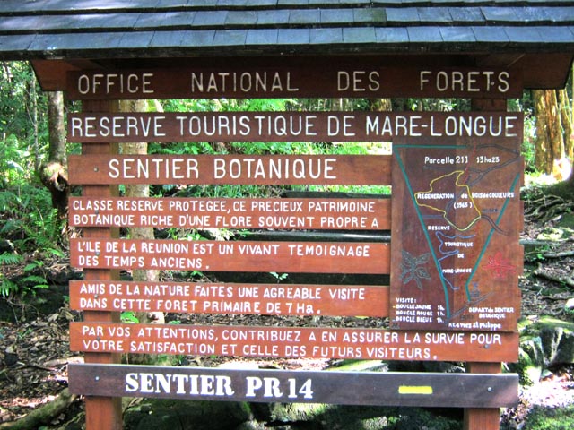 Ce petit écart du GRR2 qui monte de Mare Longue au Gîte de Basse Vallée permet de se renseigner un peu sur les arbres, endémiques ou non, qui peuplent nos forêts humides des bas. Les pancartes sont nombreuses, en bon état et souvent redondantes. Cette redondance est nécessaire car on ne peut du premier coup d'œil reconnaitre une essence, uniquement à son tronc car les feuilles sont souvent très haut, vers la lumière. Beaucoup de visiteurs partent du kiosque et des parkings au départ du sentier botanique. Pour rallonger un peu, cette fiche propose un départ à 100 mètres d'altitude pour une "prise en main" de la forêt. Cela peut être un jeu que de deviner les essences puis de vérifier plus haut si la détermination était correcte.