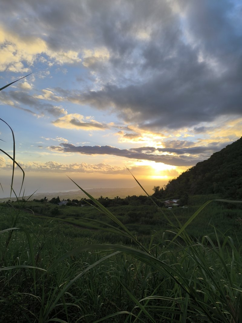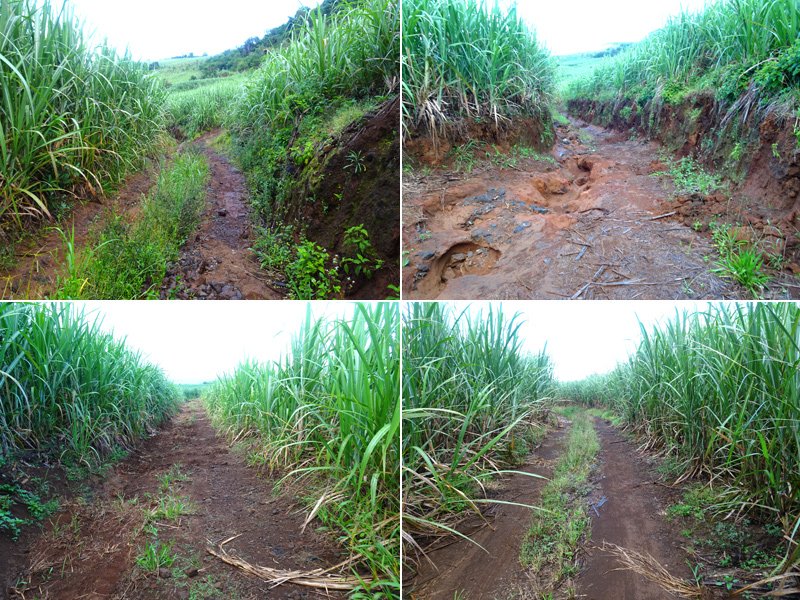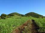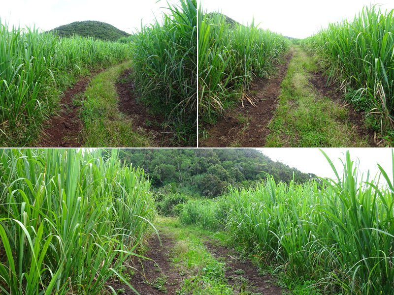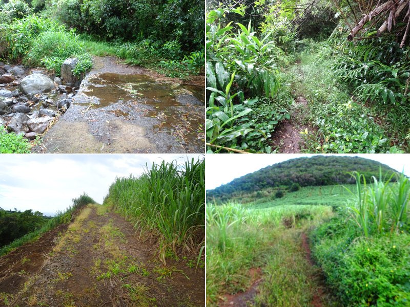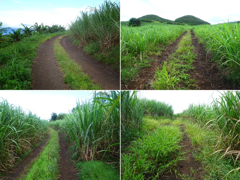 Le tour du piton, facultatif et souvent boudé en raison de la route, ne présente aucune difficulté, s'effectue sur des routes goudronnées, bétonnées ou des pistes de champs de canne pour faire le tour complet du Piton de Mont-Vert. Rejoindre le village par l'allée Piton de Mont-Vert empruntée en véhicule puis bifurquer à droite sur le Chemin du Cimetière. La circulation est faible et l'on peut profiter des magnifiques vues sur les principaux pitons de l'île (Photo 21). Comme la route contourne au plus près le piton, on peut évaluer à souhait le chemin parcouru en atteignant le sommet (Photo 22). Délaisser la première route pour partir à droite sur le Chemin Terrain Isautier. Franchir la Ravine de l'Anse, passer quelques maisons en profitant à nouveau de nouvelles vues sur le piton (Photo 23). Tourner à droite sur l'Allée des Calumets que l'on termine par une forte descente en lacets près d'une grande case bordée de hauts bambous habités parfois par les tisserins (Photo 24). Franchir le petit gué de la Ravine de l'Anse souvent à sec, emprunter une piste sous le couvert des poivriers et poursuivre en longeant les premières cannes sur une large piste facile à suivre (Photo 25). On ne marche jamais loin du piton qu'on garde sur la droite en évitant d'emprunter les petites pistes partant ça et là (Photo 26). Cette piste, toujours aussi propre se rapproche des nouvelles habitations avec de belles vues sur l'océan (Photo 27). Elle semble s'éloigner du piton mais pas d'inquiétude, elle tourne bientôt vers la droite et finit au Chemin Roger Lauret. Emprunter cette route sur une très courte distance jusqu'à la fin de l'agglomération puis poursuivre sur une nouvelle piste d'où l'on distingue très bien l'ensemble du piton (Photo 28). Remonter la légère pente, délaisser la piste menant à une habitation et prendre vers la gauche pour retrouver l'Allée Piton de Mont-Vert. Rejoindre le parking à droite, fin de cette deuxième boucle.