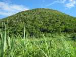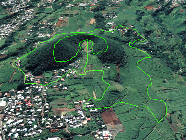 En roulant entre Saint-Pierre et Grand Bois sur la route nationale 2, on voit très bien vers le Nord ce piton qui semble n'être qu'une grosse colline verdoyante. A y regarder de plus près, il s'agit de l'immense gueule d'un cratère vieux de plus de 30 000 ans qui a façonné à son époque une partie du sud de l'Ile. La colline est la tête d'une énorme virgule (voir à gauche la photo satellite) qui se prolonge sur un bon kilomètre de long, entourant ce qui fut sans doute le fond d'un cratère occupé désormais par les champs de canne à sucre. En faire le tour constitue une randonnée banale empruntant une grande partie de routes goudronnées, en général boudées par les randonneurs. Se rendre au sommet en représente une autre plus sportive mais trop courte malgré la belle boucle de 2 km aménagée par diverses associations. L'idéal est donc de combiner les deux pour passer plus de deux heures dans cette zone de l'île. Un parking est aménagé sur l'allée du Piton de Mont-Vert à une centaine de mètres du début de la montée au piton. Se garer au nouveau parking aménagé avant le fond du cirque, rejoindre et grimper le Piton de Mont-Vert puis revenir au point de départ pour effectuer ensuite le tour complet. Le contraste est grand entre les deux boucles ; l'une se fait sur un étroit sentier parfois assez pentu sous le couvert des bois de la forêt semi-sèche, l'autre sur route et de nombreuses pistes à travers les cannes à sucre. A noter la présence d'une minuscule orchidée endémique de ce piton (Oeceoclades monophylla), donc très rare et fragile. Il est fortement déconseillé de quitter les sentiers afin de ne pas la piétiner.