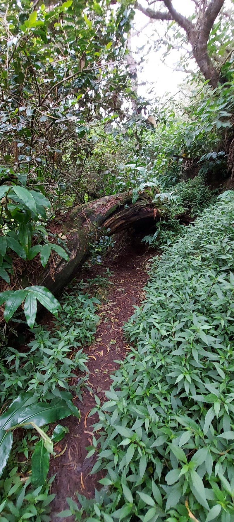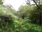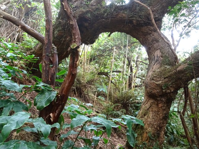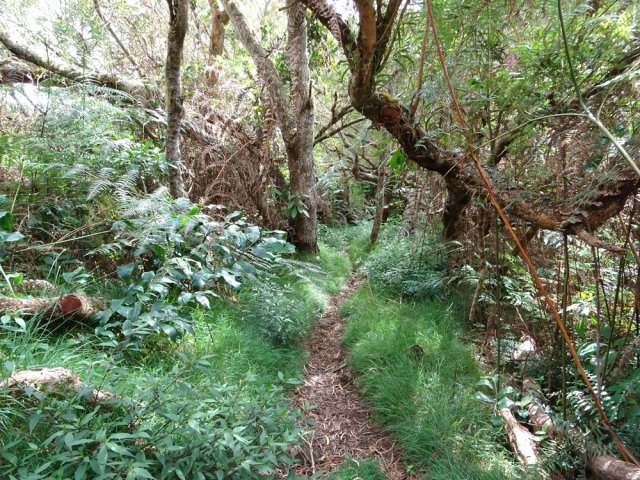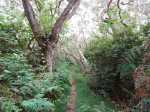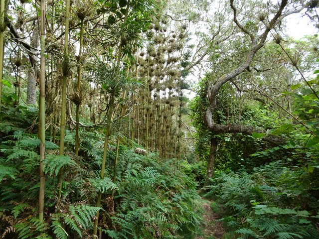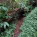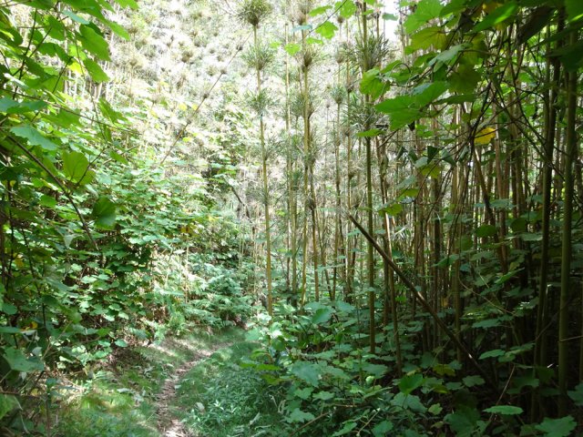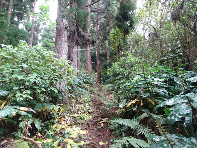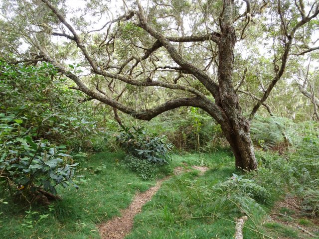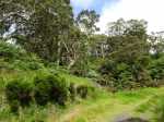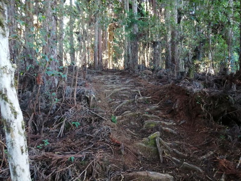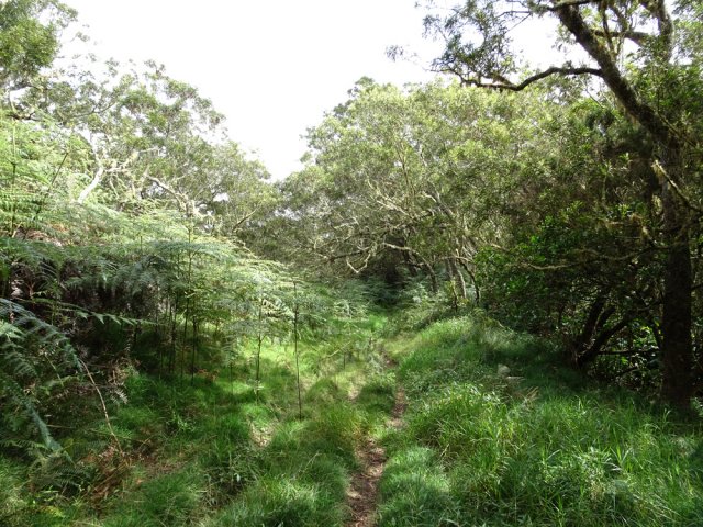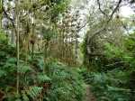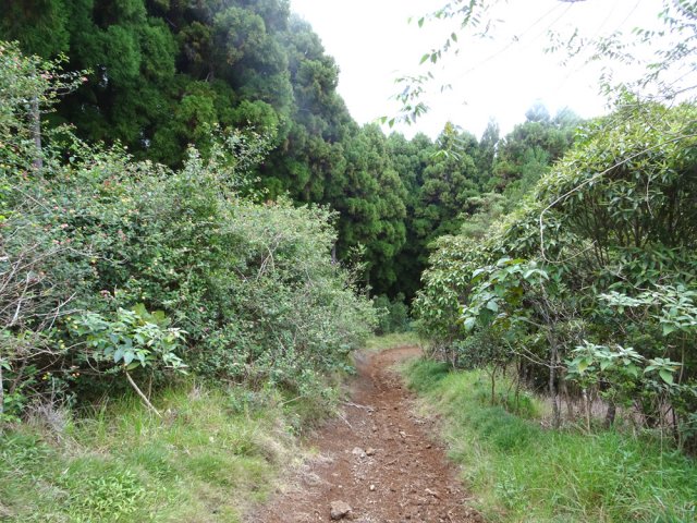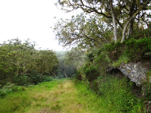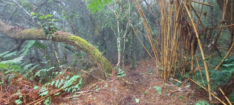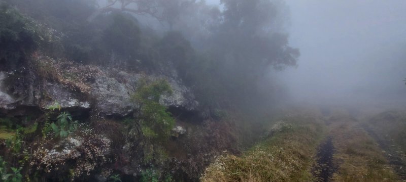 La randonnée débute à une aire de pique-nique avant la fin de la route mais peut également commencer au rond-point ou au début de la piste du Bois de Nèfles. Prendre la route en fonction et regagner le début du sentier Françoise Francia (voir carte). Le sentier est tout d'abord taillé à la machette dans les longues vignes marronnes qui caressent le visage de ses épines. Heureusement, ce tunnel végétal dure peu. Le sentier monte en ligne presque droite en lisière de forêt de grands cryptomerias aux racines apparentes et souvent glissantes par temps humide (Photo 1). Les longoses cachent à peu près tout le sous-bois et il est impossible de marcher entre les arbres (Photo 2). La montée est régulière, parfois assez forte et s'assagit assez peu souvent (Photo 3). Sur la droite, ce sont quelques bois de couleurs qui tentent de survivre au milieu des autres pestes classiques de cette région fraîche et humide, dont principalement de la vigne marronne (Photo 4). Les cryptomerias cessent un moment mais reviennent tout aussi vite. Ils disparaissent enfin à l'approche du sentier Cambour et les bois de couleurs les remplacent agréablement. Au prochain croisement, prendre à droite le beaucoup plus agréable sentier Cambour. Malgré les longoses dont on ne se débarrassera pas tout au long de la boucle, les tamarins, tous aussi beaux les uns que les autres bordent le sentier, debout, couchés ou seulement penchés (Photo 6). On a même la chance parfois de marcher sur de l'herbe fraiche (Photo 7). Ce superbe sentier ne dure hélas que très peu de temps. On arrive en quelques minutes dans un lacet de la Route Forestière Oméga (Photo 8). Partir vers la gauche et entamer les trois kilomètres de montée. Le paysage change peu mais la large piste permet de mieux apprécier les abords. Les tamarins sont les plus nombreux de chaque côté (Photo 10). L'herbe qui recouvre la piste n'est pas toujours agréable après une pluie mais, à l'inverse, c'est un plaisir avec un soleil visible ou caché par la brume (Photo 11). Il est fréquent de rencontrer des troupeaux ou des bêtes esseulées broutant sur la piste. Après un kilomètre, les fougères envahissent de plus en plus les abords (Photo 12). Sur la droite, le sentier déjà envahi par les fougères qui représentait la ligne des Seize Cents, est devenu totalement inextricable (Photo 13). Il permettait, sur la première mouture de cette fiche, de regagner le sentier Louis Emile sans remonter le très long dernier lacet de la RF Oméga. C'est donc parti pour deux longs kilomètres de piste herbeuse, heureusement très reposante, tant par la pente que par les paysages alentour. Ces centaines de tamarins, tous debout contrairement à ceux dans les forêts plus au nord, sont un régal pour les yeux (Photo 14). On passe à moins de 200 mètres du rempart de Mafate sans le voir en raison justement de tous ces tamarins. En arrivant à 1750 m, guetter sur la droite de la piste le départ du sentier Louis Emile. On le remarque au triangle et ses deux petits ronds chers aux vététistes. Comme souvent répété sur ce site qui n'encourage jamais à transgresser une règle : tant qu'on continuera à voir des traces de pneus sur les sentiers de randonnée, aucune honte à descendre l'un d'entre eux. En revanche, on considère qu'ils sont toujours prioritaires. Dès qu'on entend le bruit du vélo malmené par la vitesse et les sauts de plusieurs mètres, on se met bien sagement sur le bord en attendant que ces sportifs hors du commun aient terminé leurs exploits. Le sentier, comme les premières mètres du sentier Françoise Francia, ne paye pas de mine avec ses fougères de tous côtés (Photo 15). En quelques mètres, elles disparaissent et la marche s'effectue sur un sentier de très bonne qualité, un peu étroit mais propre (Photo 16). Il s'élargit graduellement et les premières traces de pneus confirment qu'on est bien chez les vététistes (Photo 17). Les tamarins deviennent de moins en moins nombreux (Photo 18). La vigne prend doucement possession des abords (Photo 19). On va à la rencontre de ce magnifique bambou endémique, le calumet, qui lui également se fera vite dévorer par la vigne (Photo 20). Ne pas manquer, au passage, ce tamarin tombé au sol et dont une grosse branche a pris racine au sol, créant une très originale arche végétale (Photo 21). On n'en quitte pas pour autant les calumets qui poussent parmi les derniers tamarins (Photo 22). Avant l'arrivée des premiers cryptomerias, un autre tamarin plus que centenaire se penche sur le flanc en bordure de sentier (Photo 23). Puis les premiers conifères se présentent sur des pentes parfois très fortes où il faut prendre garde de ne pas glisser (Photo 24). On retrouve également les racines mais la traversée s'effectue sans problème. Plus bas, le sentier se transforme petit à petit par une piste propre et large qui comporte également de belles pentes parfois glissantes. On parvient à la Route des Cryptomerias dans une jungle de vigne marronne (Photo 27). La partie la moins agréable de la boucle commence en longeant cette route désormais tellement envahie de pestes dont les vignes ont dévoré 30% de la bande de roulement.
