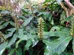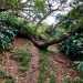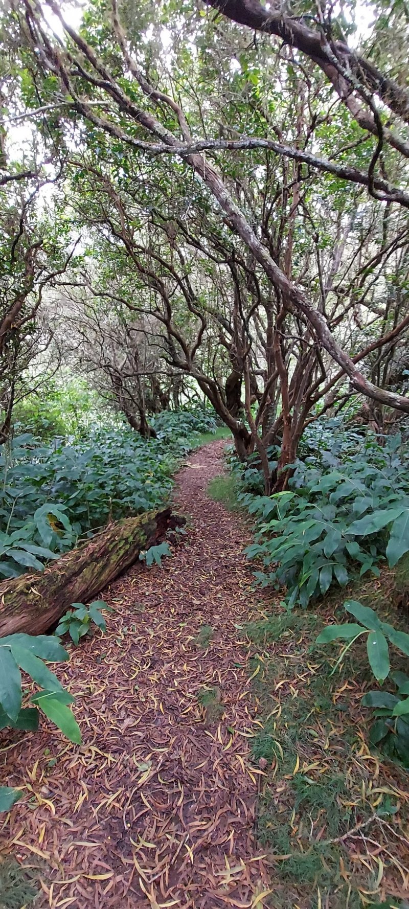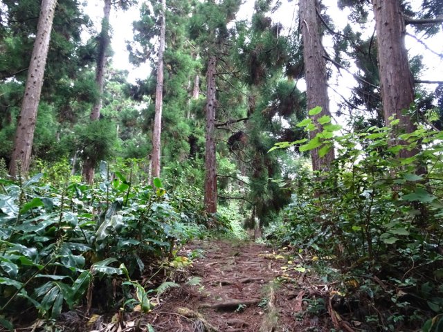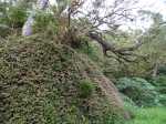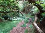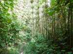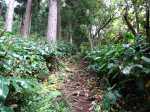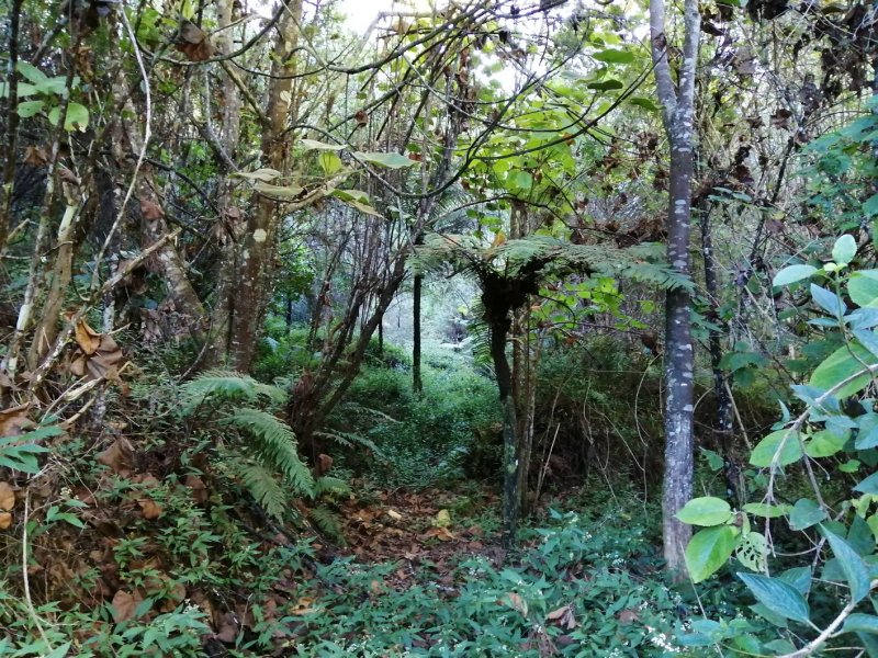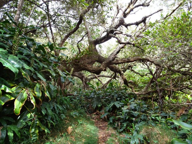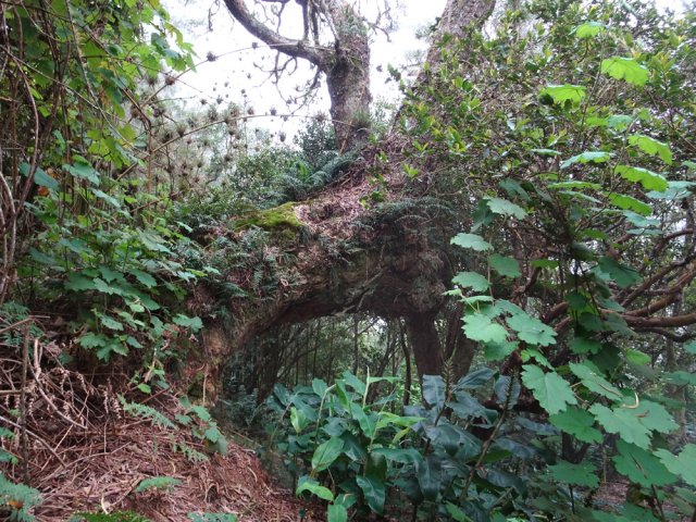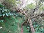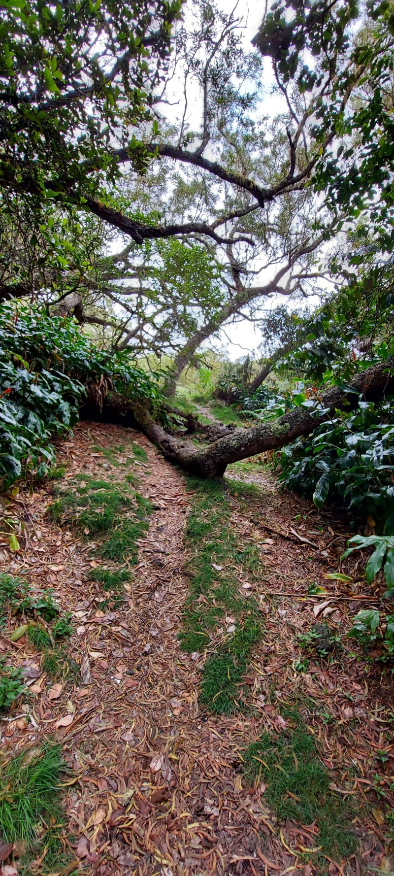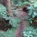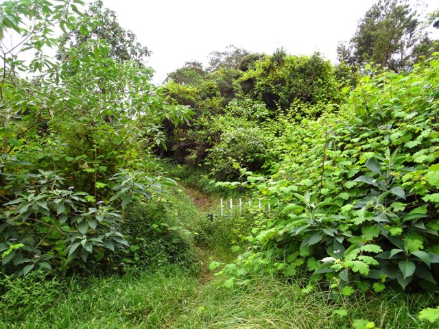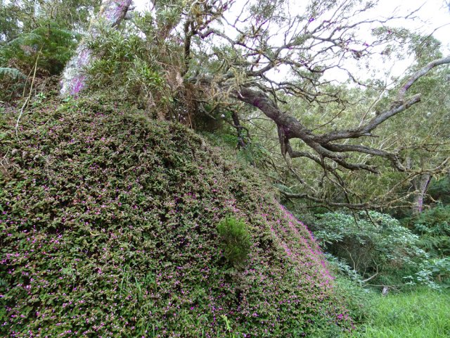La randonnée débute à une aire de pique-nique avant la fin de la route mais peut également commencer au rond-point ou au début de la piste du Bois de Nèfles. Prendre la route en fonction et regagner le début du sentier Françoise Francia (voir carte). Le sentier est tout d'abord taillé à la machette dans les longues vignes marronnes qui caressent le visage de ses épines. Heureusement, ce tunnel végétal dure peu. Le sentier monte en ligne presque droite en lisière de forêt de grands cryptomerias aux racines apparentes et souvent glissantes par temps humide (Photo 1). Les longoses cachent à peu près tout le sous-bois et il est impossible de marcher entre les arbres (Photo 2). La montée est régulière, parfois assez forte et s'assagit assez peu souvent (Photo 3). Sur la droite, ce sont quelques bois de couleurs qui tentent de survivre au milieu des autres pestes classiques de cette région fraîche et humide, dont principalement de la vigne marronne (Photo 4). Les cryptomerias cessent un moment mais reviennent tout aussi vite. Ils disparaissent enfin à l'approche du sentier Cambour et les bois de couleurs les remplacent agréablement. Au prochain croisement, prendre à droite le beaucoup plus agréable sentier Cambour. Malgré les longoses dont on ne se débarrassera pas tout au long de la boucle, les tamarins, tous aussi beaux les uns que les autres bordent le sentier, debout, couchés ou seulement penchés (Photo 6). On a même la chance parfois de marcher sur de l'herbe fraiche (Photo 7). Ce superbe sentier ne dure hélas que très peu de temps. On arrive en quelques minutes dans un lacet de la Route Forestière Oméga (Photo 8). Partir vers la gauche et entamer les trois kilomètres de montée. Le paysage change peu mais la large piste permet de mieux apprécier les abords. Les tamarins sont les plus nombreux de chaque côté (Photo 10). L'herbe qui recouvre la piste n'est pas toujours agréable après une pluie mais, à l'inverse, c'est un plaisir avec un soleil visible ou caché par la brume (Photo 11). Il est fréquent de rencontrer des troupeaux ou des bêtes esseulées broutant sur la piste. Après un kilomètre, les fougères envahissent de plus en plus les abords (Photo 12). Sur la droite, le sentier déjà envahi par les fougères qui représentait la ligne des Seize Cents, est devenu totalement inextricable (Photo 13). Il permettait, sur la première mouture de cette fiche, de regagner le sentier Louis Emile sans remonter le très long dernier lacet de la RF Oméga. C'est donc parti pour deux longs kilomètres de piste herbeuse, heureusement très reposante, tant par la pente que par les paysages alentour. Ces centaines de tamarins, tous debout contrairement à ceux dans les forêts plus au nord, sont un régal pour les yeux (Photo 14). On passe à moins de 200 mètres du rempart de Mafate sans le voir en raison justement de tous ces tamarins. En arrivant à 1750 m, guetter sur la droite de la piste le départ du sentier Louis Emile. On le remarque au triangle et ses deux petits ronds chers aux vététistes. Comme souvent répété sur ce site qui n'encourage jamais à transgresser une règle : tant qu'on continuera à voir des traces de pneus sur les sentiers de randonnée, aucune honte à descendre l'un d'entre eux. En revanche, on considère qu'ils sont toujours prioritaires. Dès qu'on entend le bruit du vélo malmené par la vitesse et les sauts de plusieurs mètres, on se met bien sagement sur le bord en attendant que ces sportifs hors du commun aient terminé leurs exploits. Le sentier, comme les premières mètres du sentier Françoise Francia, ne paye pas de mine avec ses fougères de tous côtés (Photo 15). En quelques mètres, elles disparaissent et la marche s'effectue sur un sentier de très bonne qualité, un peu étroit mais propre (Photo 16). Il s'élargit graduellement et les premières traces de pneus confirment qu'on est bien chez les vététistes (Photo 17). Les tamarins deviennent de moins en moins nombreux (Photo 18). La vigne prend doucement possession des abords (Photo 19). On va à la rencontre de ce magnifique bambou endémique, le calumet, qui lui également se fera vite dévorer par la vigne (Photo 20). Ne pas manquer, au passage, ce tamarin tombé au sol et dont une grosse branche a pris racine au sol, créant une très originale arche végétale (Photo 21). On n'en quitte pas pour autant les calumets qui poussent parmi les derniers tamarins (Photo 22). Avant l'arrivée des premiers cryptomerias, un autre tamarin plus que centenaire se penche sur le flanc en bordure de sentier (Photo 23). Puis les premiers conifères se présentent sur des pentes parfois très fortes où il faut prendre garde de ne pas glisser (Photo 24). On retrouve également les racines mais la traversée s'effectue sans problème. Plus bas, le sentier se transforme petit à petit par une piste propre et large qui comporte également de belles pentes parfois glissantes. On parvient à la Route des Cryptomerias dans une jungle de vigne marronne (Photo 27). La partie la moins agréable de la boucle commence en longeant cette route désormais tellement envahie de pestes dont les vignes ont dévoré 30% de la bande de roulement.