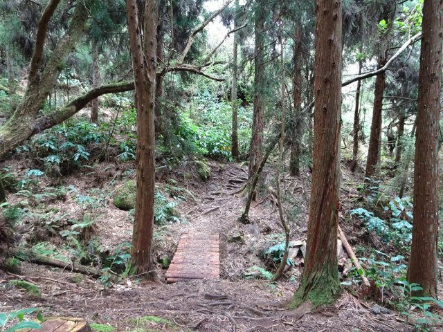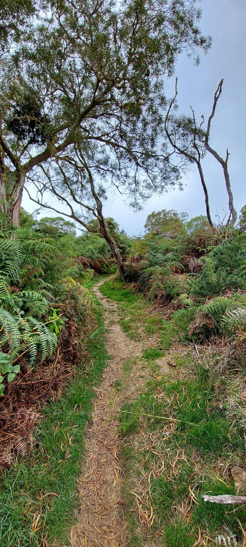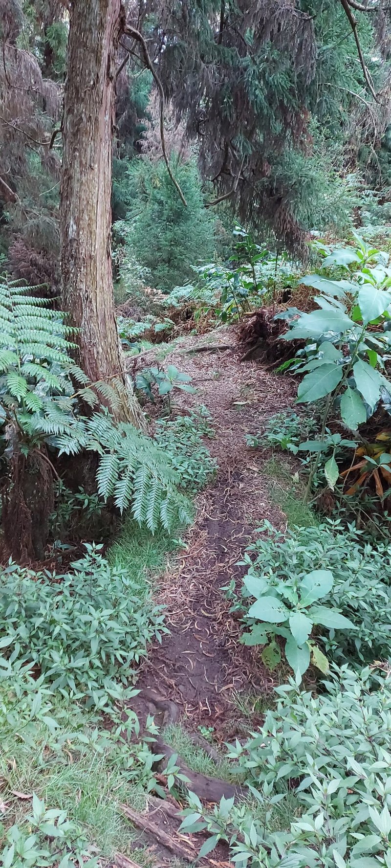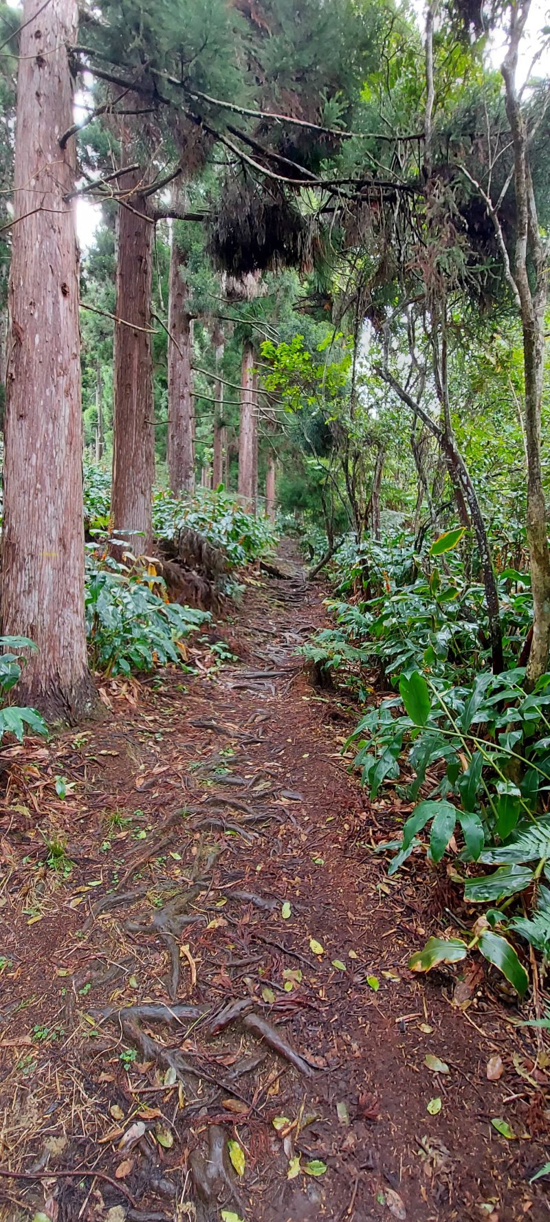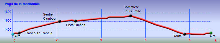Voici une sortie d'une dizaine de kilomètres, sans grande difficulté qui permet de traverser une belle forêt de cryptomerias, une autre de tamarins des Hauts parsemée de calumets, une zone d'élevage en suivant la longue piste Oméga. La montée du Sentier Françoise Francia s'effectue presque en ligne droite sans partie plate pour se reposer. Elle est suivie d'une portion presque plate de la Piste Forestière Oméga qui effectue de longs lacets dans les tamarins des Hauts. On attaque pour finir une belle descente par le sentier Louis Emile, réservée au vététistes. Lorsqu'on marche sur un circuit VTT, c'est le vélo qui est prioritaire ; quand on entend les bruits caractéristiques des bicyclettes lancées à toute vitesse, il ne faut que deux secondes pour se mettre sur le bort du sentier. La pente est forte et c'est un spectacle de les voir passer à des vitresses incroyables pour le terrain. La Sommière des Seize Cents qui permettait d'éviter plusieurs lacets de la piste est encombrée de végétation et impose d'emprunter ce nouveau circuit, plus long que sur une précédente fiche mais tout de même agréable le long d'une piste large et propre.