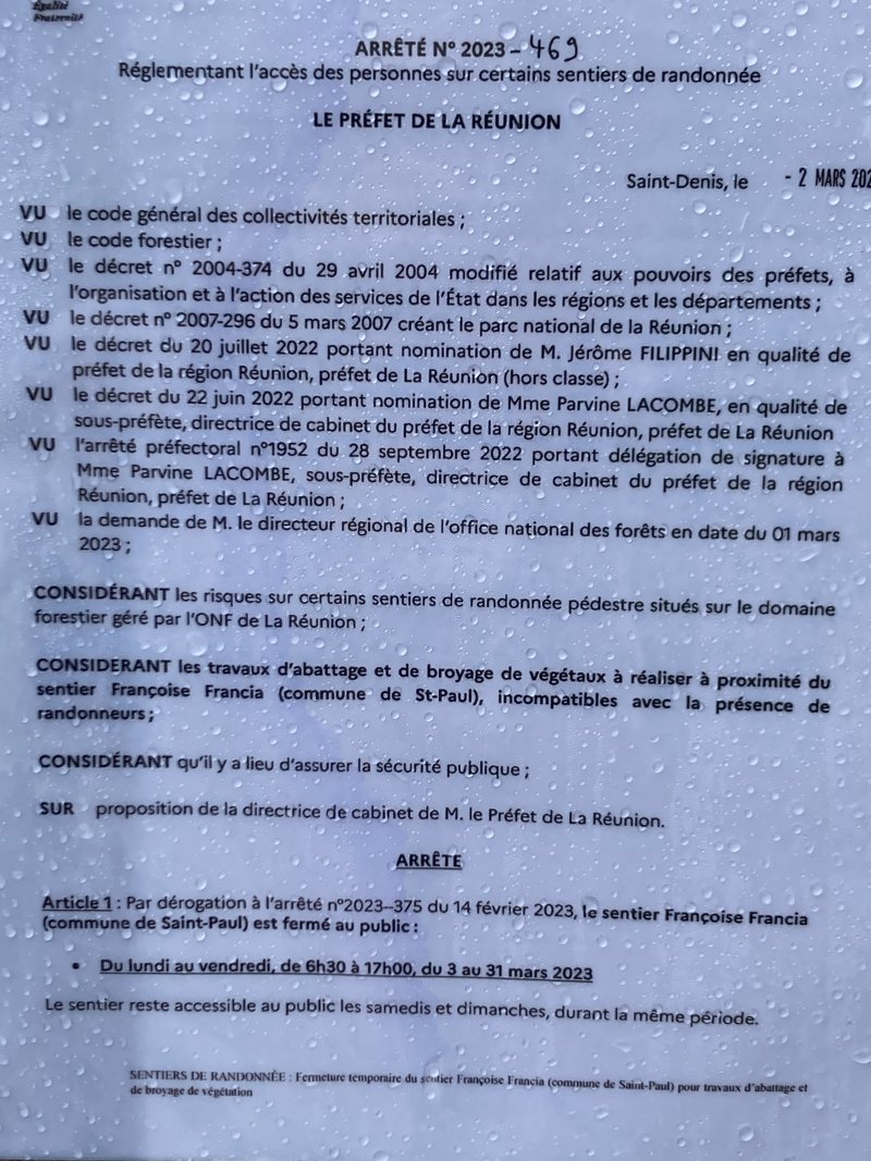 Se rendre à Saint-Paul puis à Saint-Gilles les Hauts et prendre la direction du Maïdo (nombreux panneaux) - Rouler jusqu'au centre équestre puis bifurquer à gauche un kilomètre plus loin pour prendre la Route Forestière des Cryptomerias - Suivre la route jusqu'à une petite aire de repos à quelques dizaines de mètres du départ du sentier Françoise Francia - Rejoindre le départ du sentier Françoise Francia et le suivre en montée jusqu'à la jonction du sentier de Cambour - Au croisement, tourner à droite et rejoindre la Piste Forestière Oméga - Longer la piste et effectuer deux grands lacets avant de trouver la Sommière Louis Emile - Tourner à droite et dévaler tout le sentier jusqu'à la Route Forestière des Cryptomerias - Prendre à droite sur la route puis retrouver le véhicule un peu plus loin.